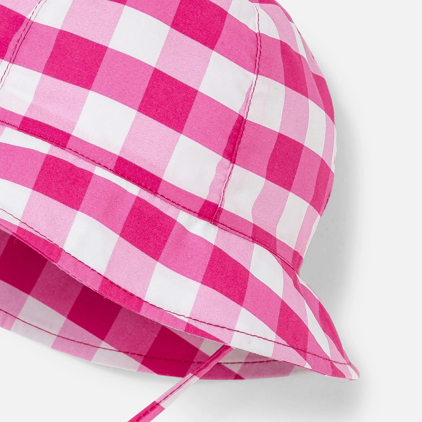 這款小女童帽採用超大格紋設計,非常適合夏季的粉紅色格紋布。棉質巴里紗襯裡,優雅而現代地給小寶寶舒適的遮陽性。