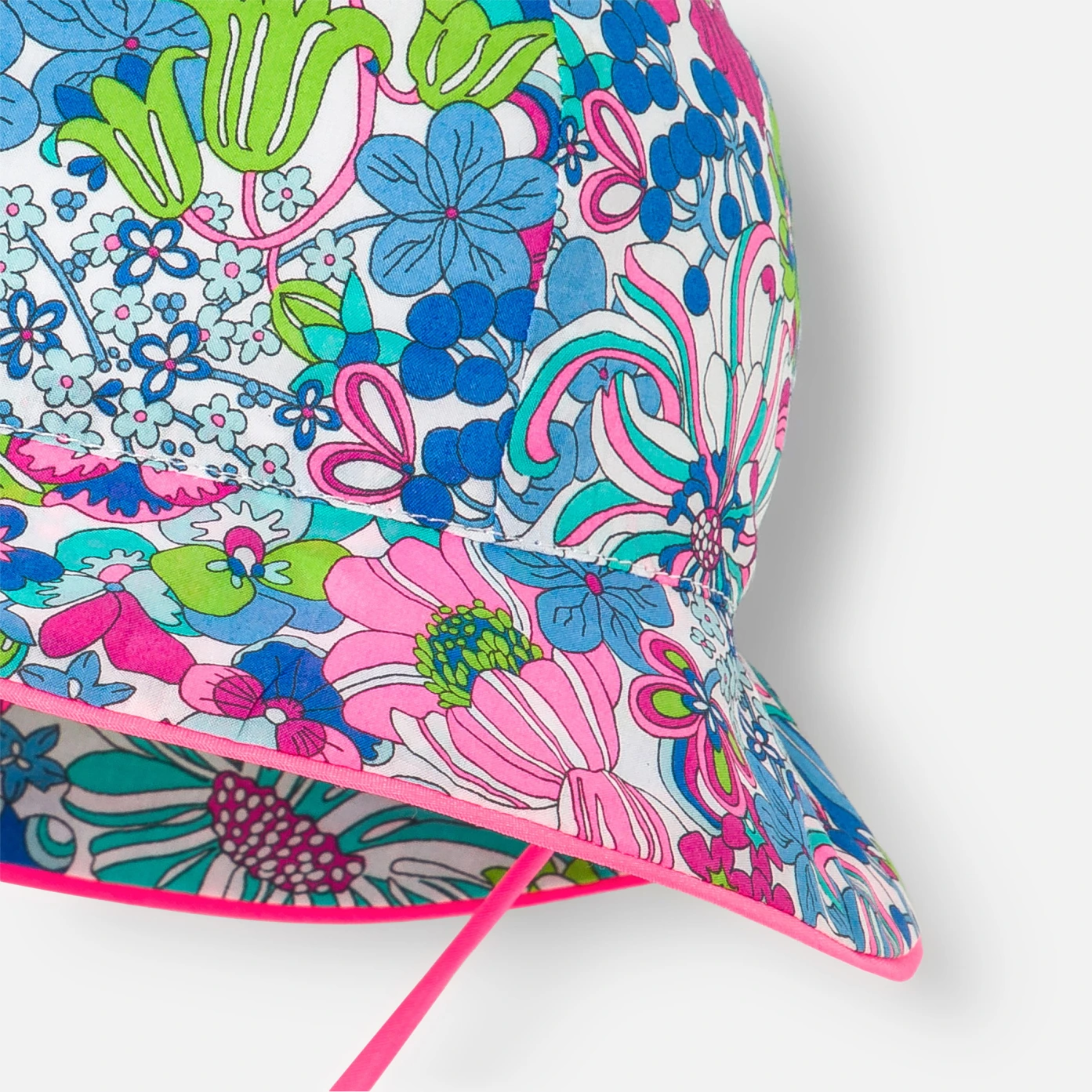 這款鐘形帽子採用Liberty花布製成,並以霓虹色的飾邊作為點綴,增添了現代感。這款帽子與服裝系列和泳衣相協調,非常適合隨著您的小女孩在城市和海灘間穿梭。