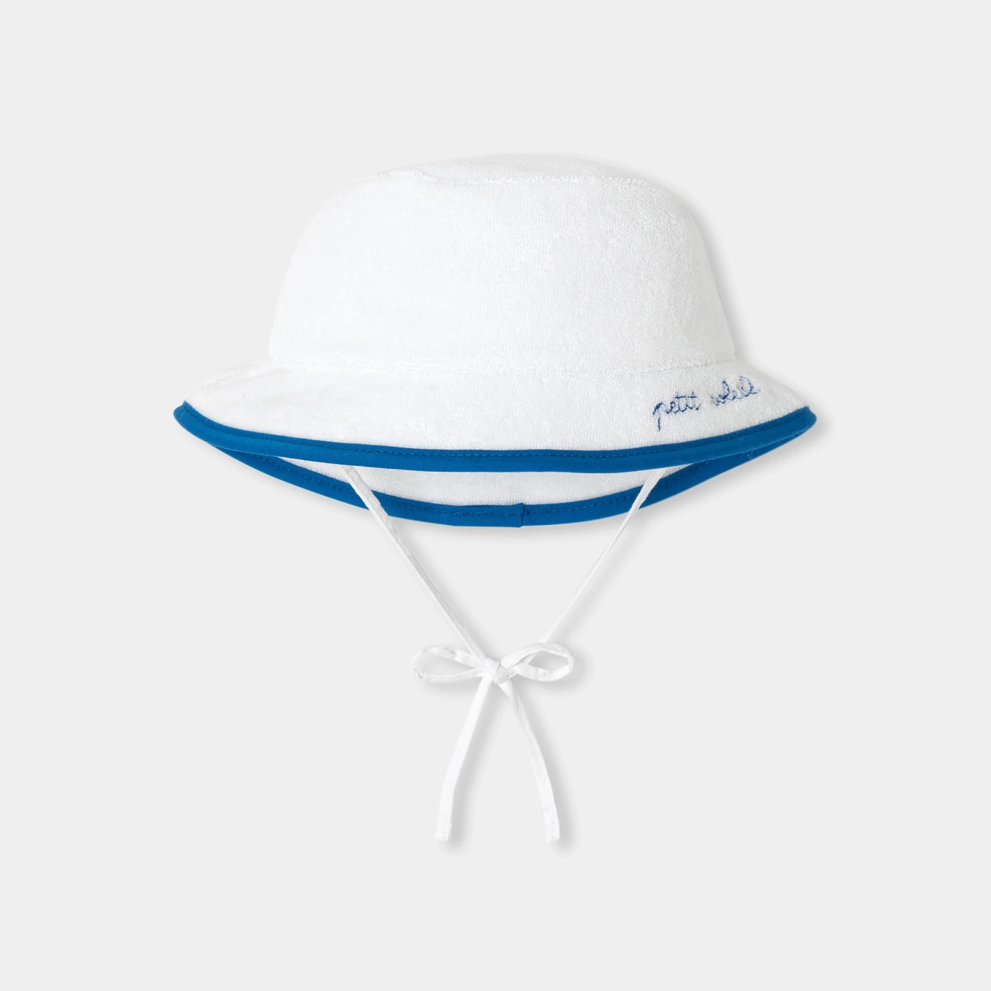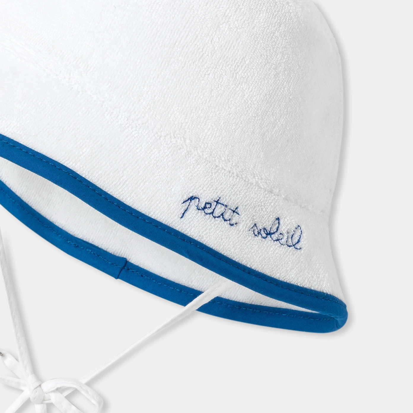 本季嬰兒漁夫帽採用柔軟舒適的毛巾布製成。以藍色滾邊點綴,側邊刺繡「petit soleil」字樣,這款極簡必備單品將陪伴嬰兒整個夏季。