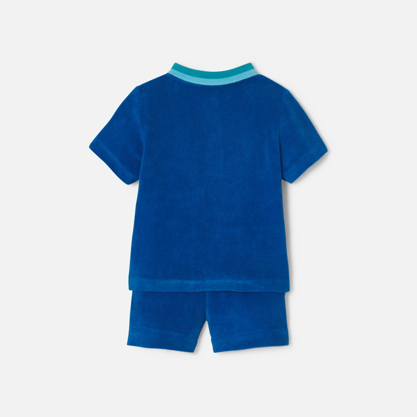 這款嬰兒男童套裝在使用柔軟透氣的毛圈布料。適合陽光明媚的日子,配有Polo衫和鬆緊腰短褲,讓寶寶在城市漫步或首次海灘遊玩時既舒適又優雅。