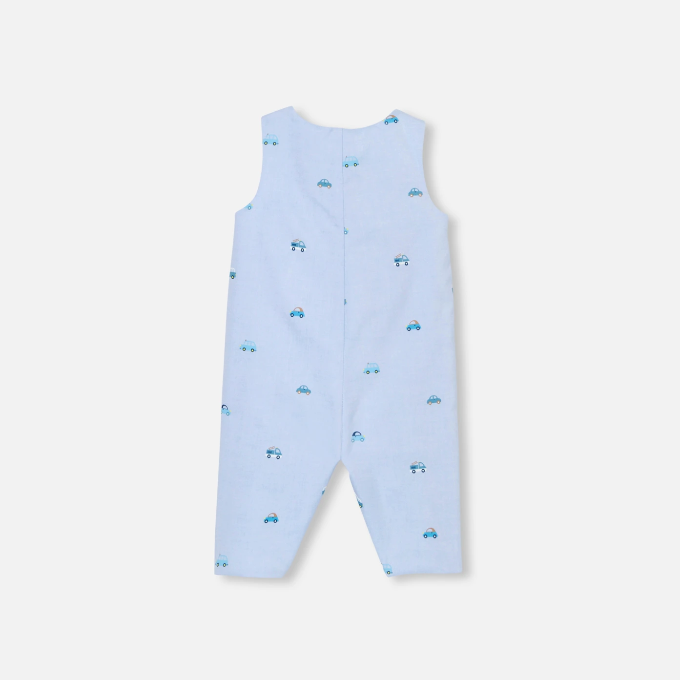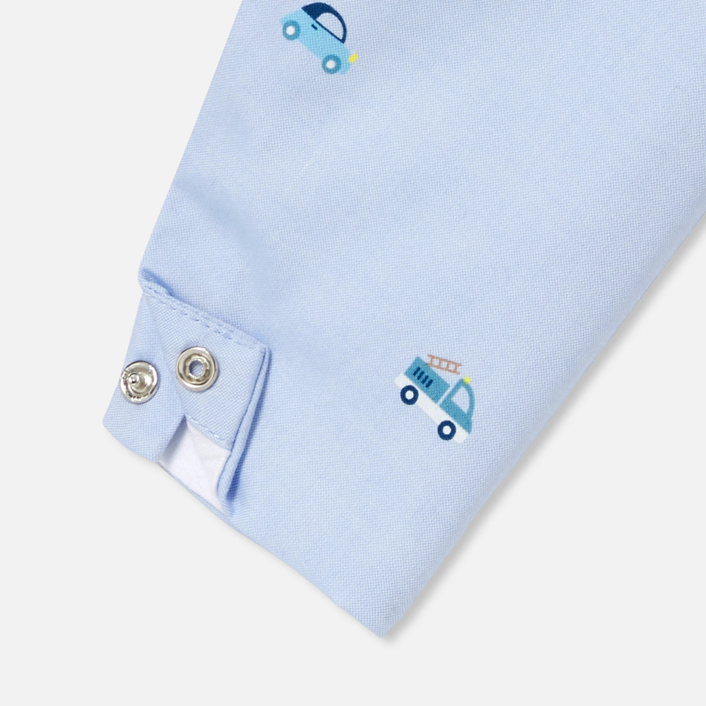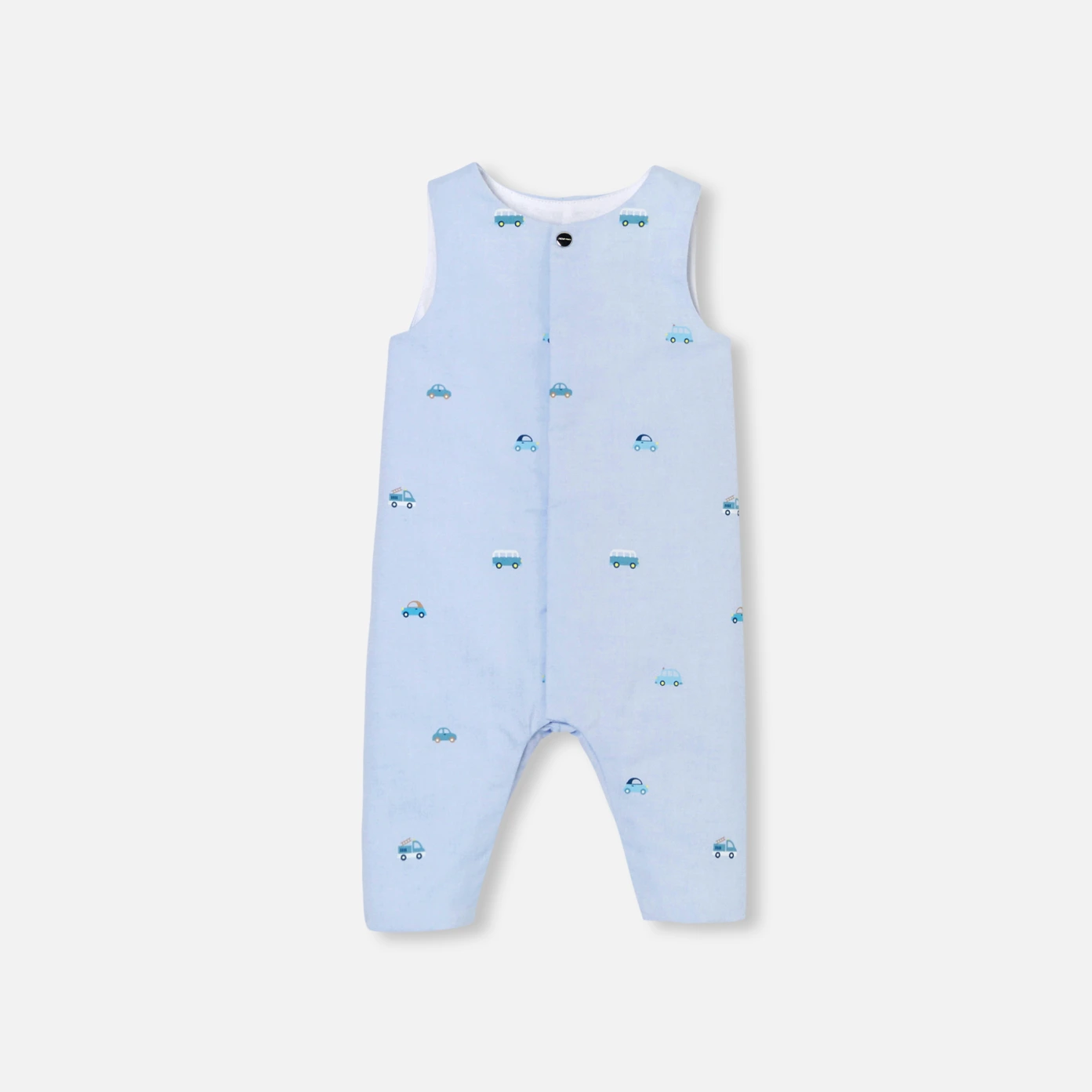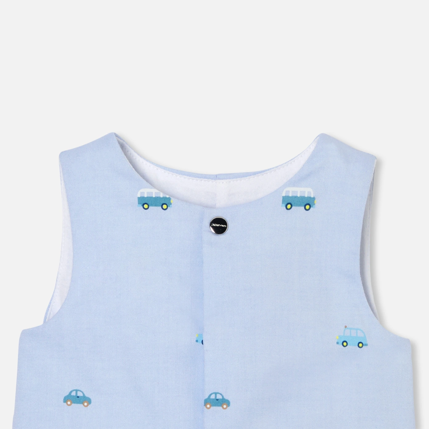 Jacadi設計了這款男嬰連身褲裝,採用印有汽車圖案的優雅牛津布製成,添加了針織襯裡和輕質填充物,讓寶寶倍感舒適。這款連身褲裝採用正面和胯部按釦設計,易於穿著,可與長袖連身衣和藍色開襟毛衣搭配,打造巴黎時尚造型。