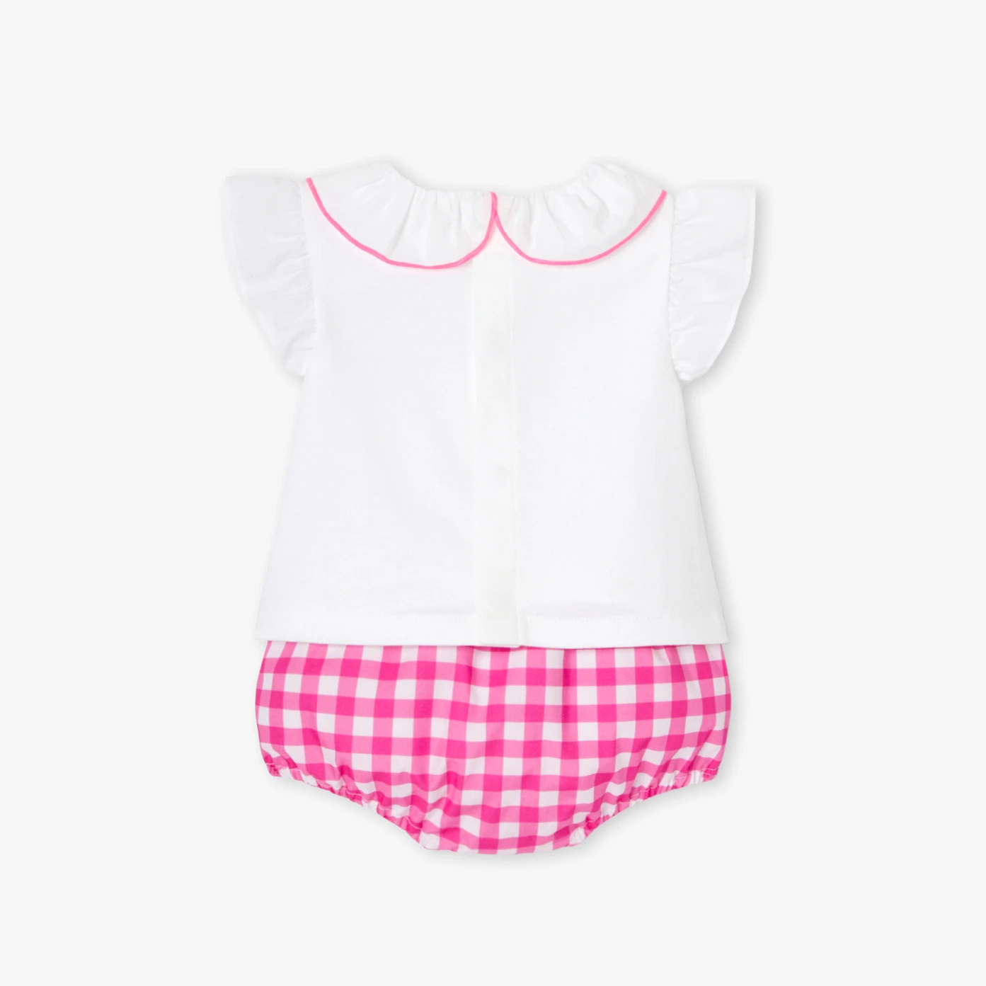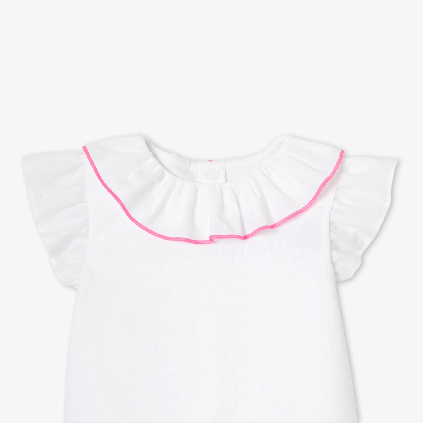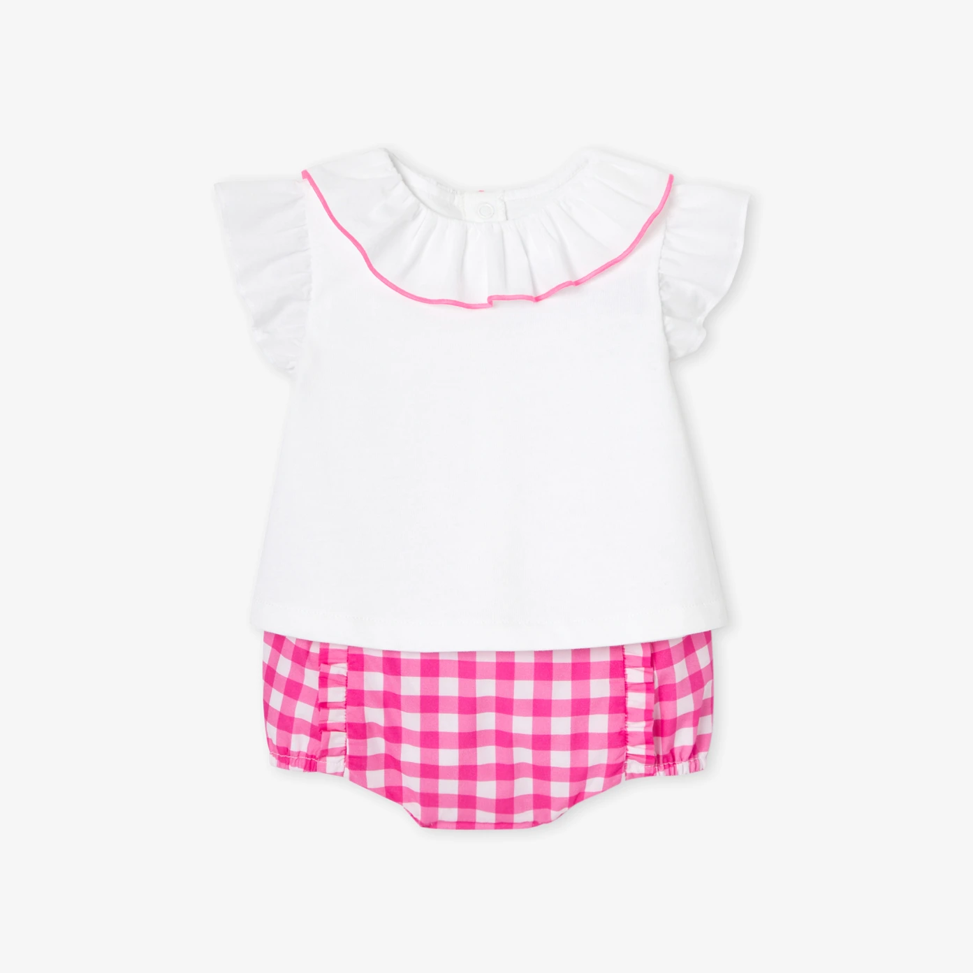 為女嬰打造首個夏季衣櫥,這款充滿優雅現代感的兩件式套裝是不二之選。上衣以棉質針織面料製成,飾有荷葉邊立領與袖口,展現柔美細節。搭配一件俏皮可愛的格紋棉質花苞褲,附有荷葉腰頭設計與內裡,整體造型清新又具特色,無論日常或外出皆適宜。
