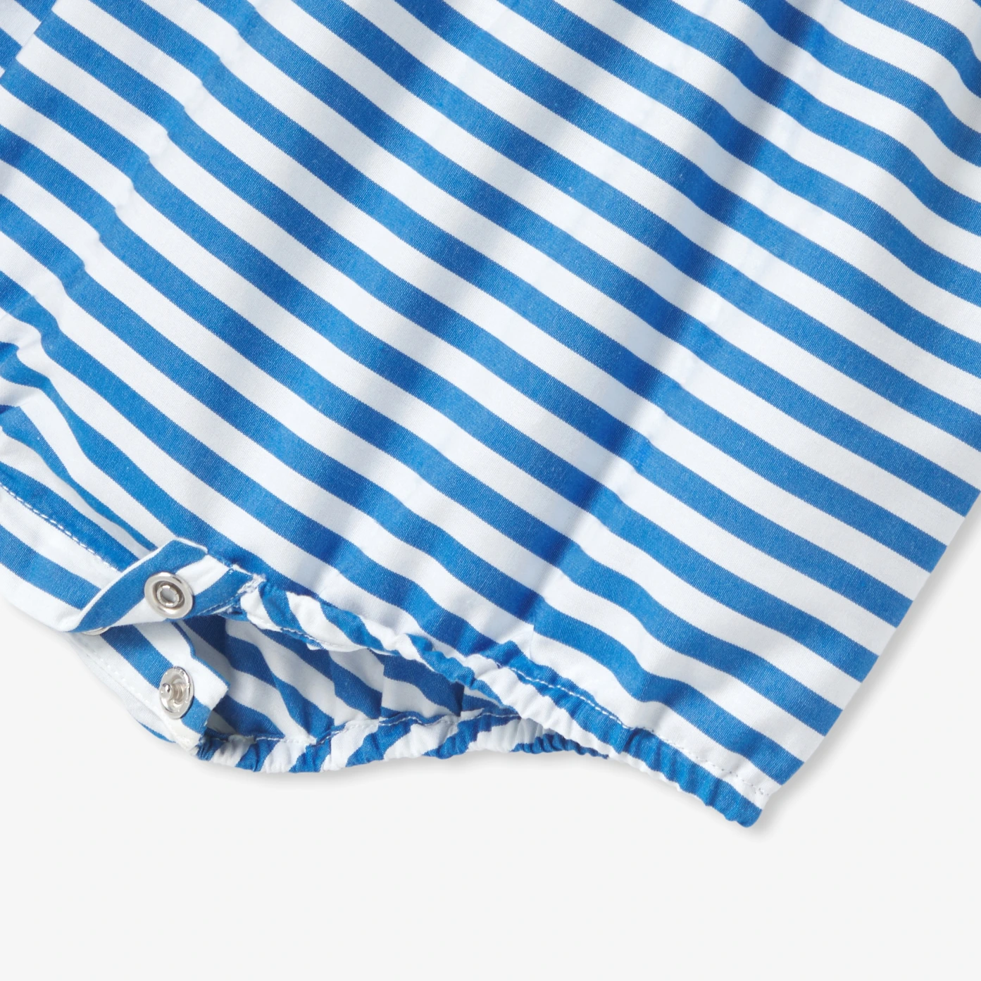 此款女嬰短褲連身裝以俐落剪裁喚起復古高級訂製服的經典神韻,設計師重新詮釋了這款標誌性單品。胸前的波浪造型設計與背後波浪肩帶相互呼應,搭配抽皺設計的水手風條紋泡泡褲,為夏日造型增添優雅與趣味。