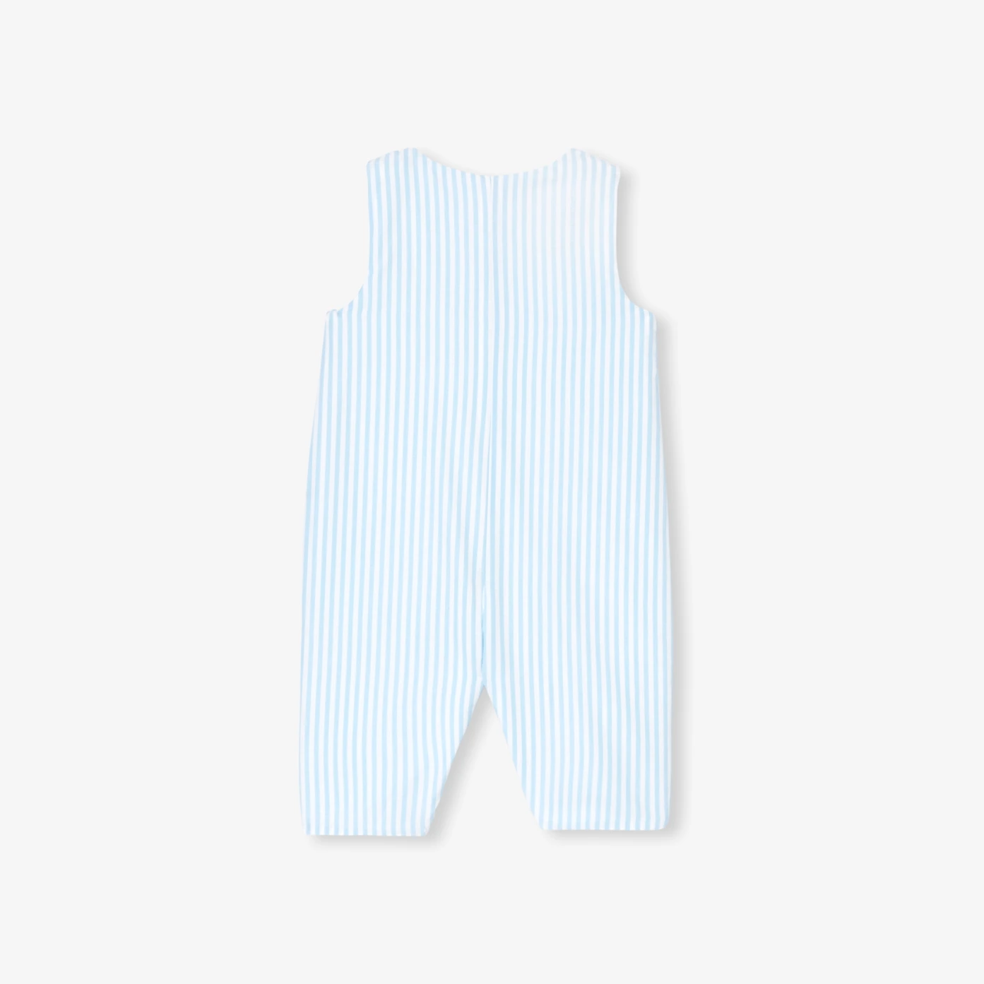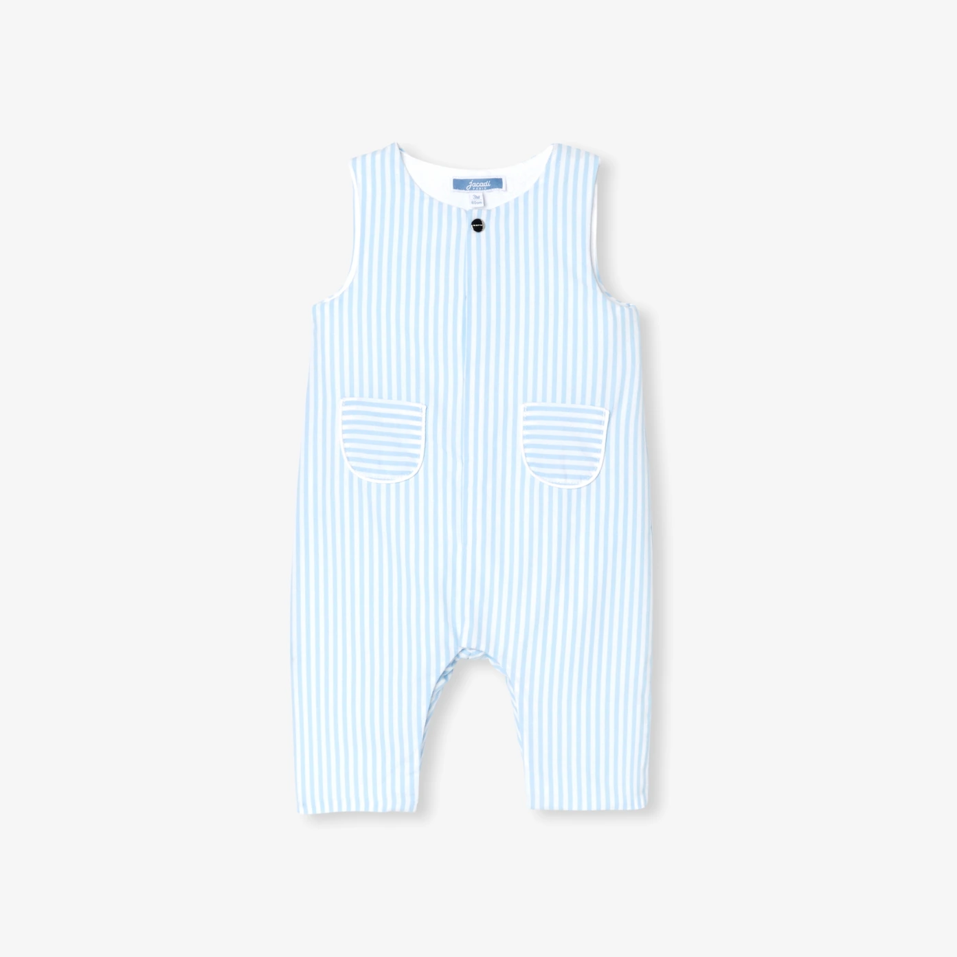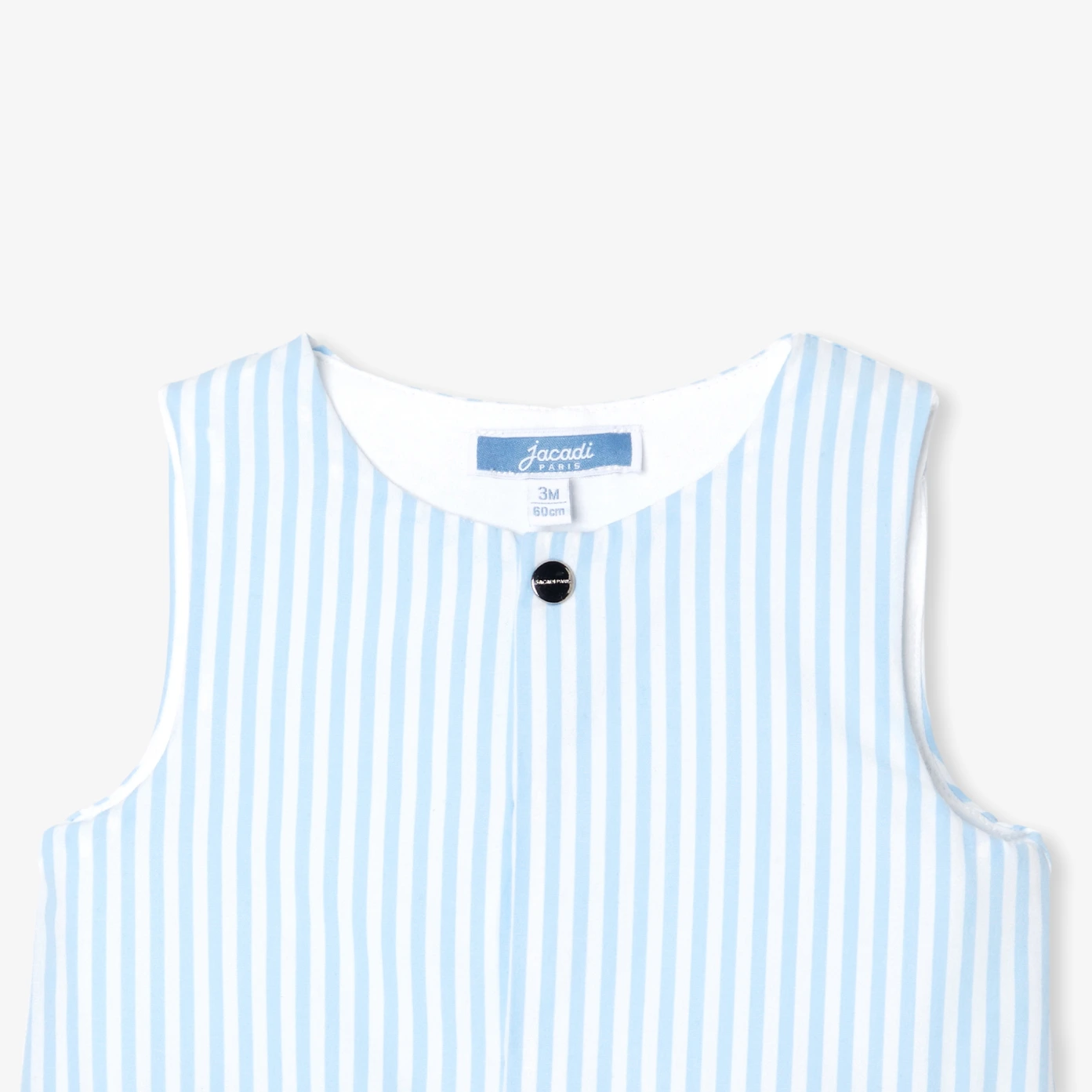Jacadi 為新生男嬰打造一款兼具優雅與舒適的連身服,外層選用條紋棉質府綢,內裡鋪有柔軟針織布與輕盈鋪棉,為日常穿搭注入法式質感。正面與褲檔設有按釦開口,方便替寶寶穿脫;兩側飾有白色滾邊口袋,細節精緻,整體設計展現出對嬰幼兒衣著的細膩關注。