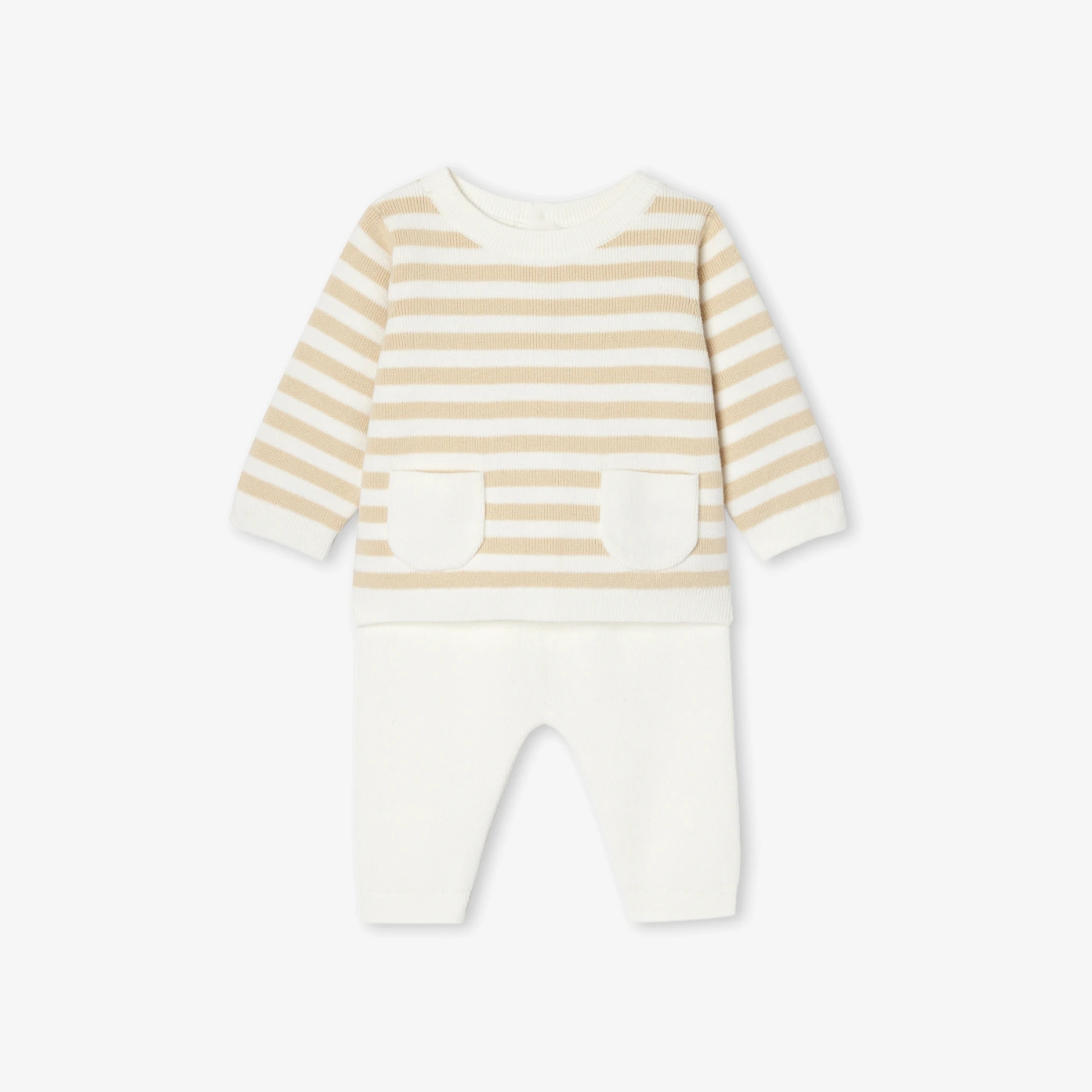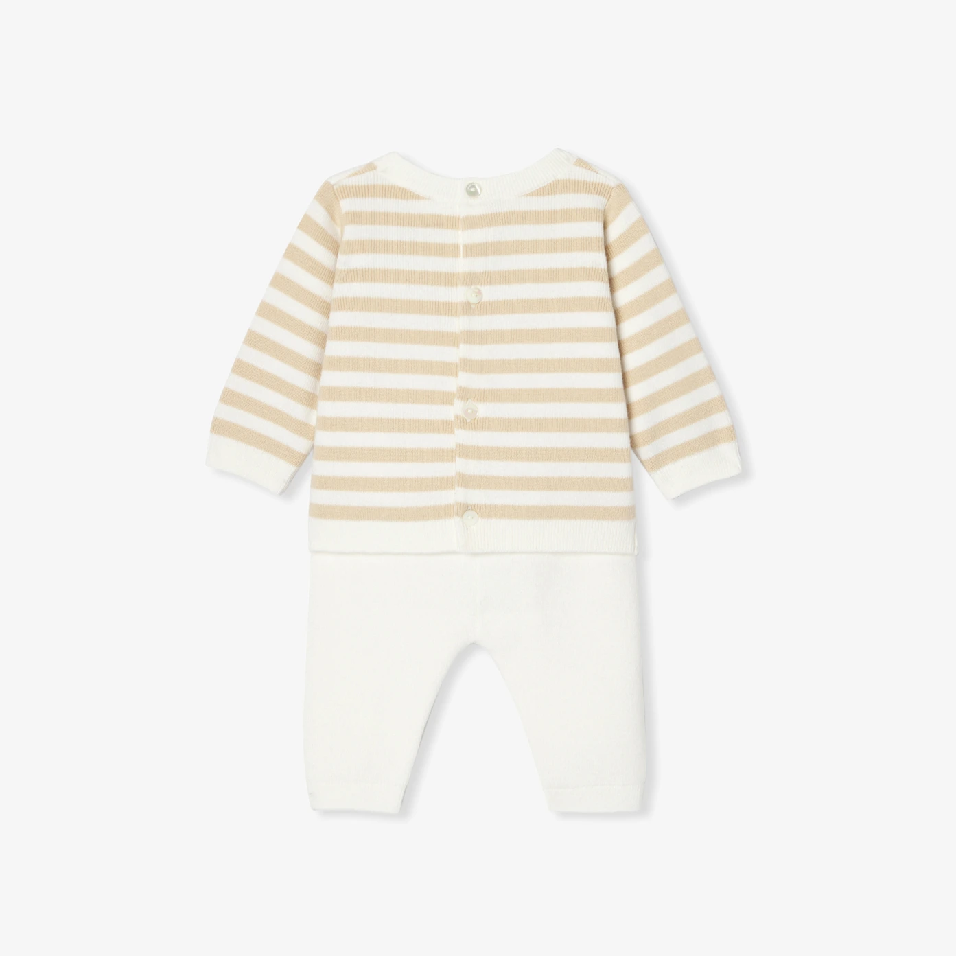 這套寶寶服裝洋溢航海風情,採用柔軟有機棉製成。背部按釦設計方便穿脫,褲子配有鬆緊腰頭,現代且舒適的配色非常適合日常穿著與托嬰場所。