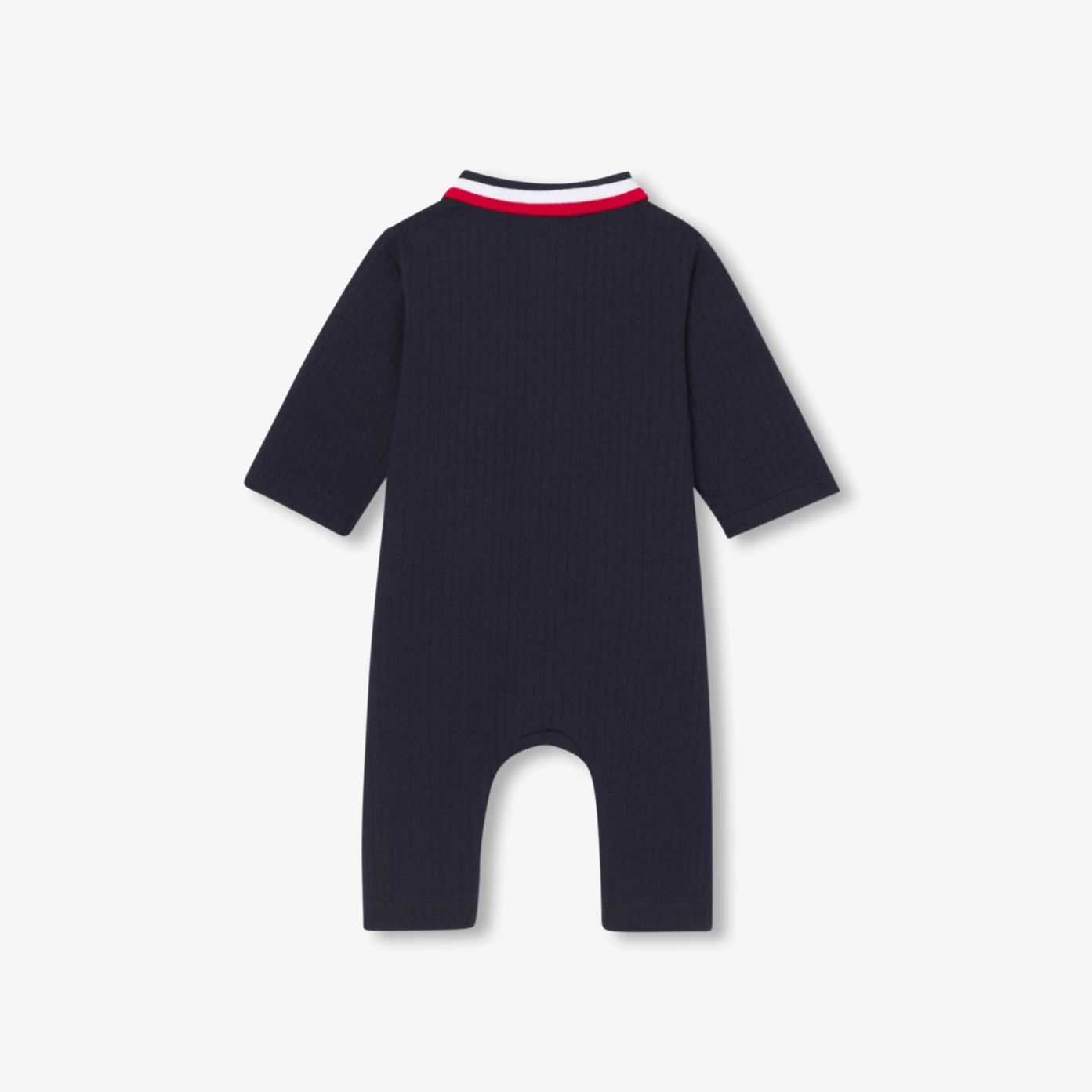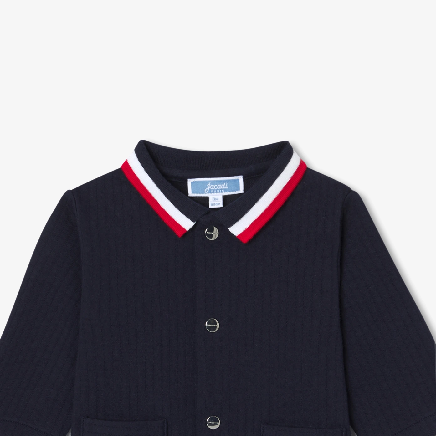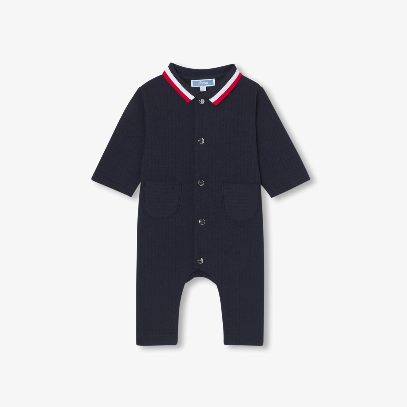 日常好幫手,設計師以運動休閒風打造這款嬰兒男童連身衣。採用柔軟且具彈性的絎縫針織布,搭配貼布口袋和條紋POLO領,注入巴黎魅力,舒適合身,適合在家與托嬰中心穿著。