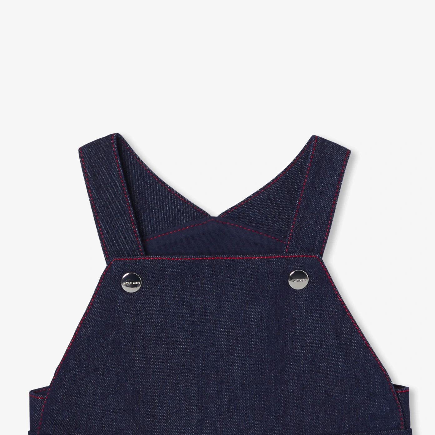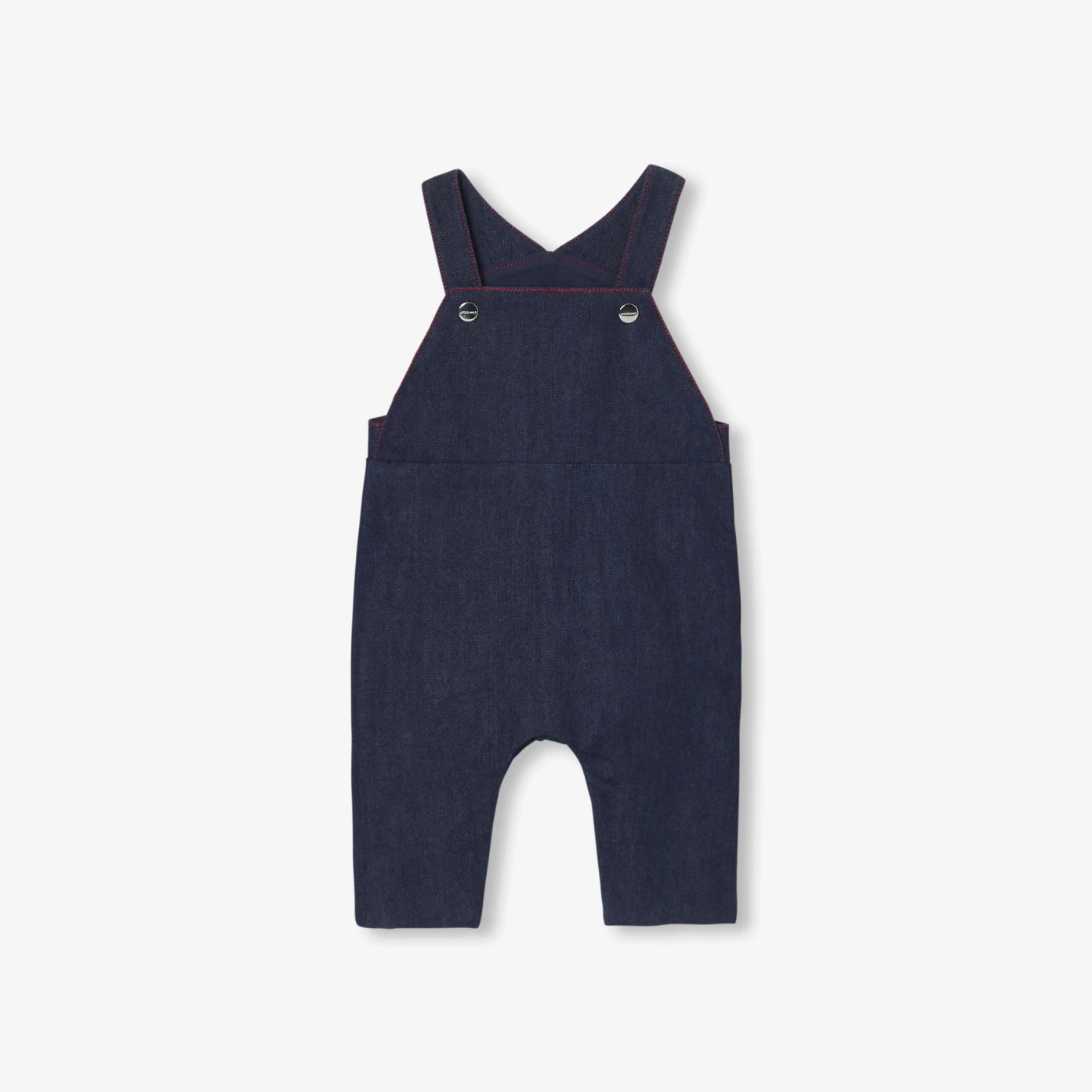 這款牛仔吊帶褲是新生兒日常衣櫥中的百搭單品,特別選用柔軟原色丹寧布,兼具靈活性與舒適度。內裡採用針織布料,提升包覆性,對比色車縫線與隱形褲檔按釦設計,融合現代感與實穿性。搭配條紋包屁衣與紅色開襟外套,打造溫暖的都會風穿搭。