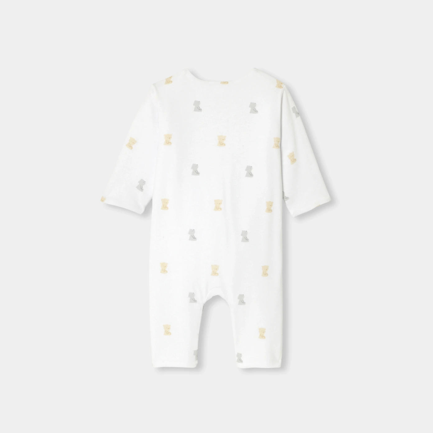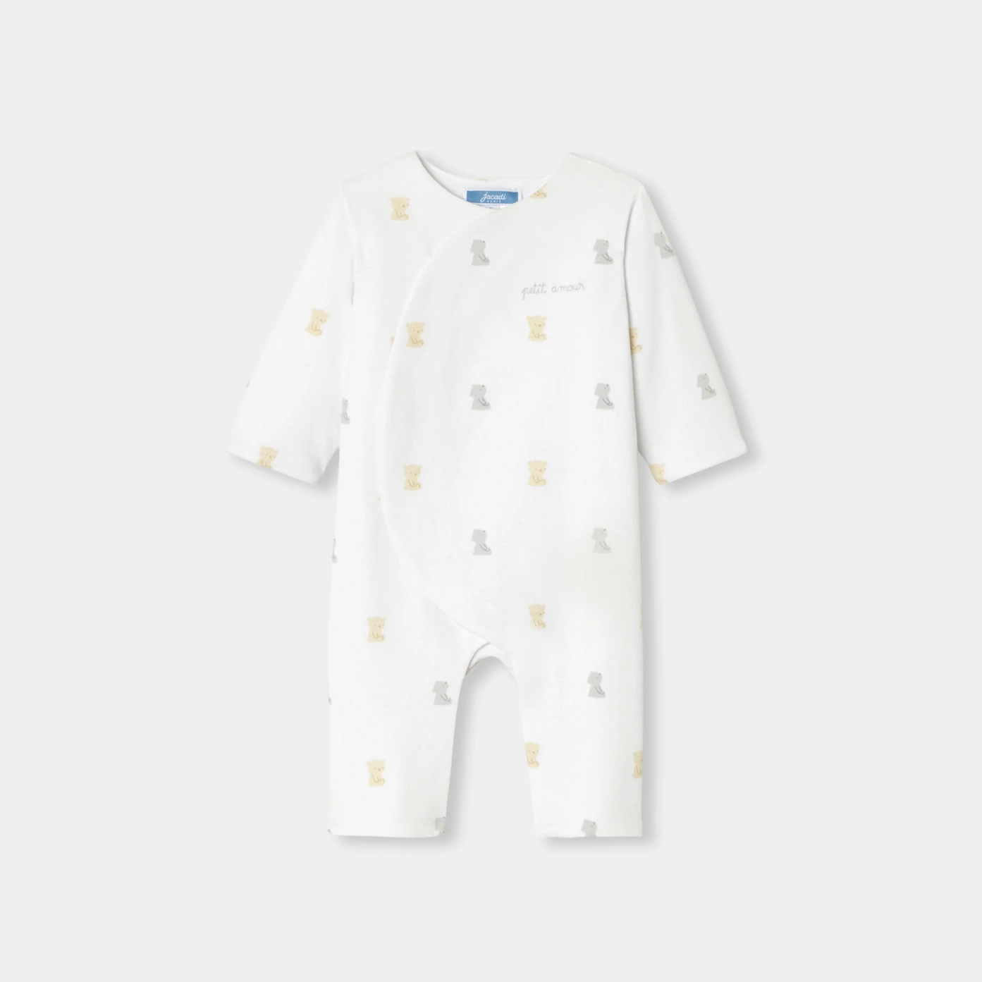 這款有機棉新生兒連身裝兼具現代美感與實穿機能,採用輕量鋪棉針織布料製成,觸感柔軟舒適,包覆式設計方便穿脫。整體以專屬小熊圖案搭配胸前「Petit amour」刺繡字樣點綴,為日常穿搭增添童趣與溫柔氛圍,是理想的新生禮或嬰兒首套衣著之選。