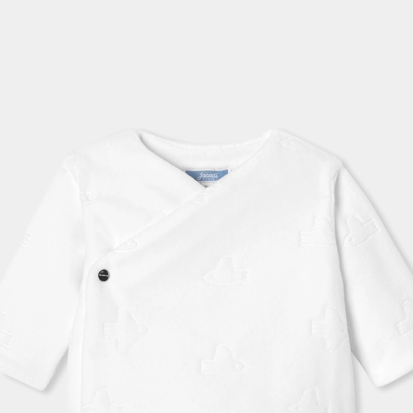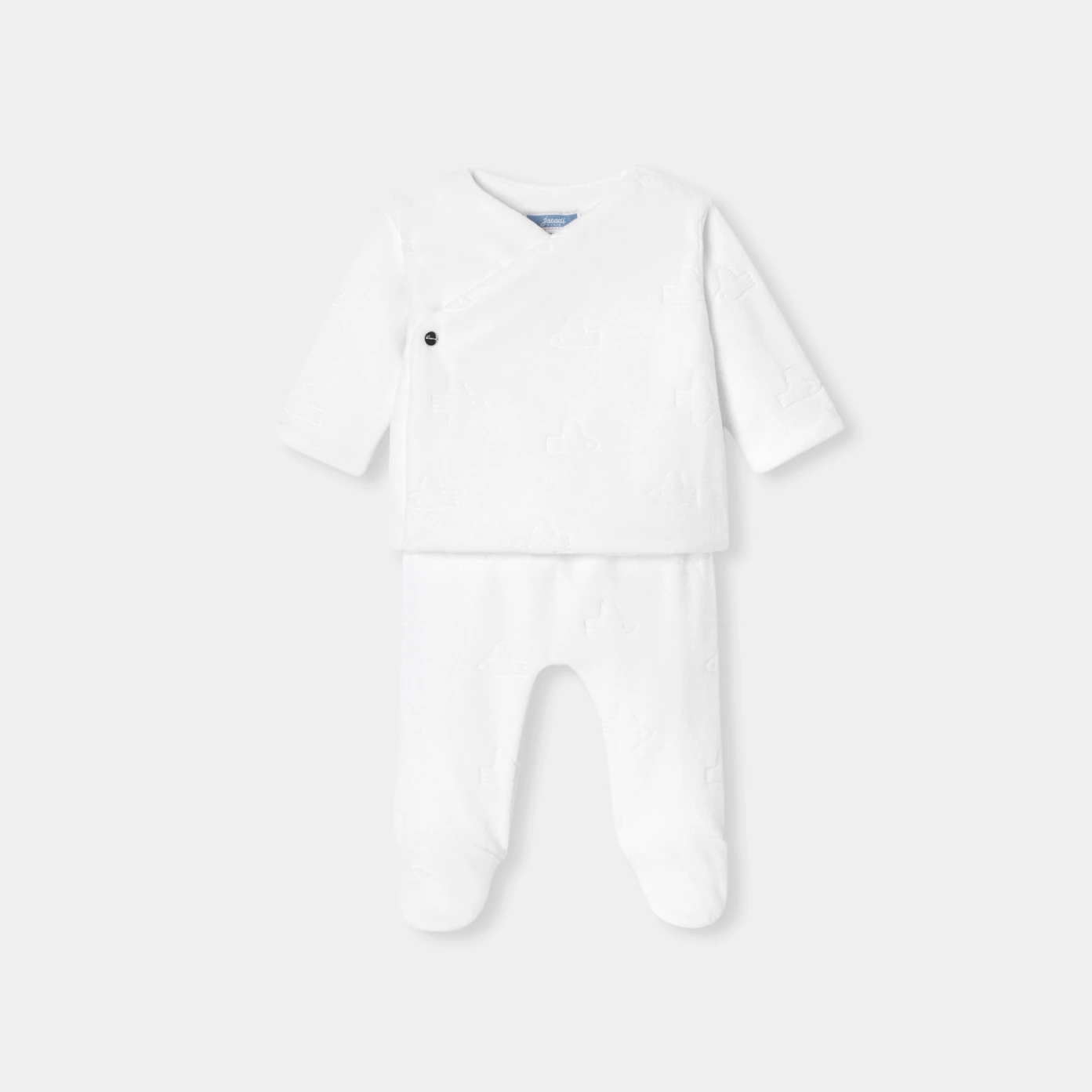 Jacadi 以精湛工藝為新生兒打造出這款柔軟絨布套裝。飾有海鷗圖案的設計洋溢溫柔氛圍,包含一件溫暖舒適的交叉式開襟外套,內層全襯柔軟平紋針織布,與一件具彈性羅紋腰頭的長褲,給予寶寶完整包覆與貼身的舒適感受。無論作為出生禮或作為初次出院穿搭,都是不可或缺的嬰兒衣櫥首選。
