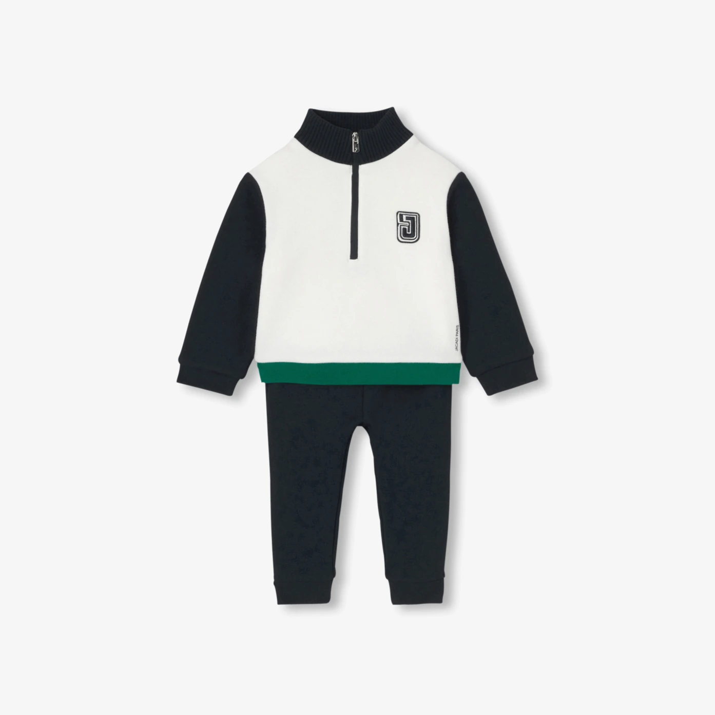 這款男寶寶刷毛套裝融合英式學院風格,搭配撞色設計與精緻刺繡徽章,為開學季打造亮眼造型。柔軟刷毛上衣搭配立領拉鍊設計與胸前J字徽章,下身則為可調節鬆緊腰圍的運動長褲,舒適又方便穿脫,是忙碌早晨的完美穿搭選擇,兼具運動感與時尚氣息。