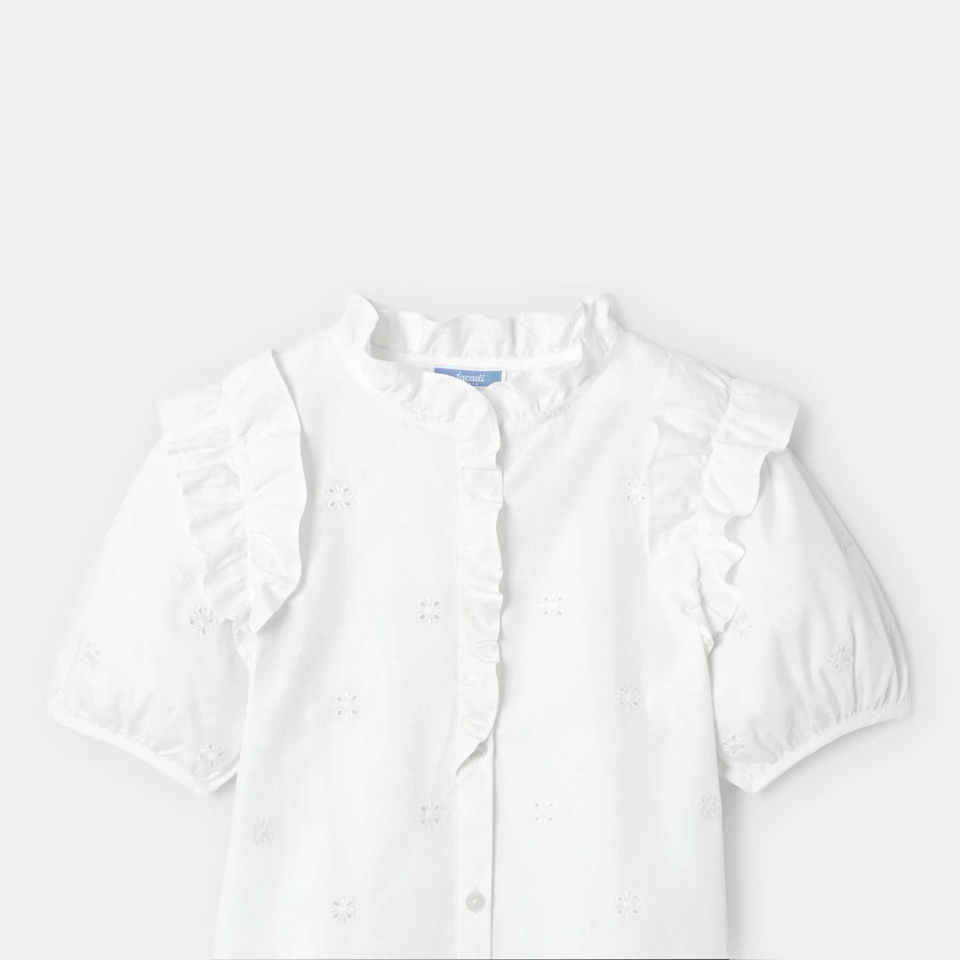 這款上衣衫採用輕盈飄逸的府綢製成,別緻而精緻。燈籠袖和荷葉邊細節,飾有優雅的英式刺繡,可搭配闊腿褲和芭蕾舞鞋,打造充滿巴黎魅力的造型。