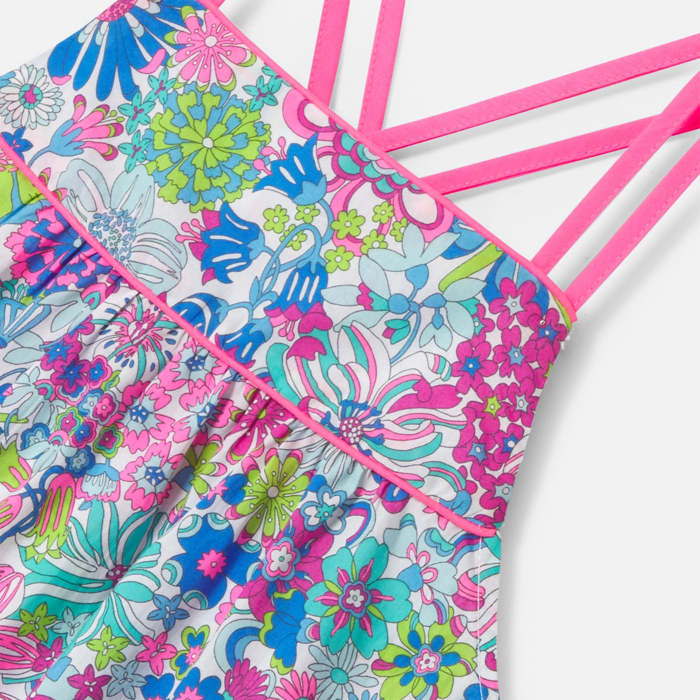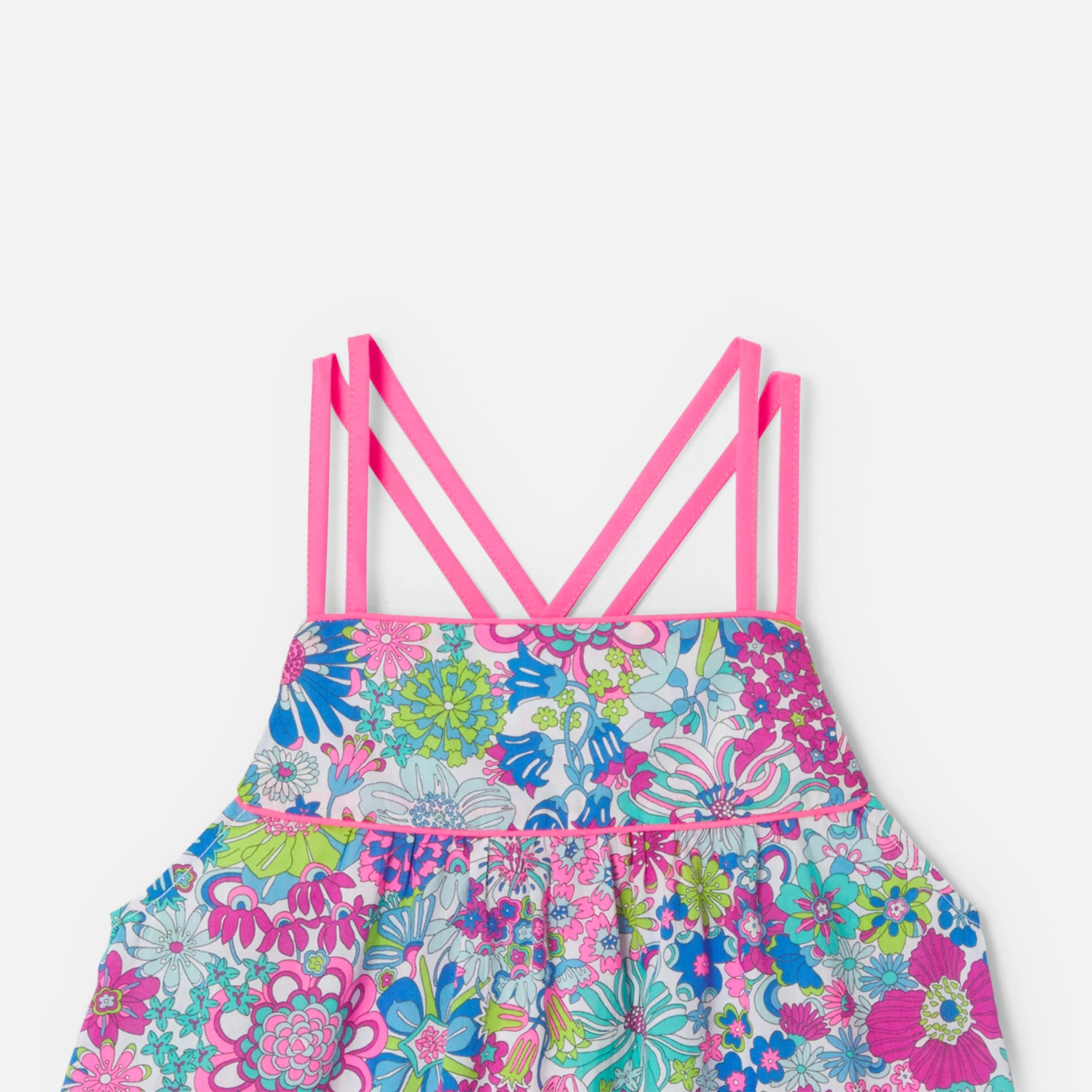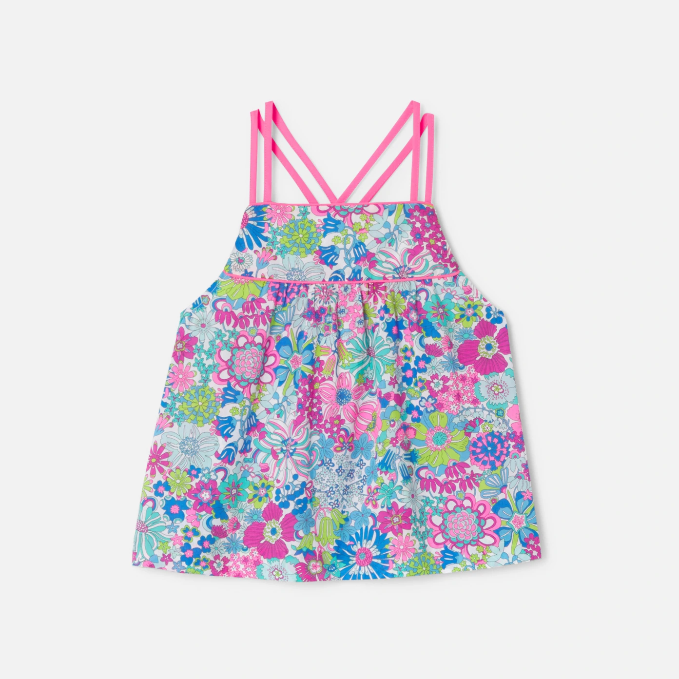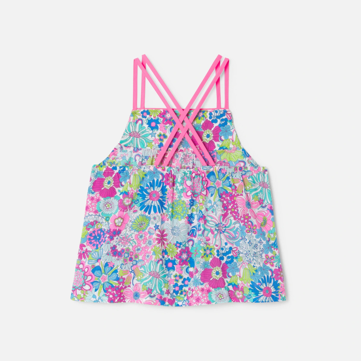 這款女孩上衣背部飾有纖細的交叉肩帶,為陽光明媚的日子打造了一種休閒時尚的風格。採用色彩鮮艷的Liberty花布製成,適合在盛夏時節搭配毛巾布短褲穿著。