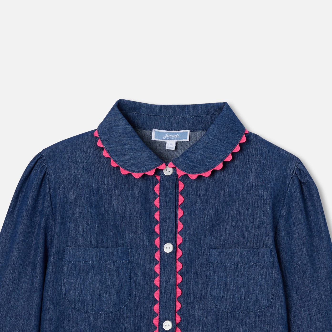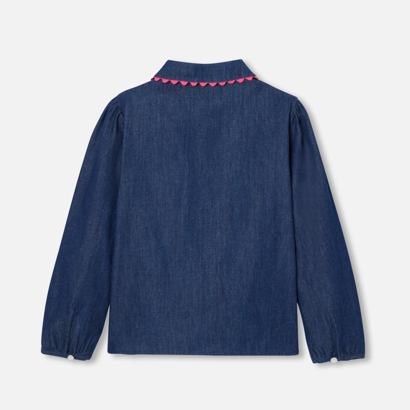 這款牛仔襯衫首次出現在女童的衣櫥中,以原色丹寧布料打造,呈現出一款極具時尚感的襯衫。搭配彼得潘領與胸前的貼袋設計,袖口上下的褶皺和粉紅色的鉤編帶,為這件單品增添了優雅氣質。建議搭配寬版粉色天鵝絨長褲,呈現出現代復古風的造型。