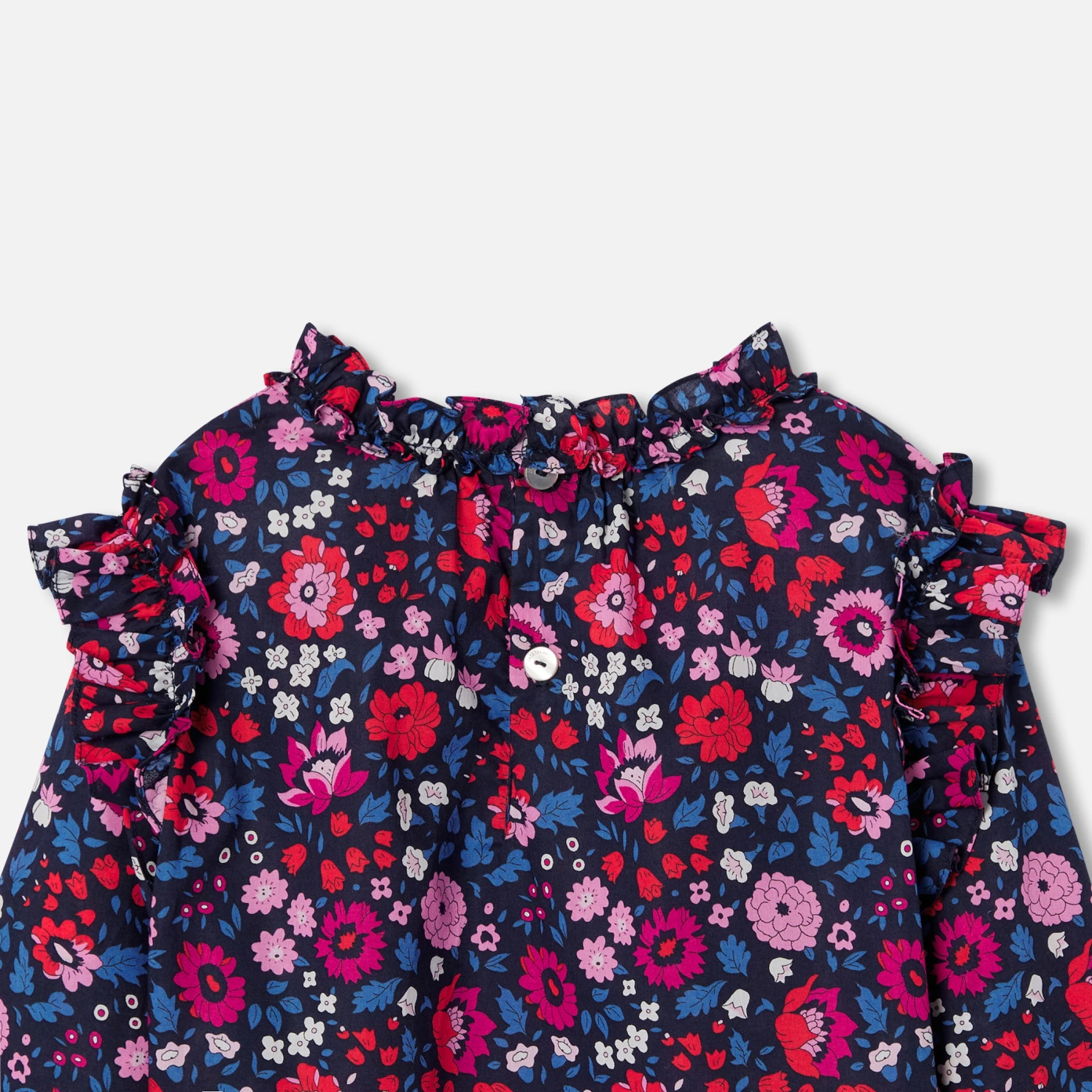 這款女童上衣結合了柔軟的純棉府綢與優雅的Liberty印花布料,領口與肩部的荷葉邊設計增添現代感的立體感與豐盈度。搭配短裙或寬鬆的燈芯絨長褲,這款浪漫的上衣為日常穿搭提供完美的造型選擇。