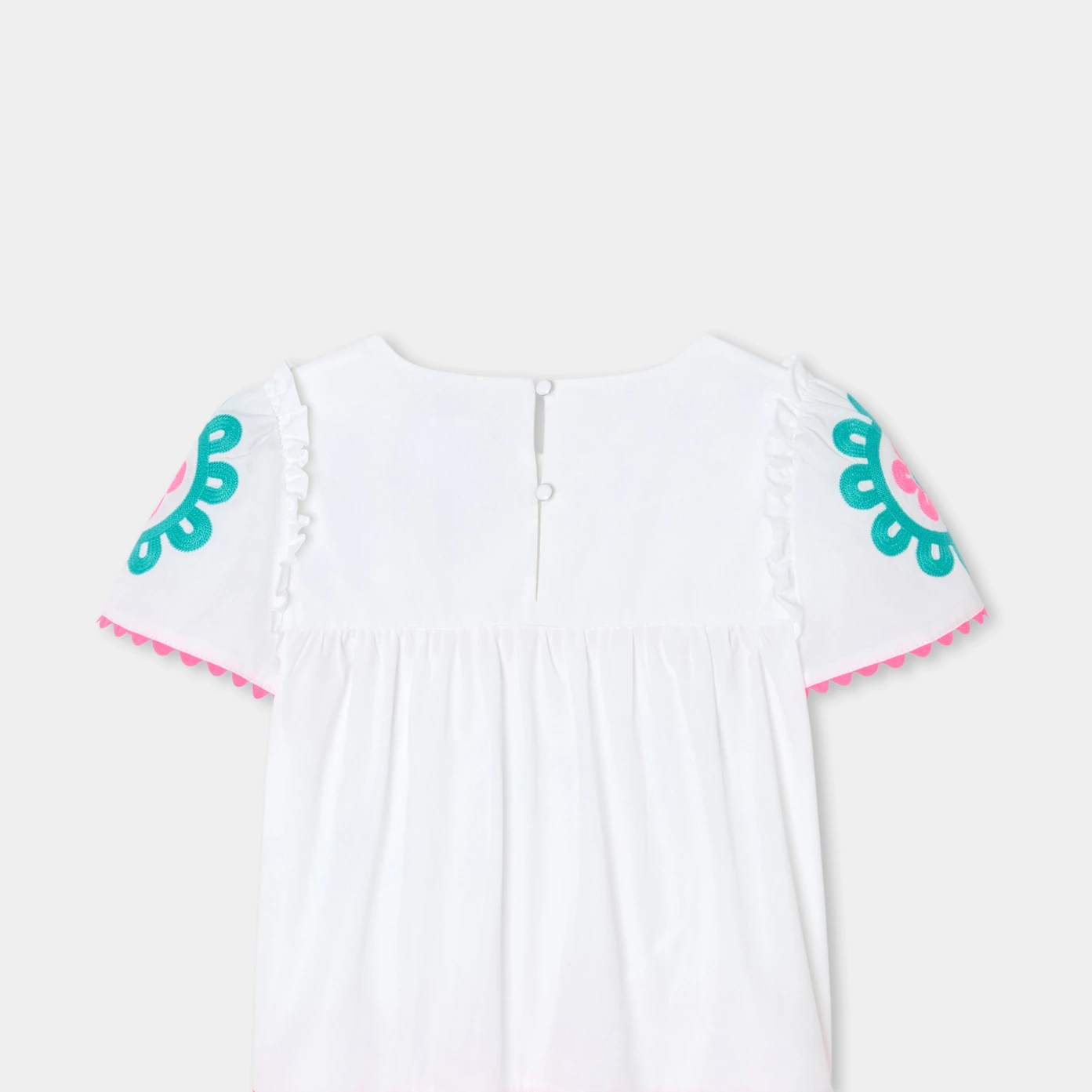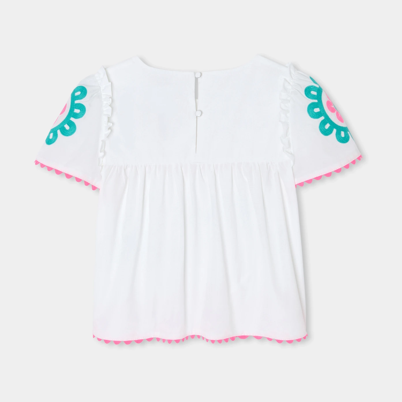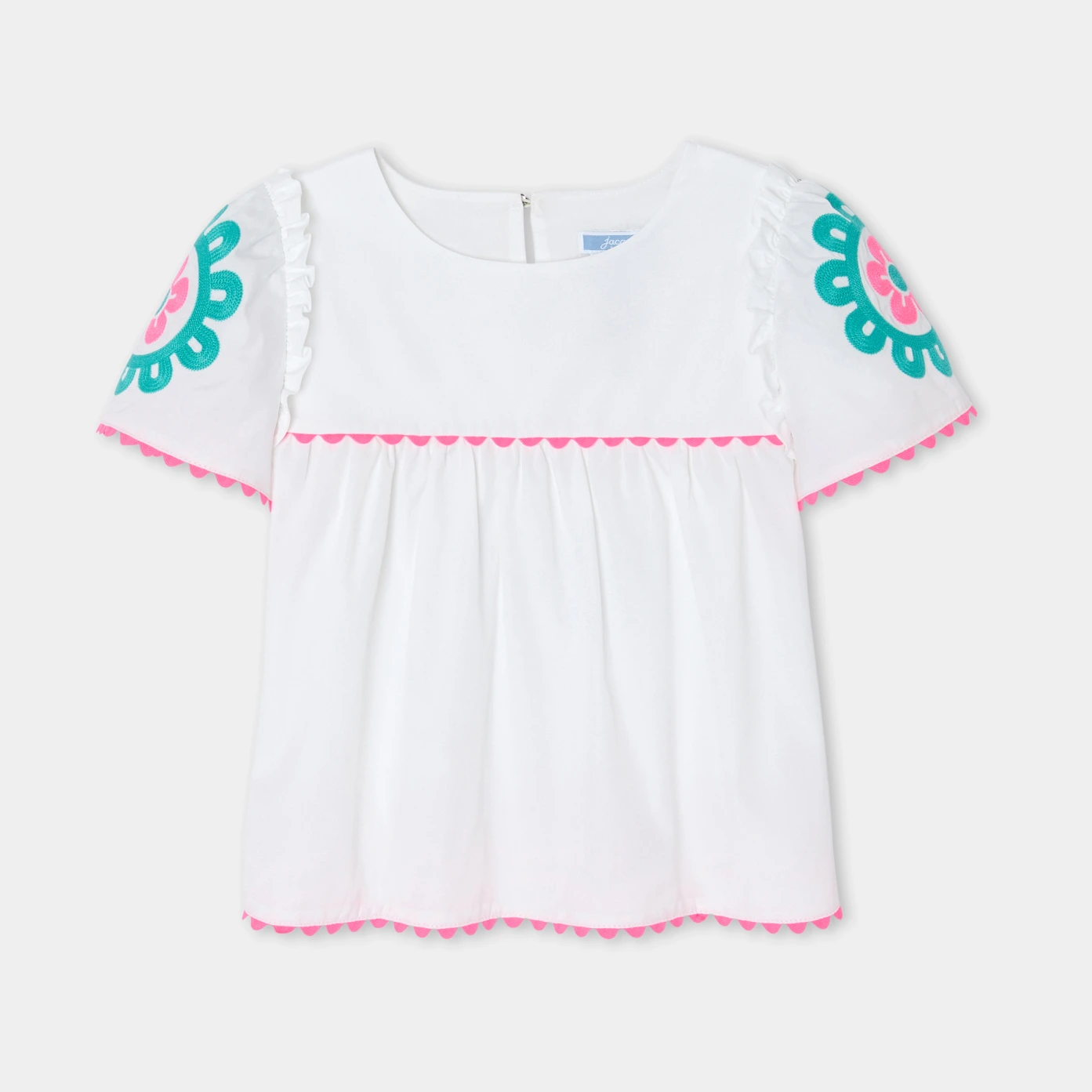 春日衣櫥必備單品,這款經典白色上衣將為女孩造型注入繽紛民俗風格。肩部荷葉邊設計,搭配精緻玫瑰刺繡與桃粉色流蘇裝飾,細節滿滿,展現獨特法式優雅。