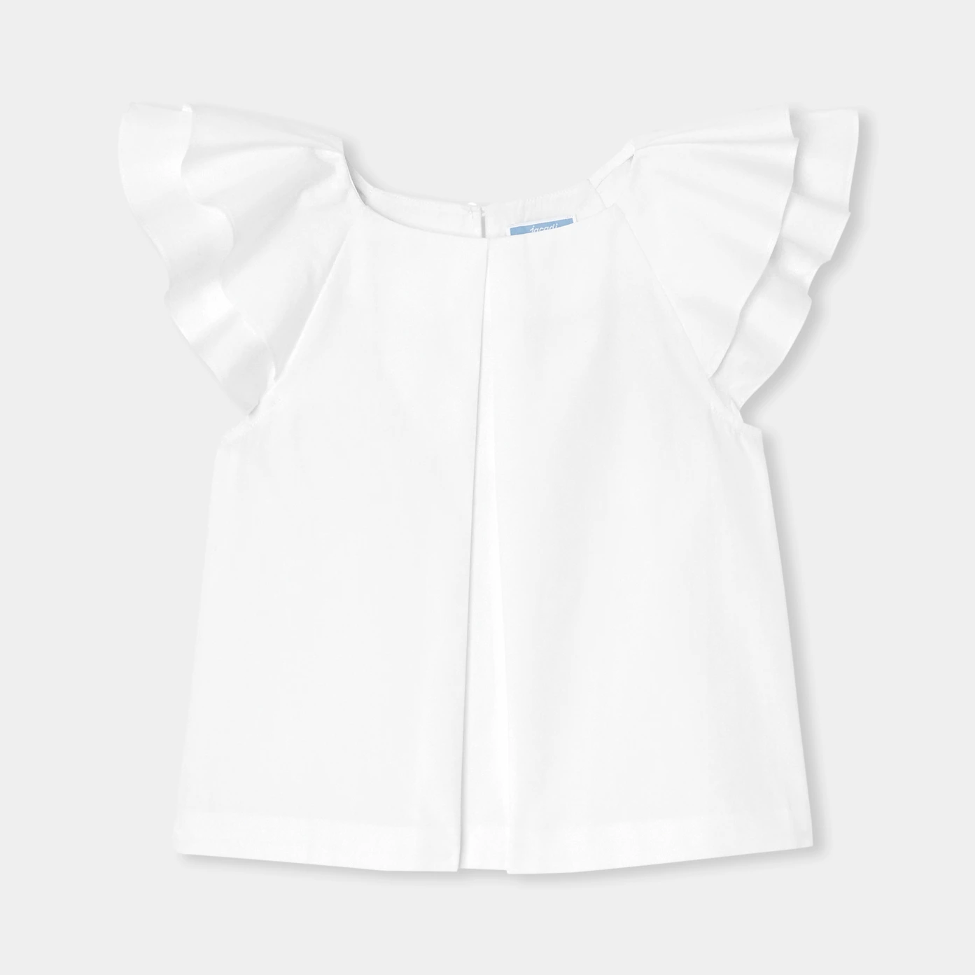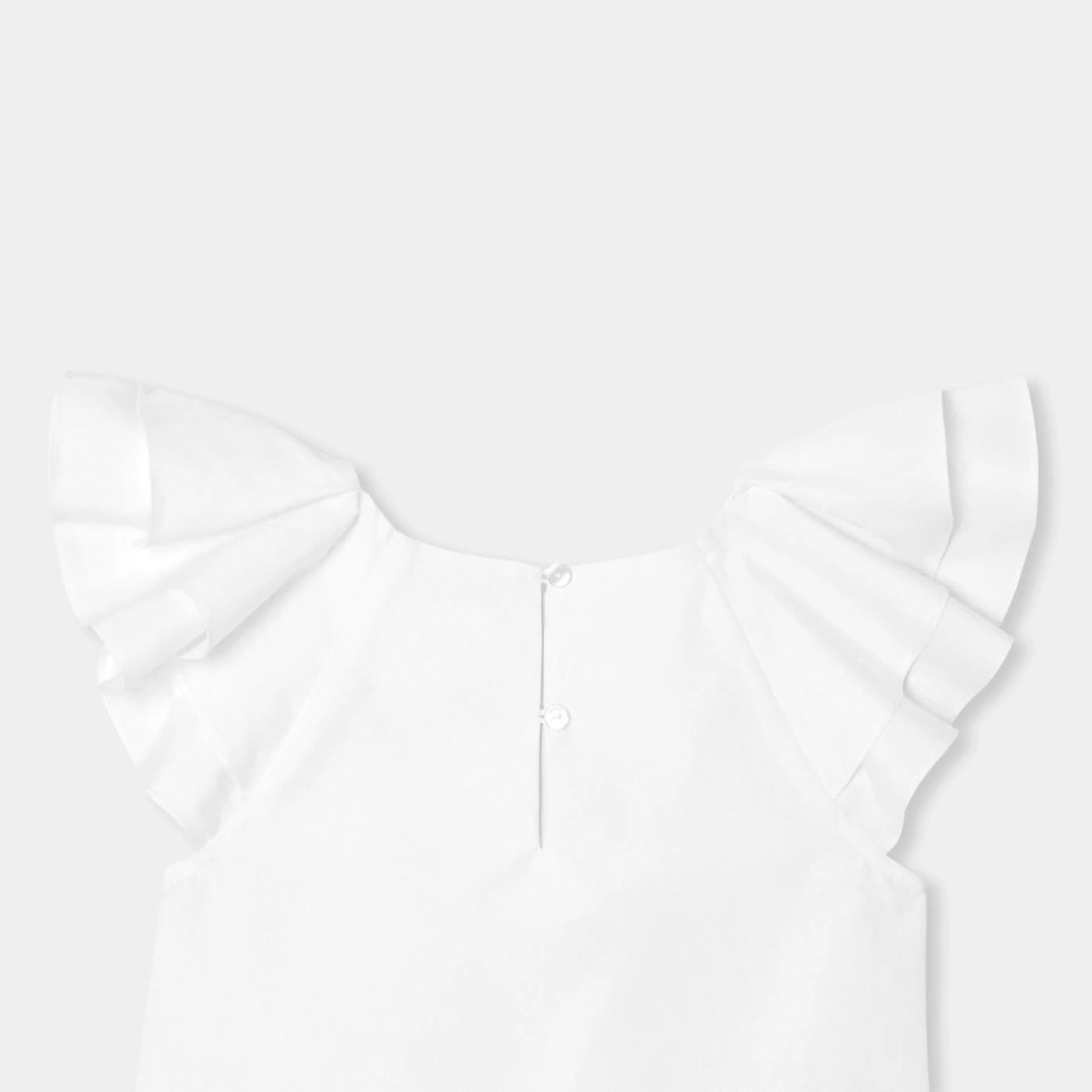 這款經典不敗的女孩襯衫,利用幾何美學線條來演譯法式童裝時尚,設計別緻而極具現代感。採用頂極有機府綢棉材質製成的襯衫,領口採用特別的箱形褶襇設計,並搭配寬版雙層荷葉邊袖,極具立體層次感,將簡單的襯衫昇華得更為時尚活潑,建議搭配夏季Libery面料材質碎花短褲,更顯俏麗。