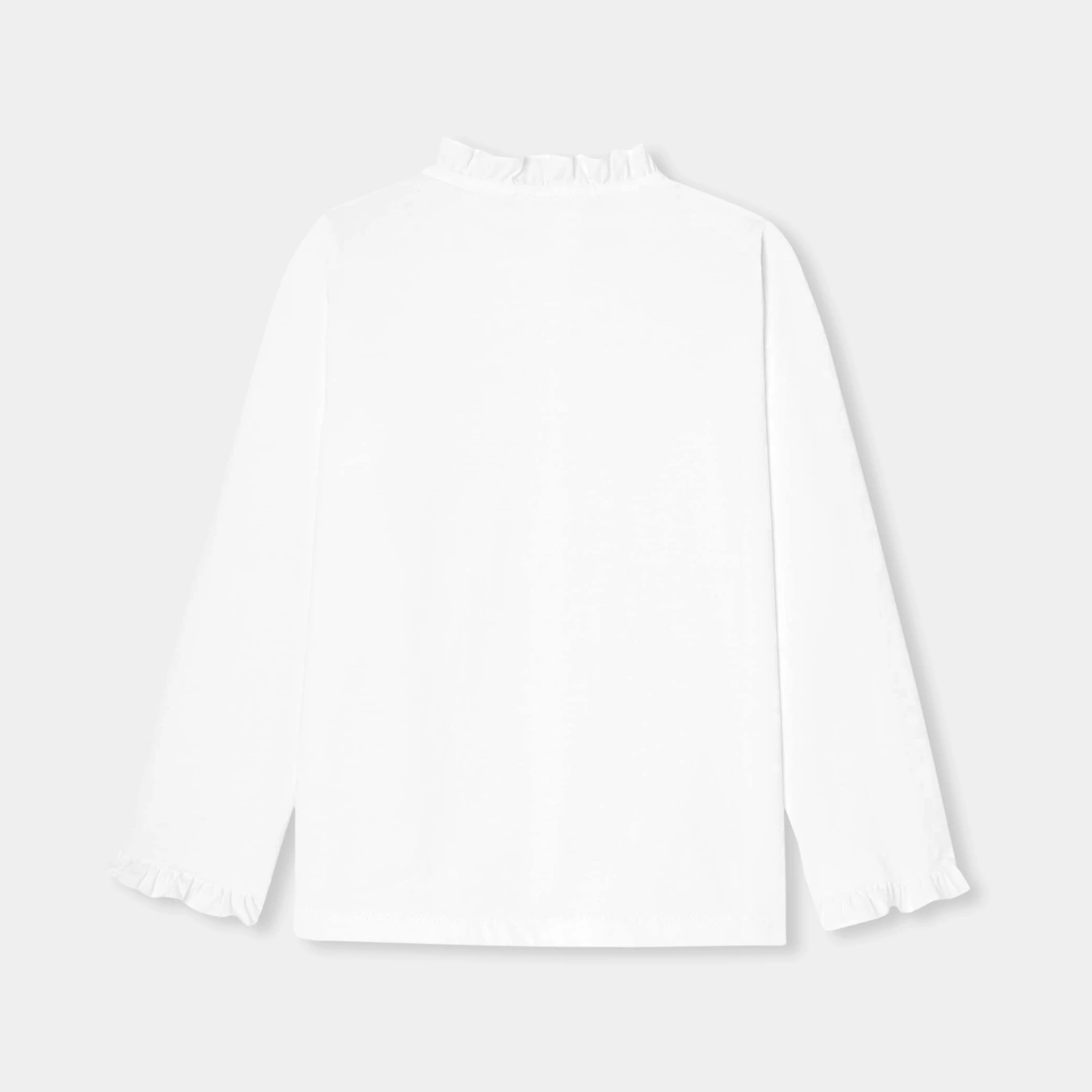 Jacadi以這款女童上衣展現法式優雅風格。選用柔軟舒適的有機棉平紋針織布料,衣領與袖口飾以荷葉邊襯衫布料拼接,細節精緻,展現經典不敗的設計美學。搭配褲裙,即可輕鬆營造出開學季的俐落造型。
