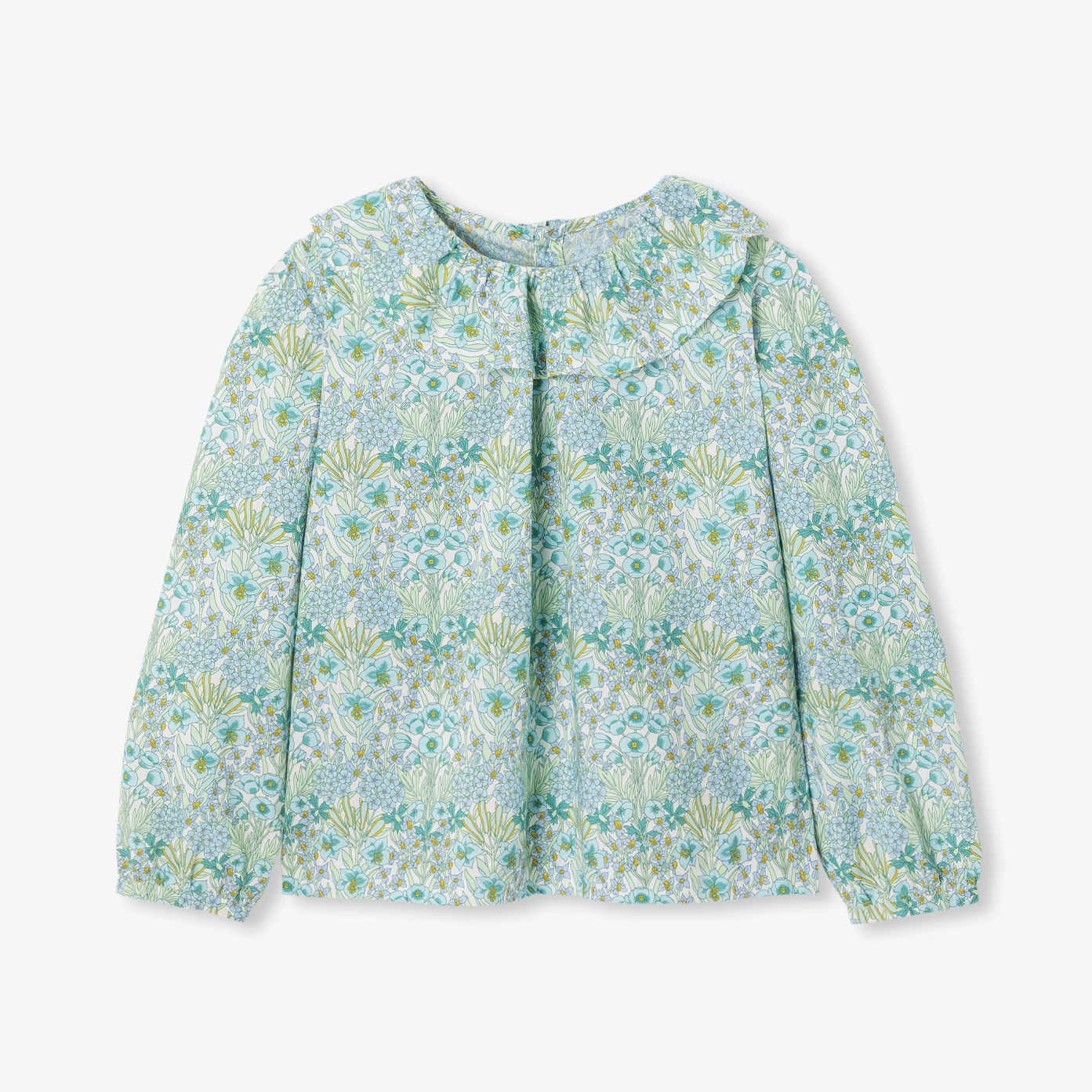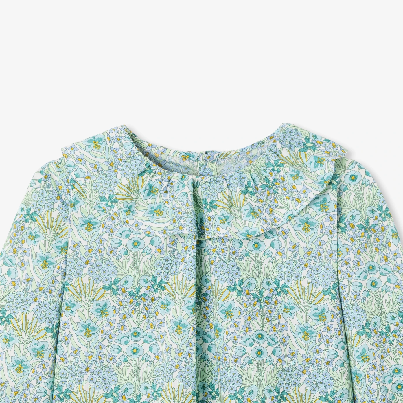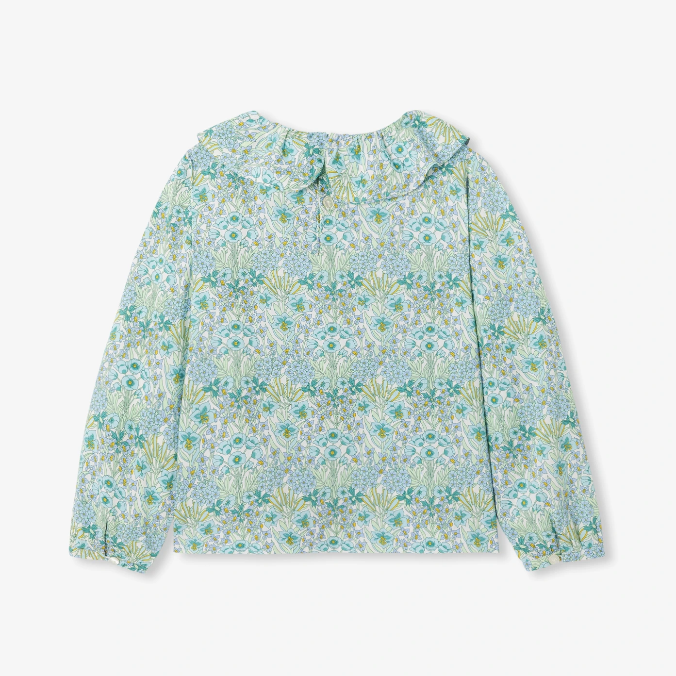 這款女童平織上衣展現俐落且純粹的冬日風格。採用 Liberty 布料,搭配荷葉領、前襟摺皺與緊縮袖口,完美襯托燈芯絨長褲與銀色羽絨外套,適合家庭出遊穿著。