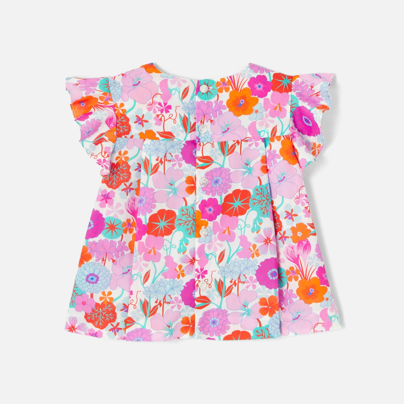 這款 Liberty 平織上衣,細節感十足。花瓣領和細膩的褶皺為這件單品增添了立體感,可搭配粉色棉質珠地布短褲,打造出法式魅力的穿搭。