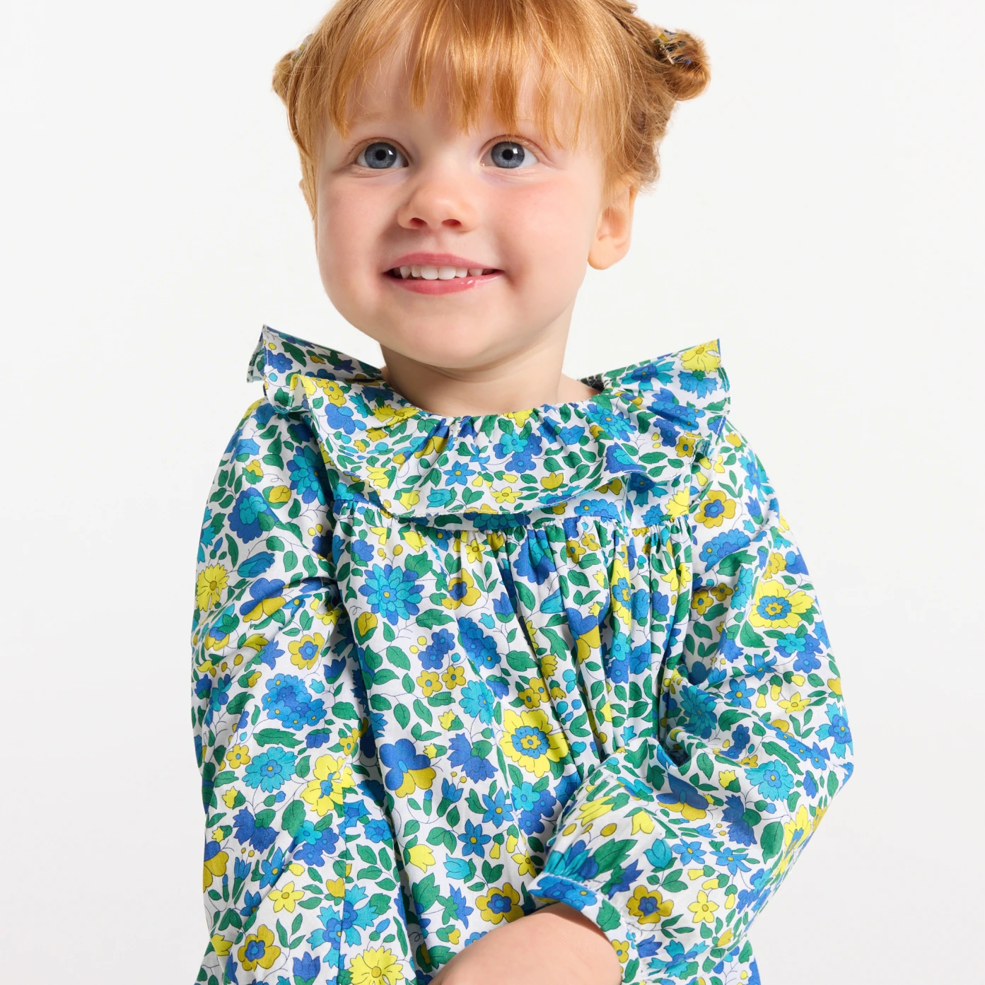 繽紛優雅的秋日衣櫥,怎能少了這款女寶寶的印花上衣。採用柔軟純棉布料製成,搭配 Jacadi 獨家配色的 Liberty Theresa Petals 花布,細緻的荷葉壓褶與層次剪裁勾勒出自然立體感。可搭配短褲與英倫風外套,陪伴每一次的時尚出遊時刻。