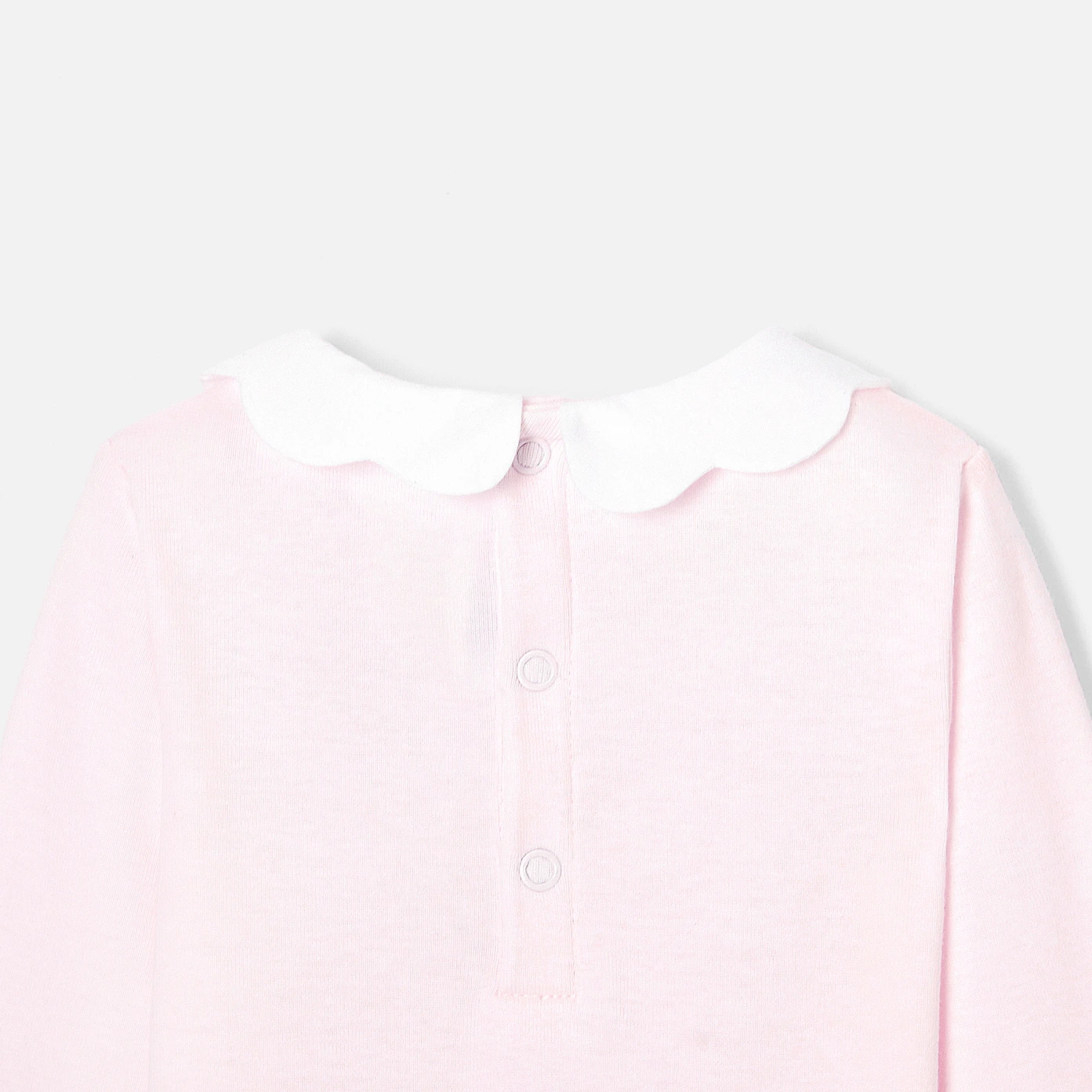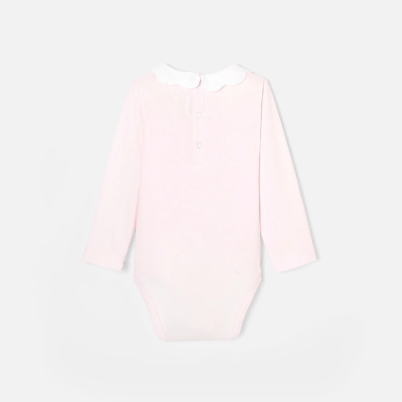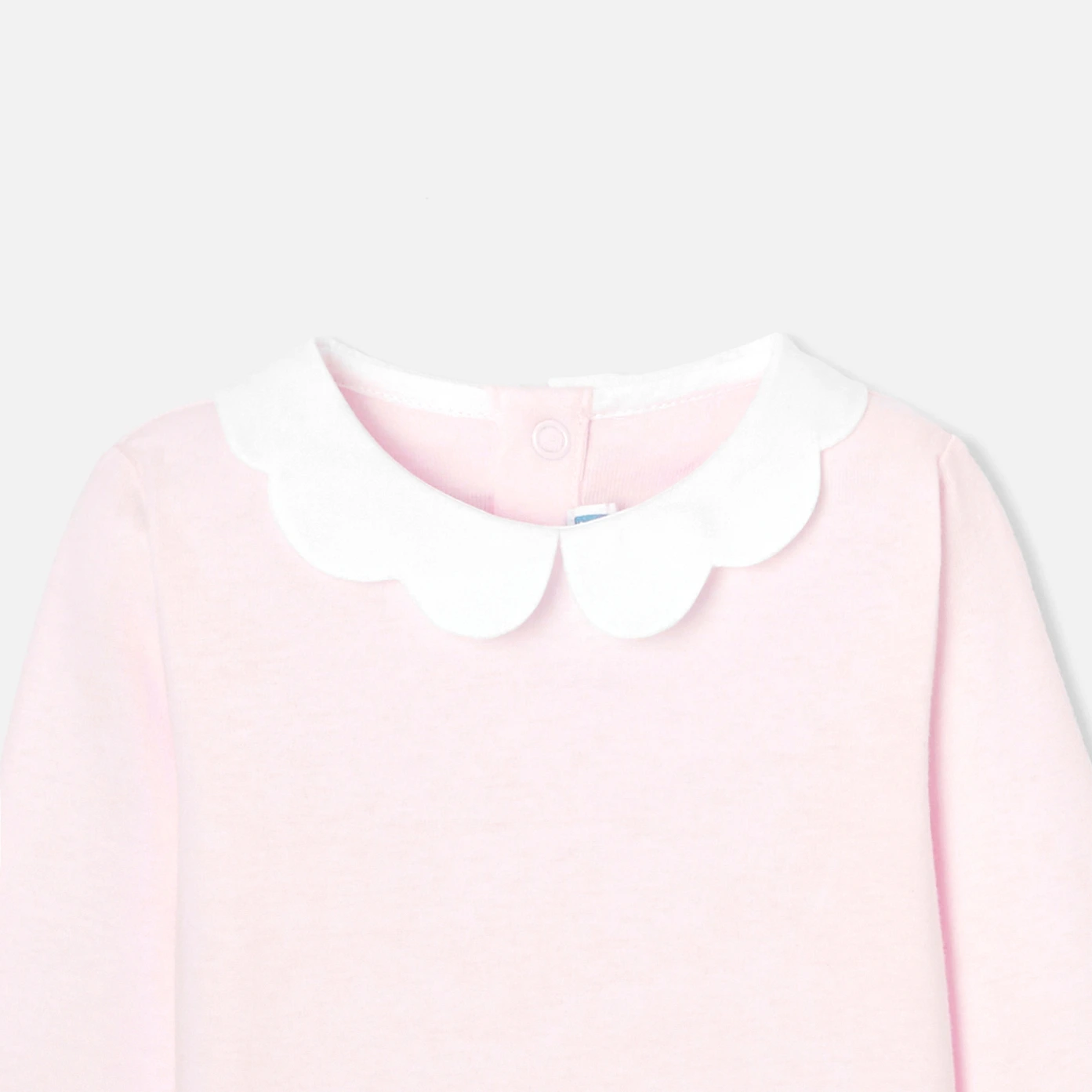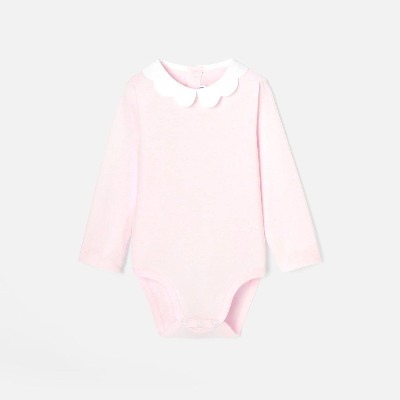 這款淺粉色女嬰連身內衣採用環保有機棉製成,採用漂亮的扇形領口設計,可搭配牛仔洋裝和芭蕾舞鞋,法式優雅盡顯,打造時尚日常造型。