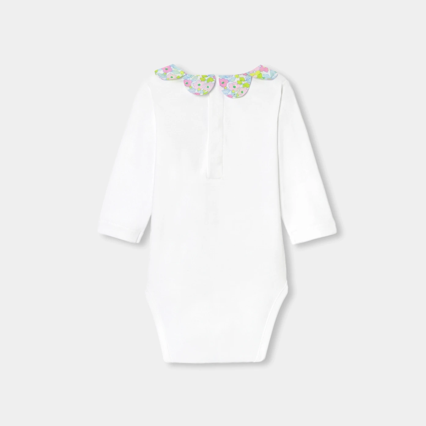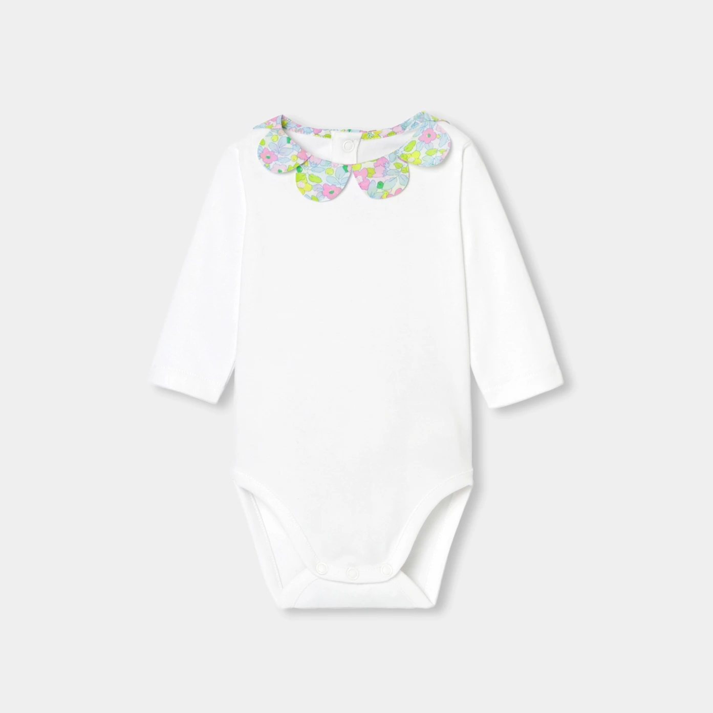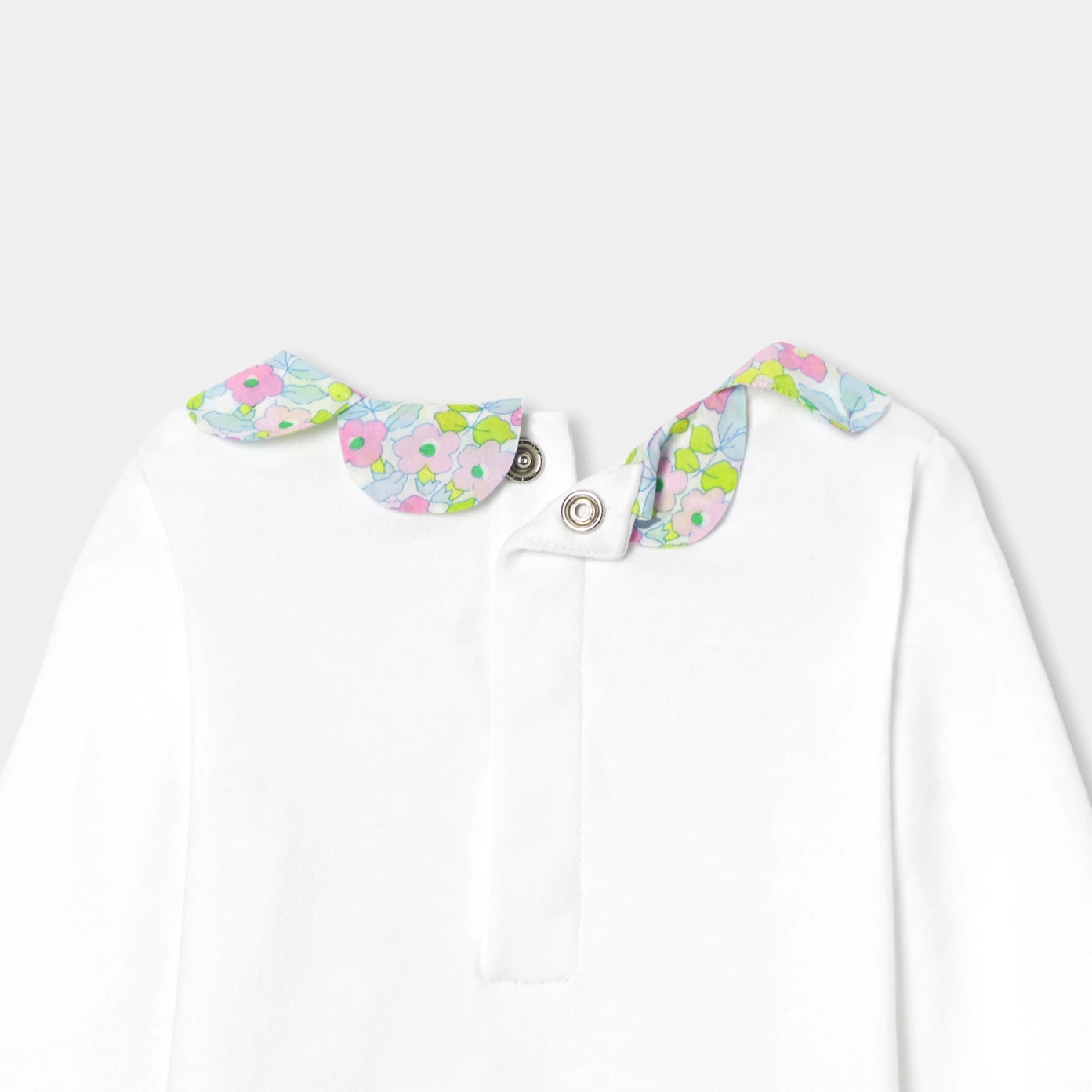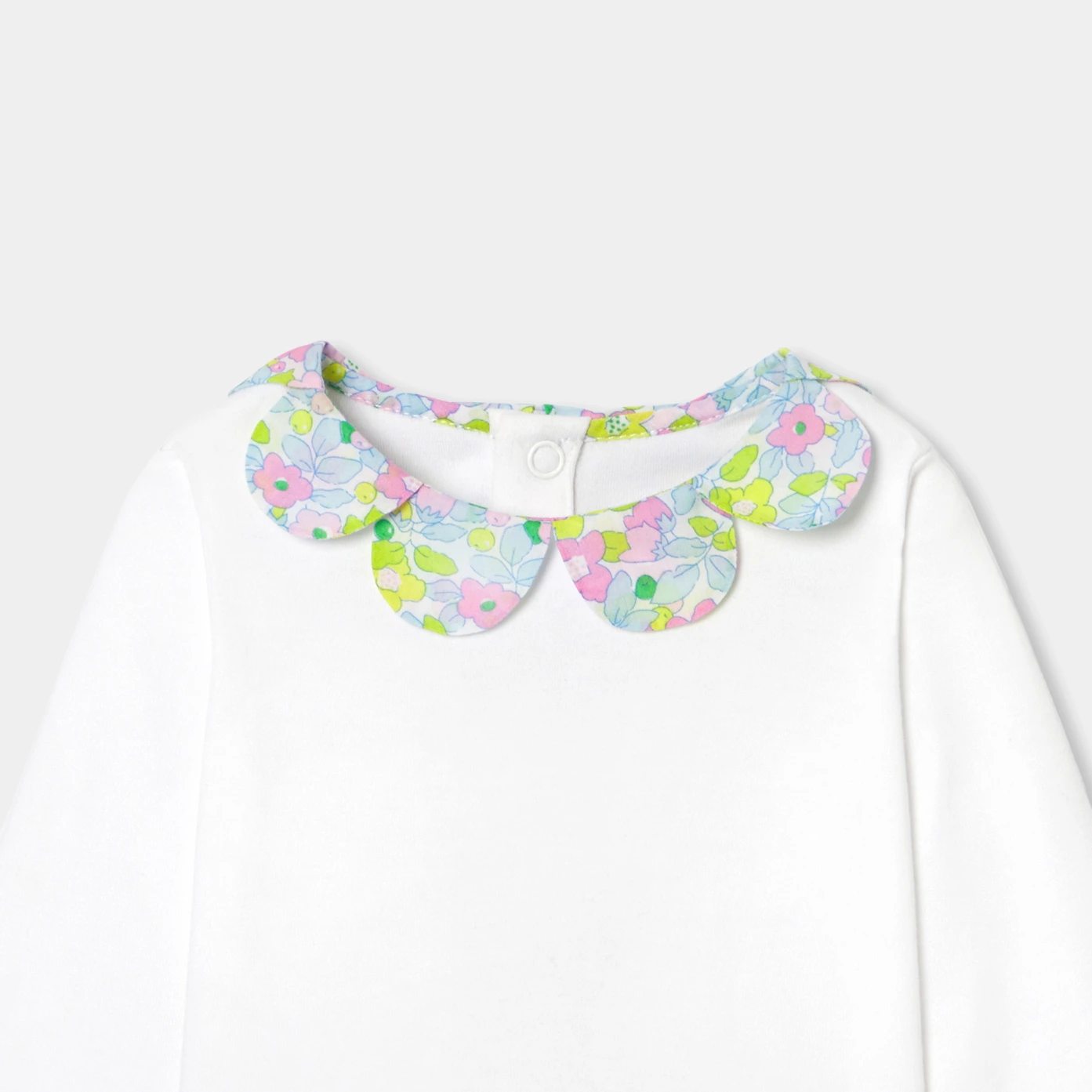 這款長袖女嬰連身衣採用柔軟、輕盈的有機棉製成,優雅又實用。它的花瓣領採用 Liberty 面料製成,非常適合夏末或是早秋穿著,可為您的小寶貝的服裝增添額外的風格。背部和胯部設有按釦,方便穿著,搭配背心裙或吊帶褲會非常好看。