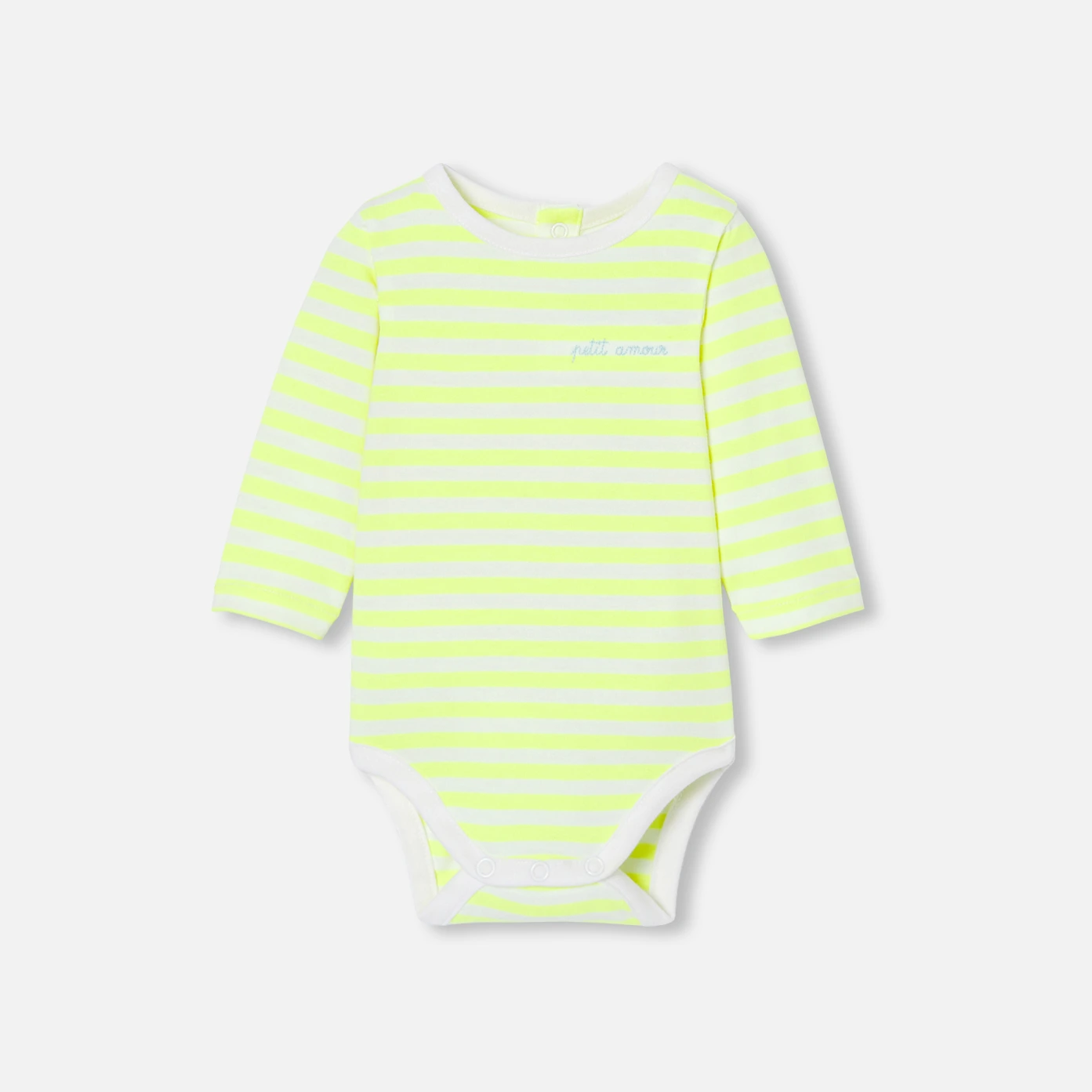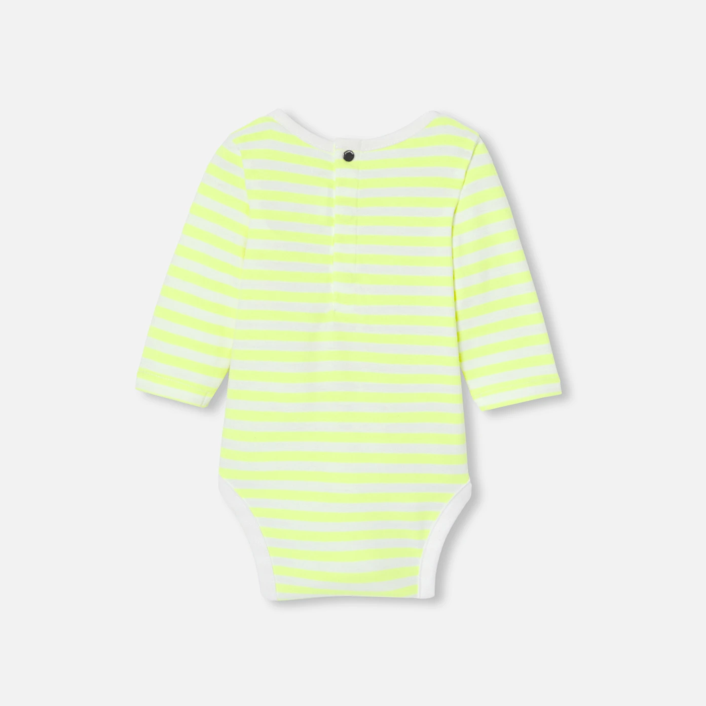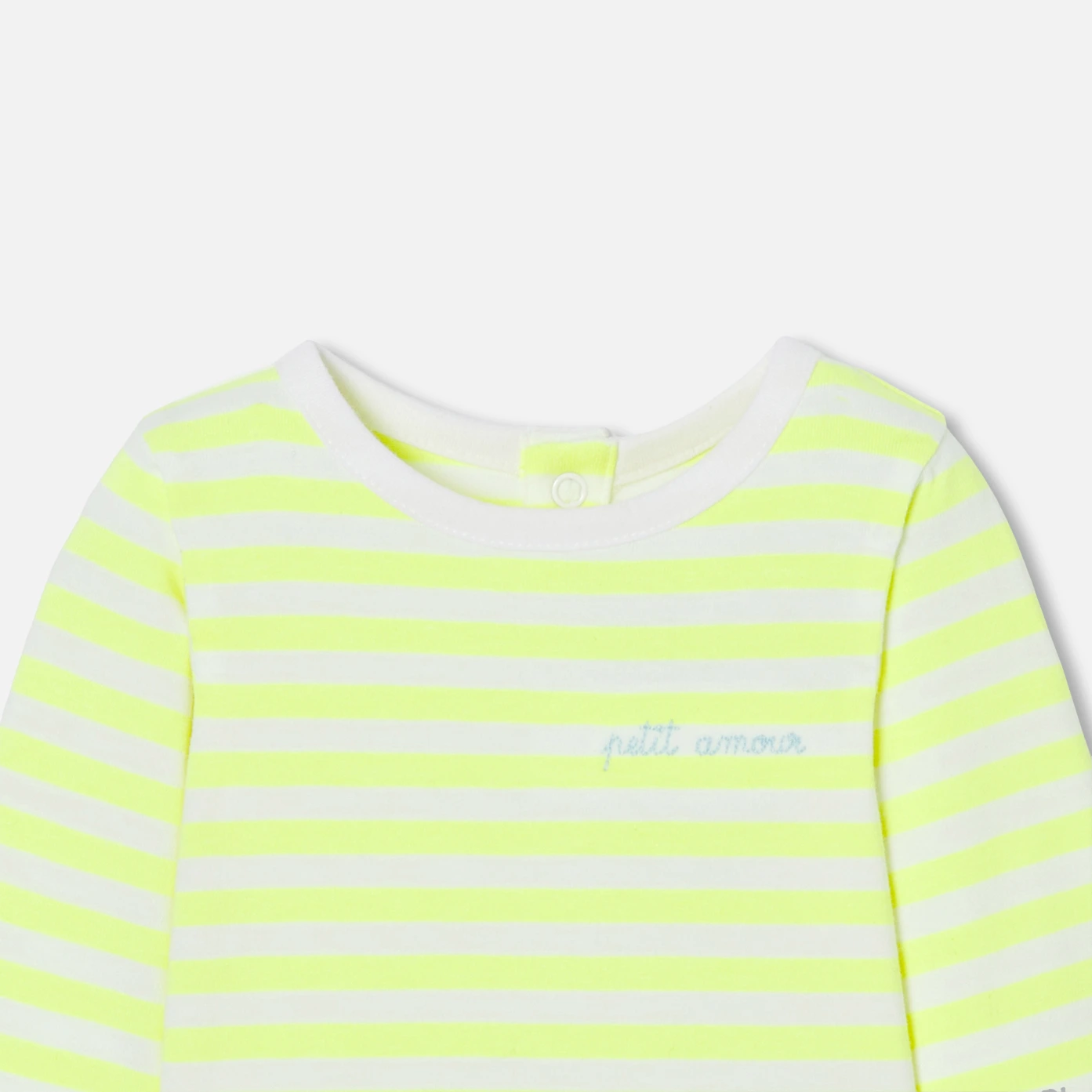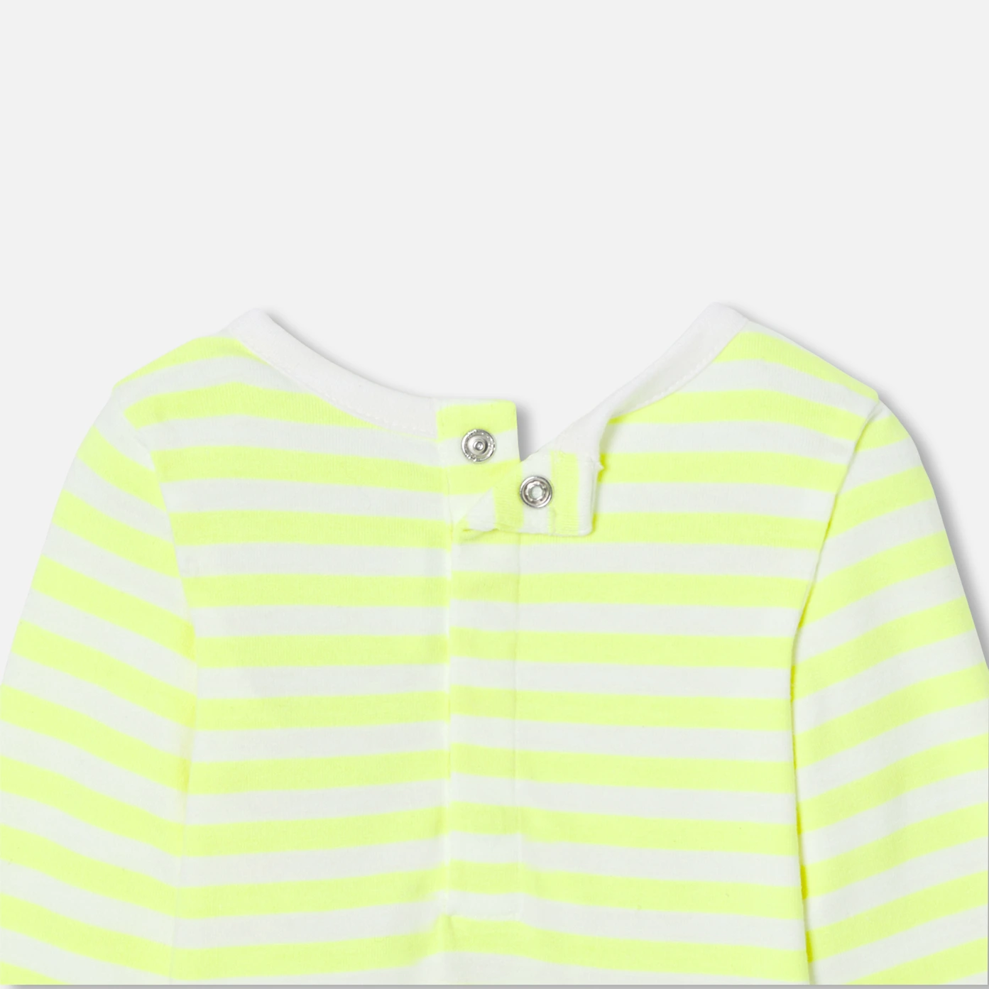 長袖連身衣採用橫條紋和大膽的螢光黃色,具有水手風格的感覺。此款式採用有機棉製成,正面有刺繡,可搭配吊帶褲或連身裝,將成為本季每次出遊旅行的最帥氣造成。