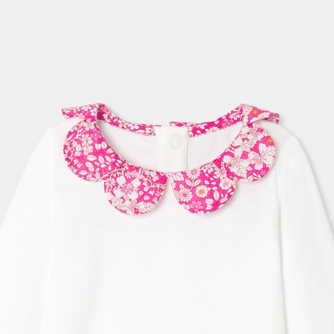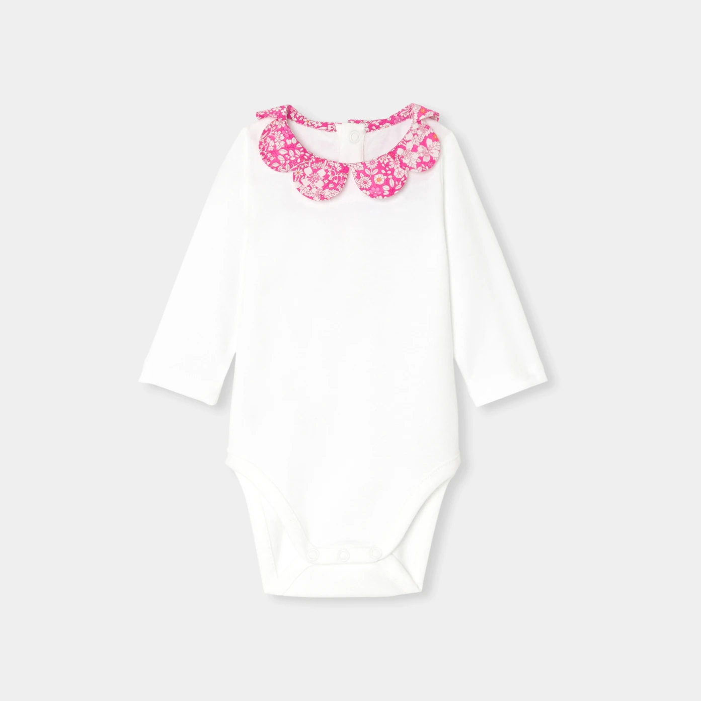 這款Jacadi經典設計的新生女嬰連身內衣,以有機棉製成,柔軟親膚,搭配幾何感十足的Liberty花瓣領,展現優雅魅力。背部與褲檔設有按釦,方便穿脫,無論搭配洋裝或連身裝都十分適合初秋季節穿著。