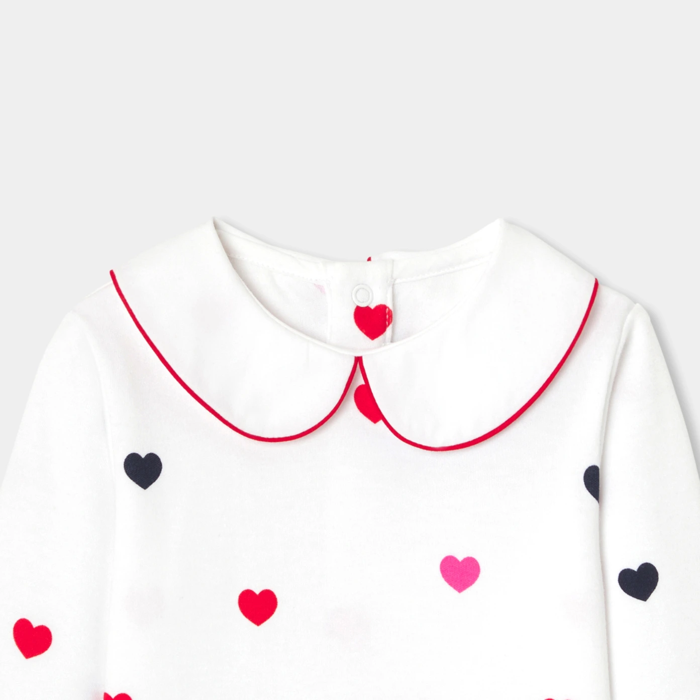 這款長袖女寶寶連身衣,帶來日常的俏麗與趣味感。採用柔軟舒適的雙面針織棉製成,點綴多彩愛心圖案,並以對比色滾邊的彼得潘領增添細節,可搭配天鵝絨短褲及方型針織衫,展現時髦輪廓。