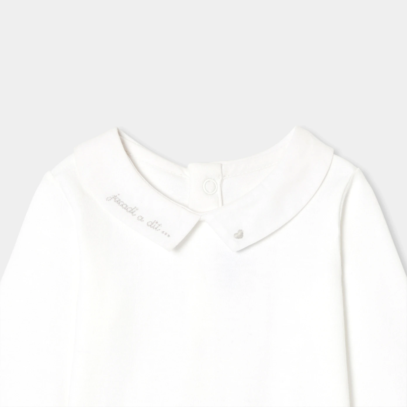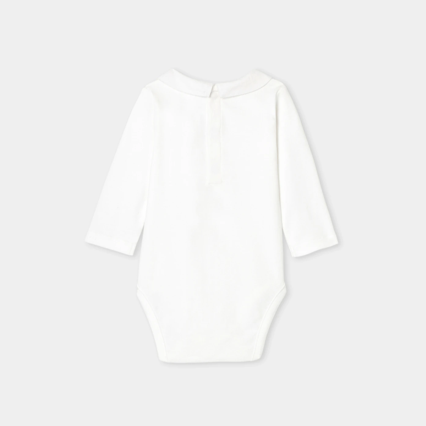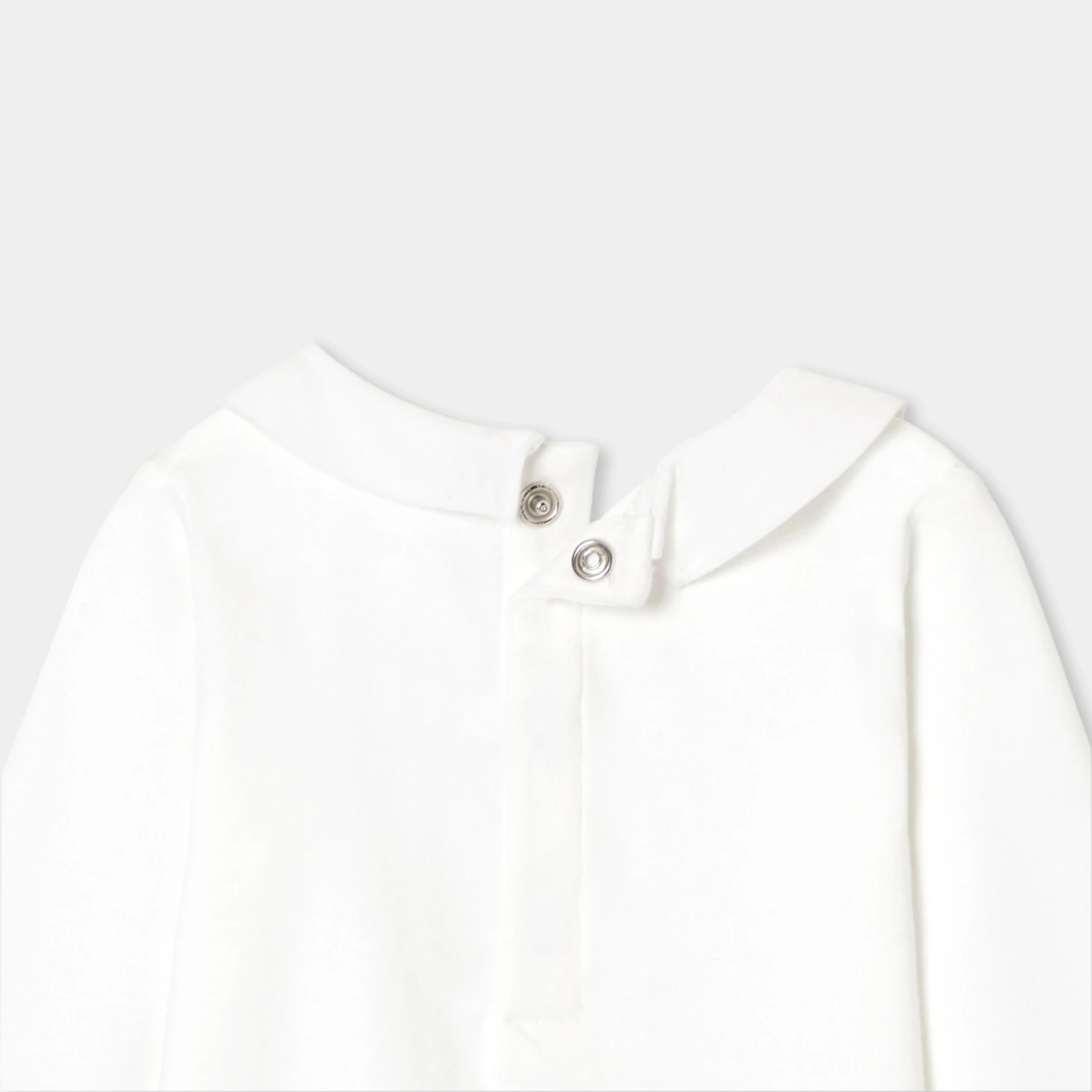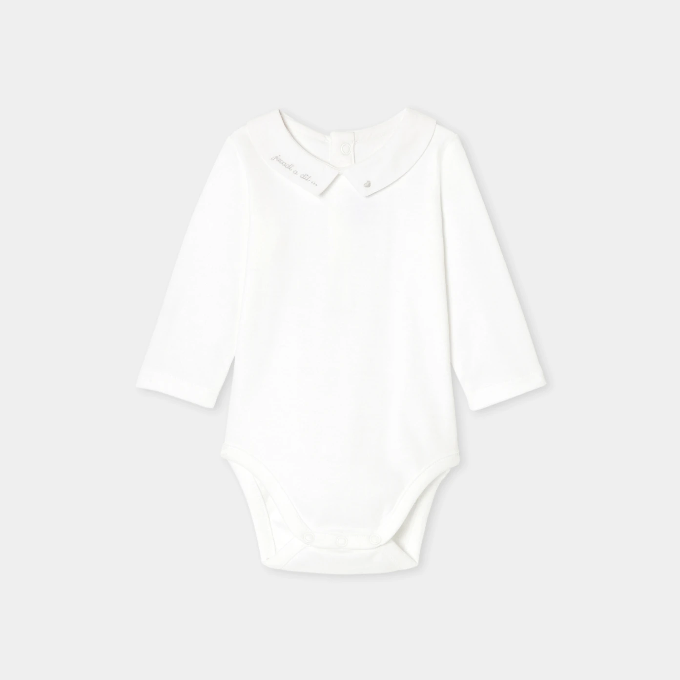 多用途且優雅,這款長袖嬰兒連身內衣採用柔軟舒適的有機棉製成。適合日常穿搭,搭配手工刺繡領片,是秋日外出搭配連身褲或針織套裝的理想選擇。