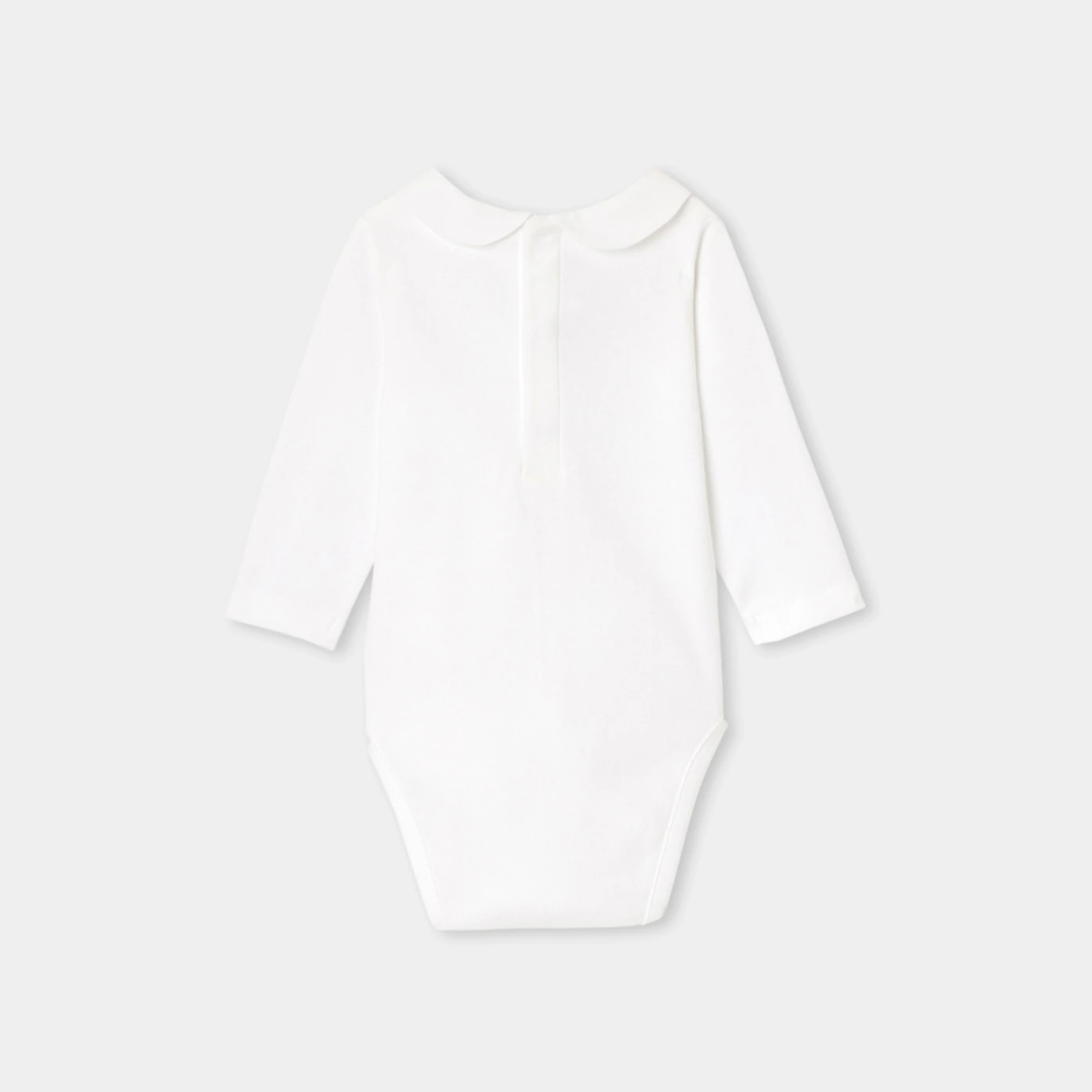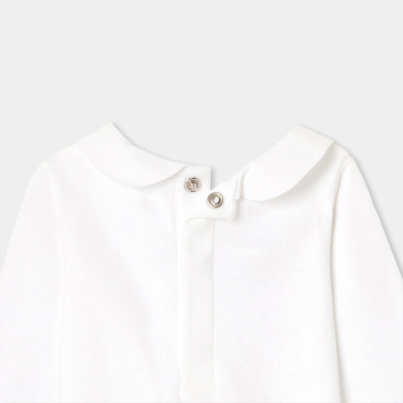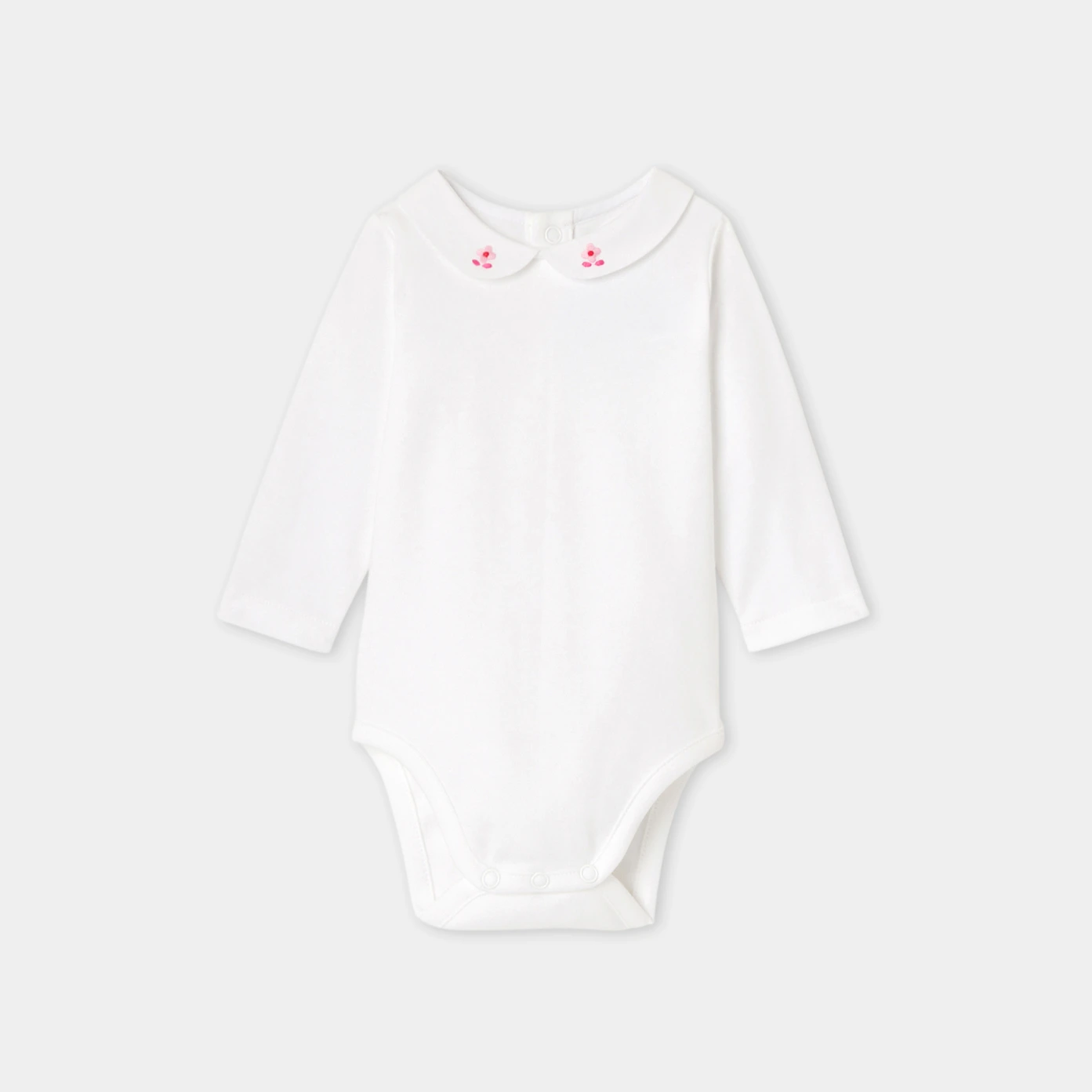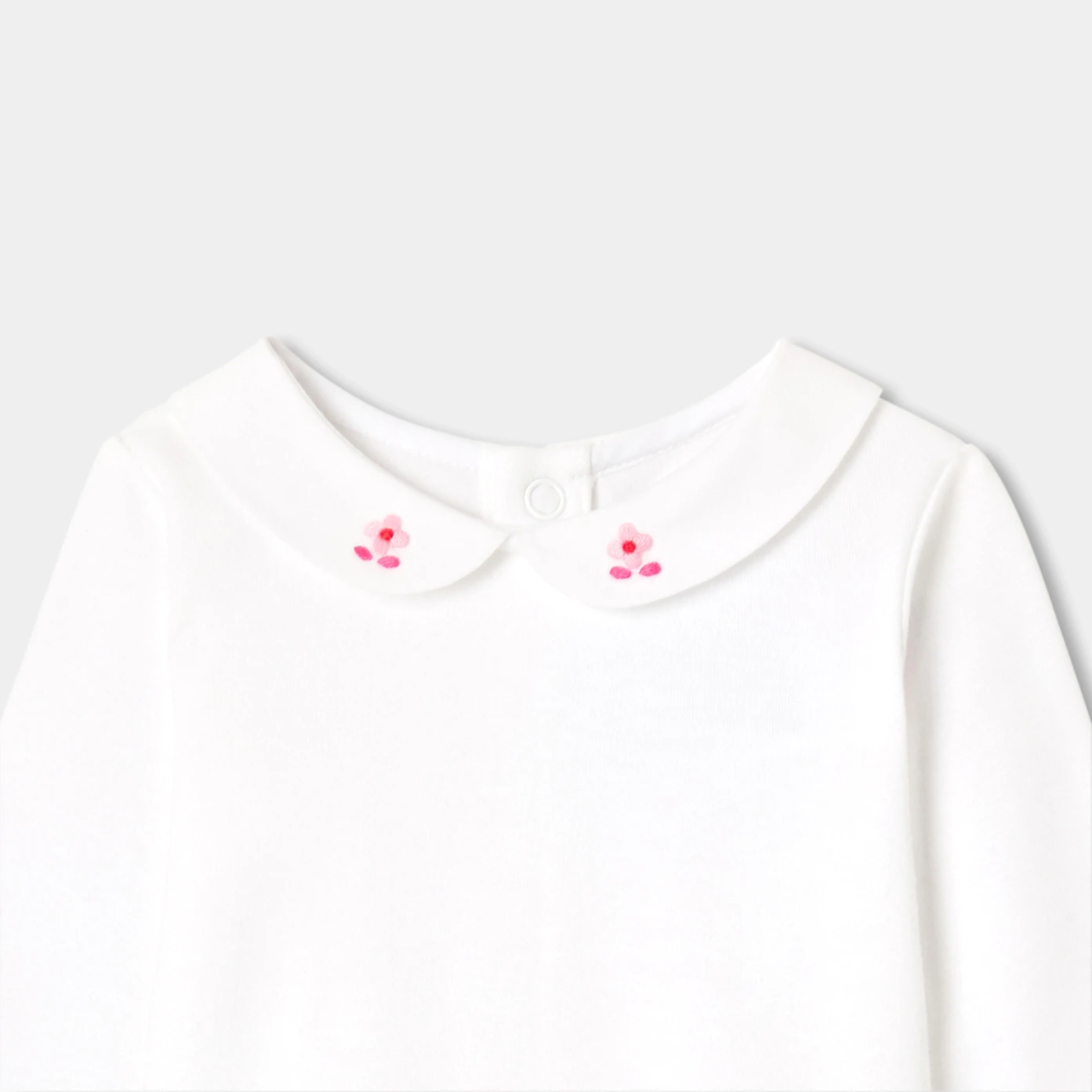 這款新生女嬰包屁衣是日常衣櫃的必備單品,選用柔軟有彈性的有機棉針織布製成。搭配手工刺繡花朵的彼得潘領,既時尚又百搭,可輕鬆穿搭於洋裝或吊帶褲內。
