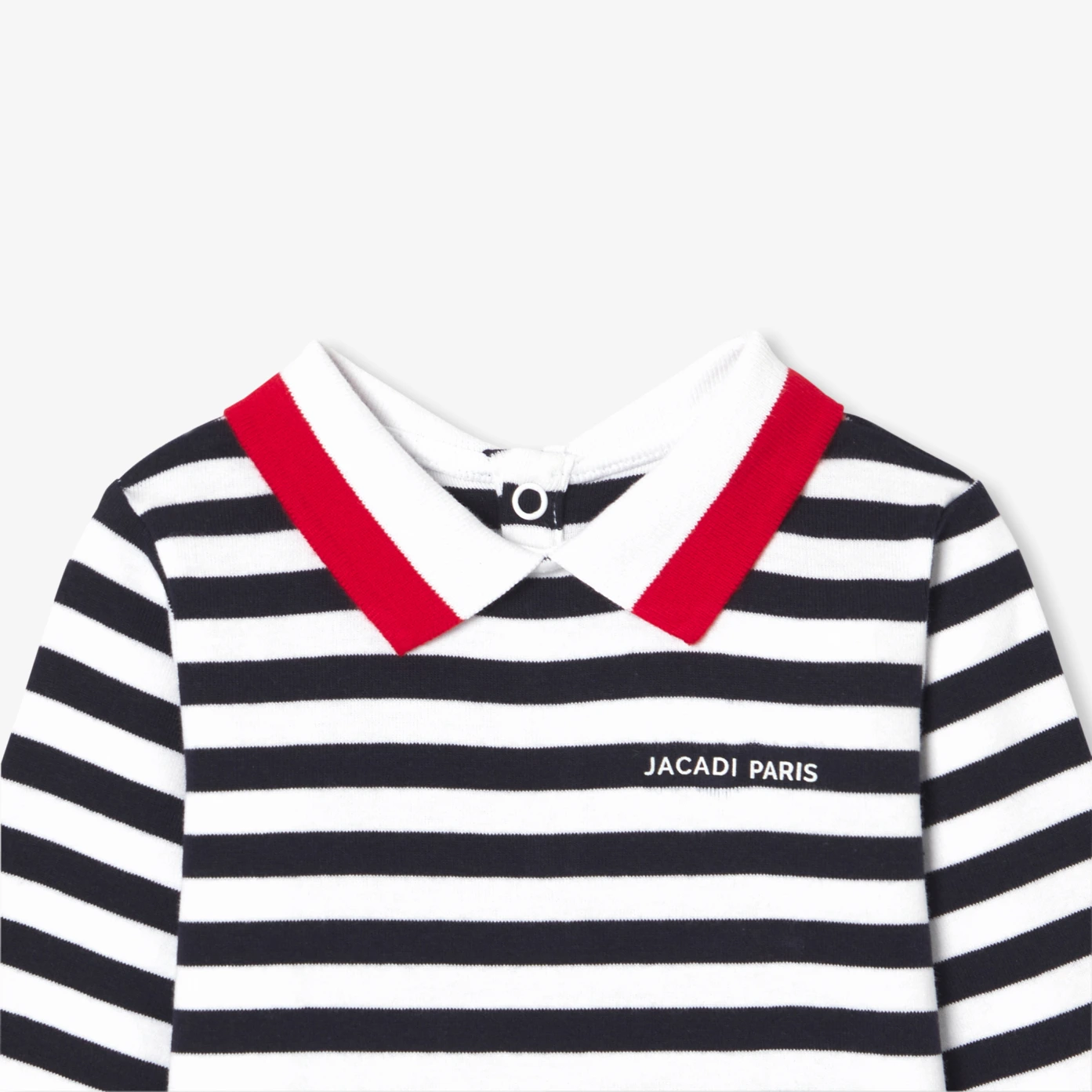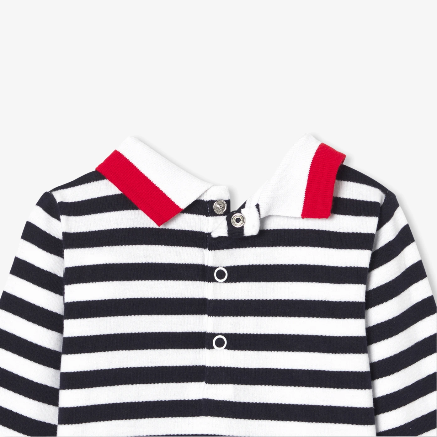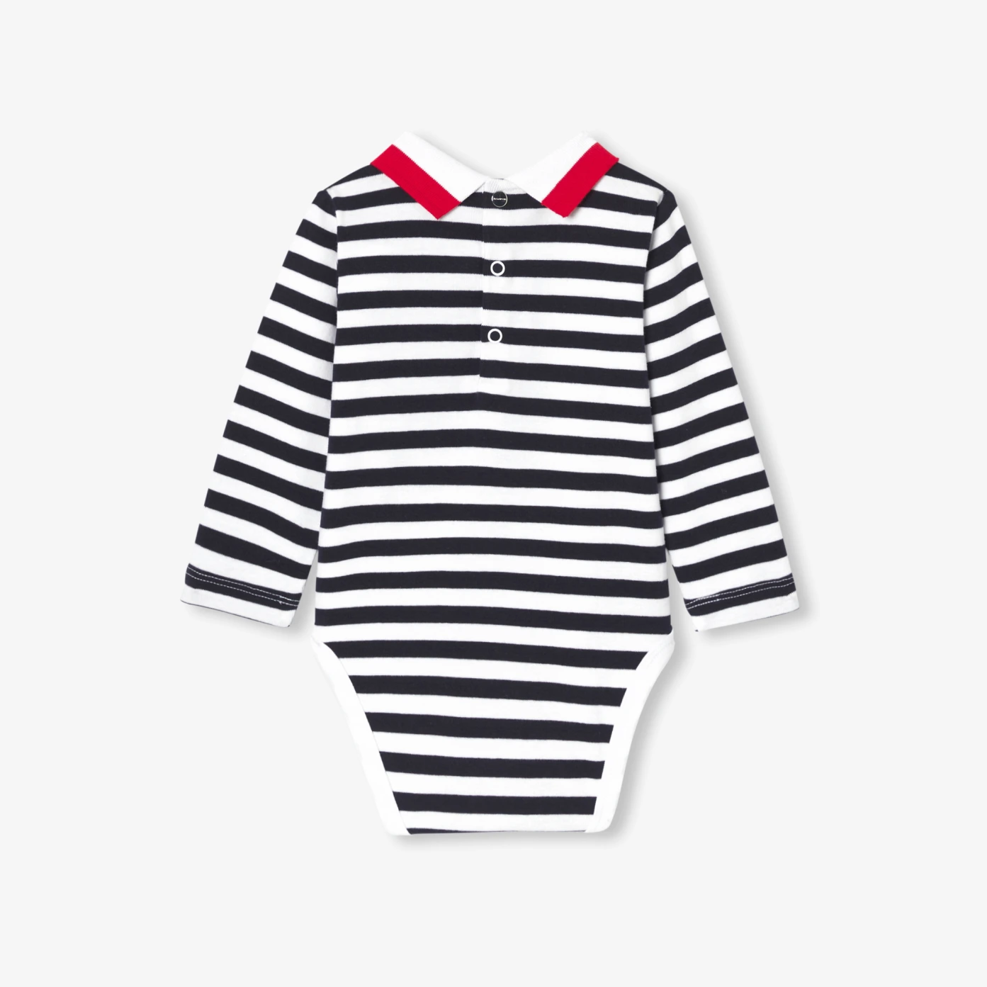 融合雙色羅紋領與經典條紋的Polo風格,這款男寶寶連身包屁衣以柔軟有彈性的有機棉製成。無論搭配牛仔褲或吊帶褲,都能展現運動感與優雅兼具的造型。背部與襠部皆設有按釦,方便穿脫,是寶寶衣櫥中的百搭單品。
