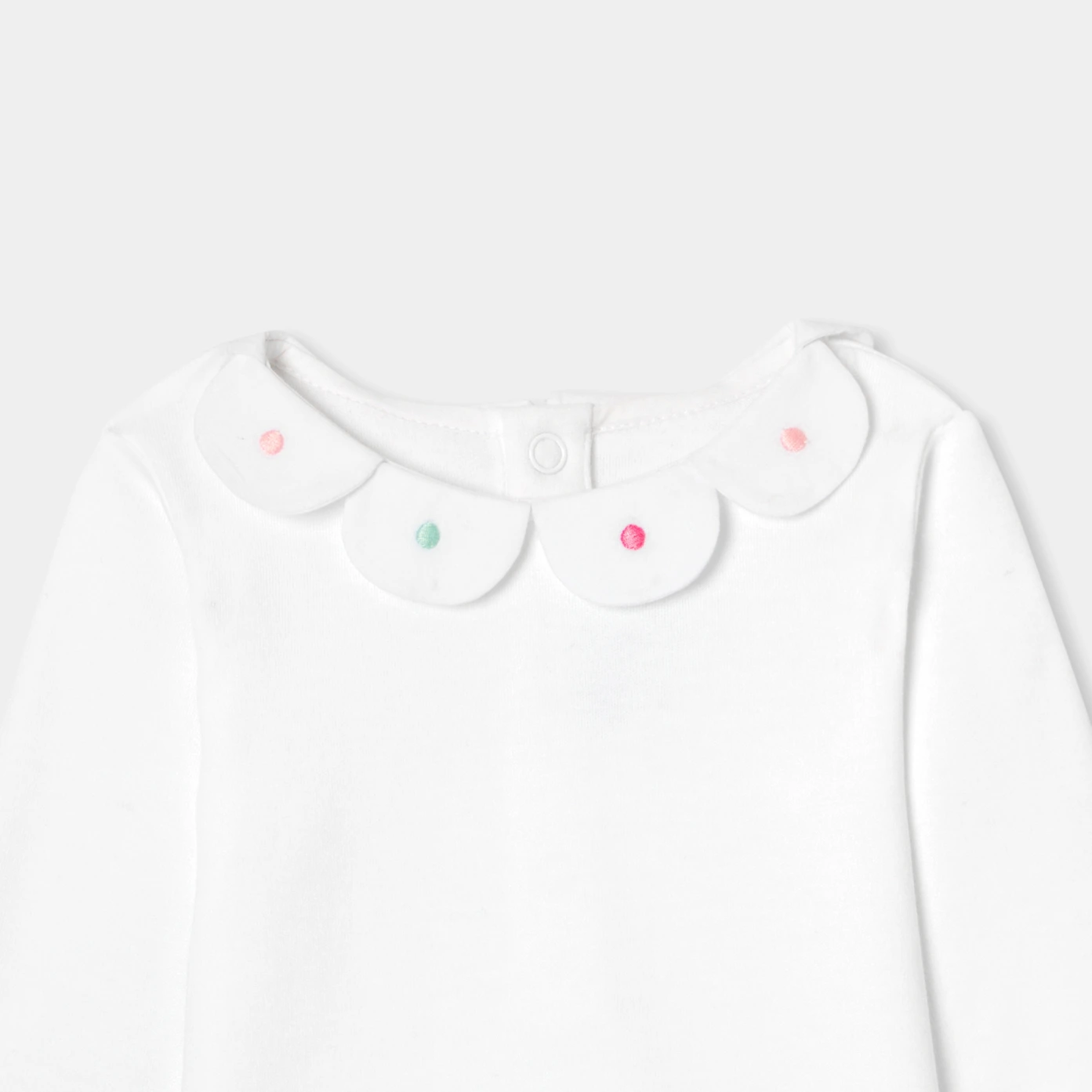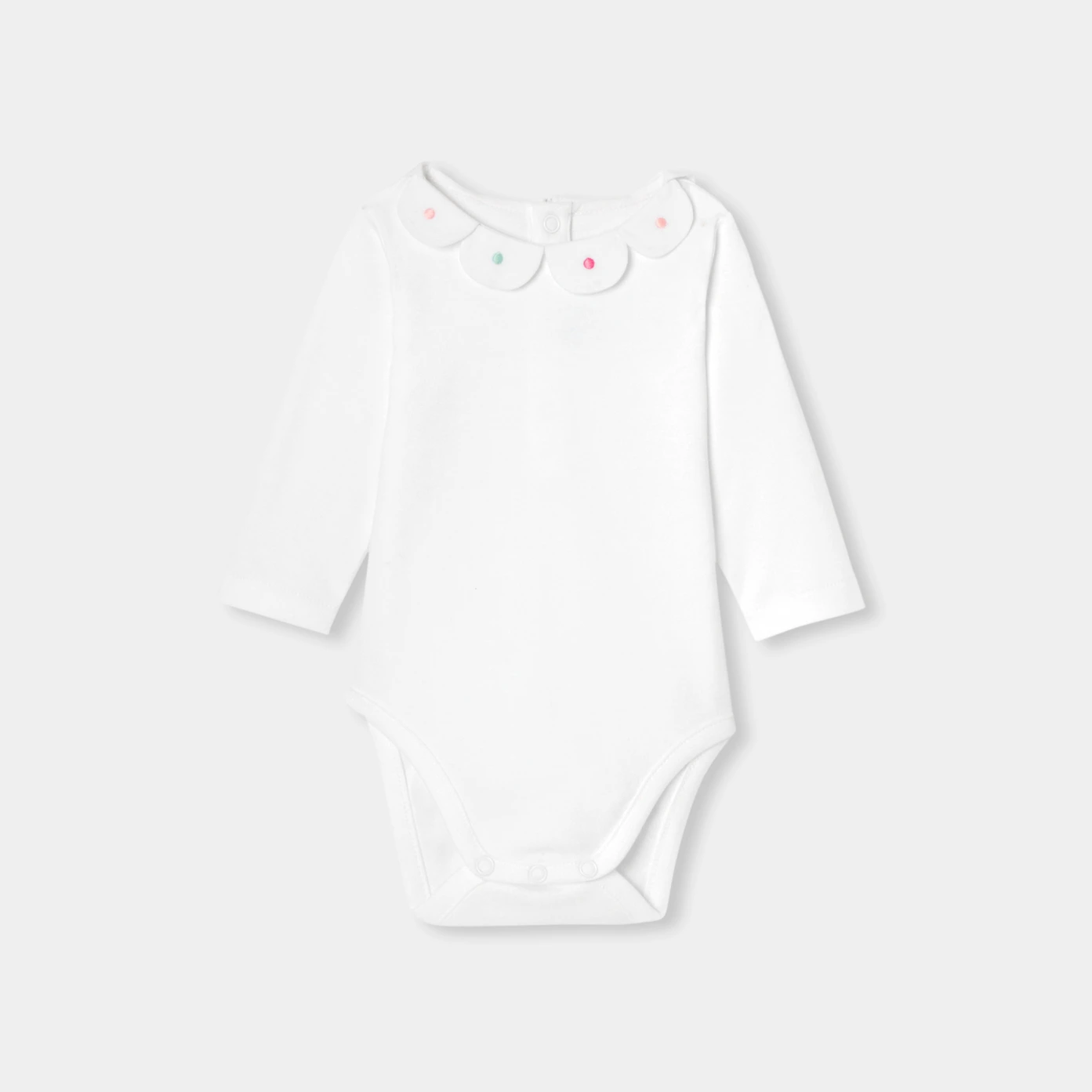 這款象徵 Jacadi 經典風格的新生女嬰連身衣,以柔美的花瓣領設計點綴秋日造型。採用柔軟親膚的有機棉製成,長袖剪裁適合初秋單穿或搭配 Liberty 印花背心裙或是吊帶褲,為日常穿搭增添法式優雅氣息。