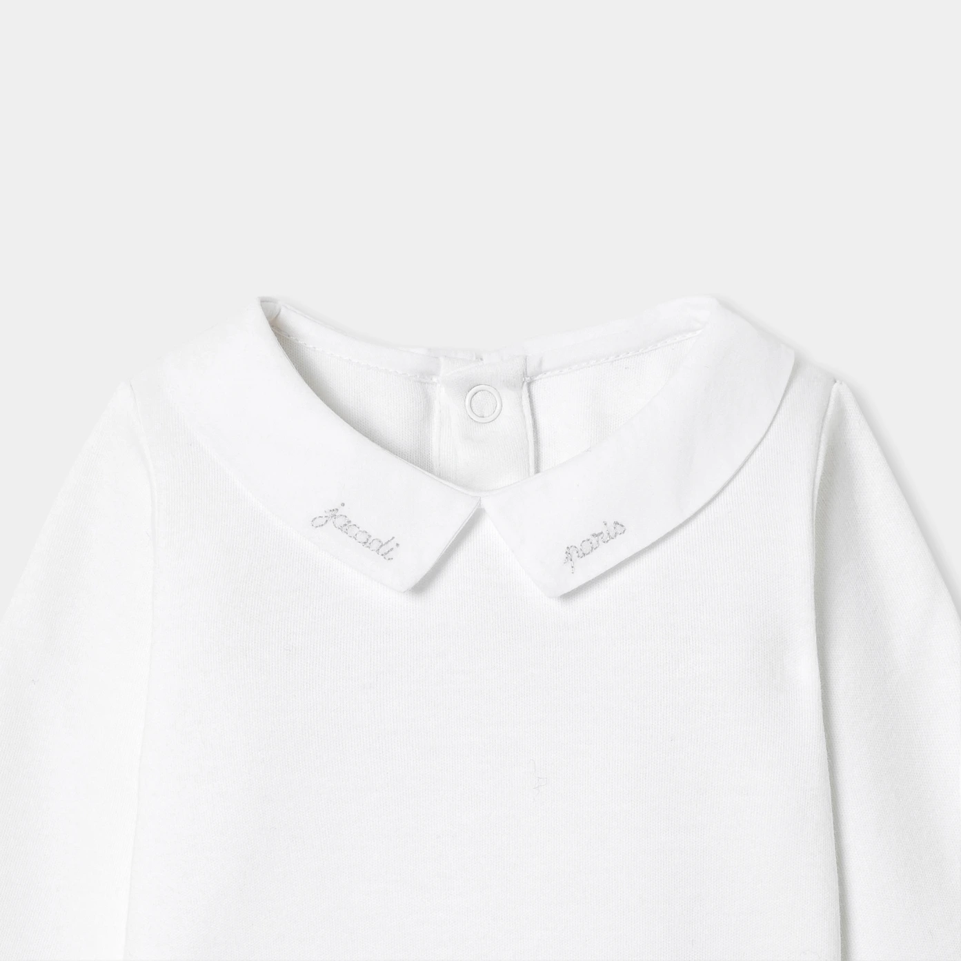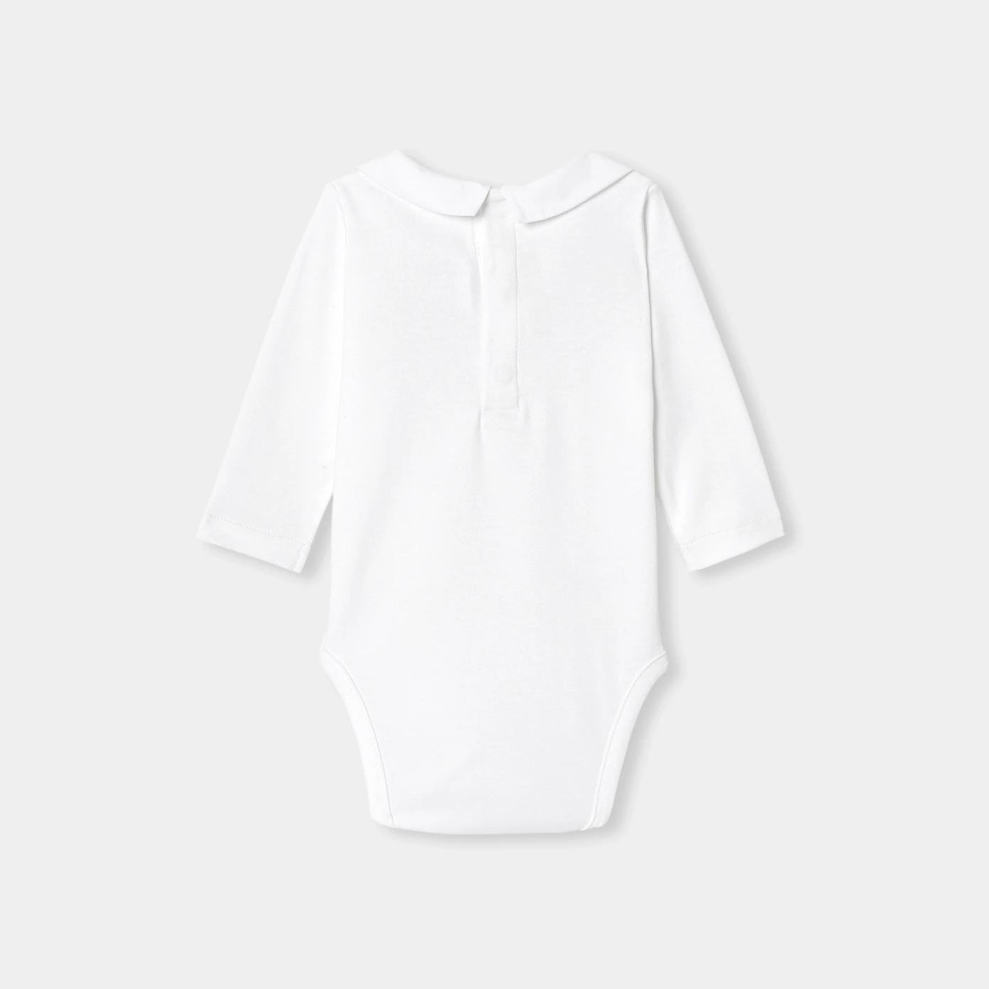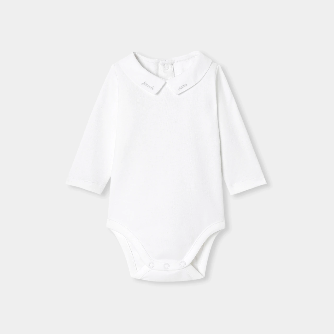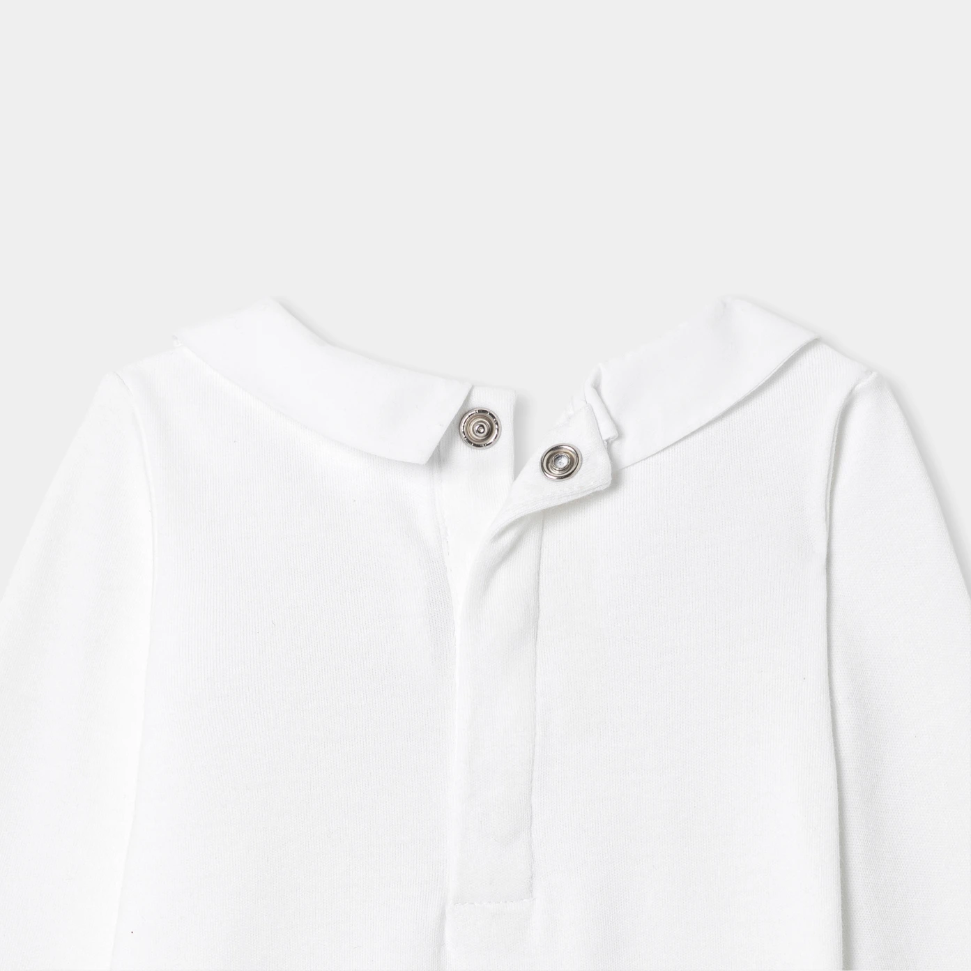 這款新生男嬰長袖連身衣選用有機棉製作,質地柔軟舒適,是日常衣櫥中的必備單品。簡潔俐落的設計搭配手工刺繡棉質領口,展現細膩優雅的格調。兼具舒適性與精緻細節,無論日常穿搭或作為出生禮皆合適。