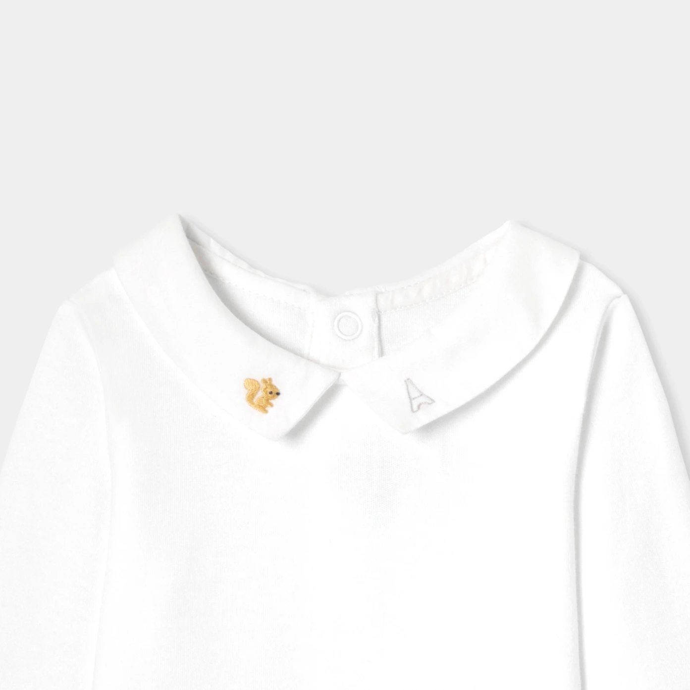 這款新生兒連身衣,以柔軟親膚的有機棉製成,搭配手工刺繡的純棉布領口,細緻呈現松鼠與巴黎鐵塔圖案,充滿巴黎的詩意感又高雅。長袖設計適合多季節穿著,背部與襠部的按釦開合方便日常穿脫,可搭配同系列連身裝,營造出精緻雅緻的造型。