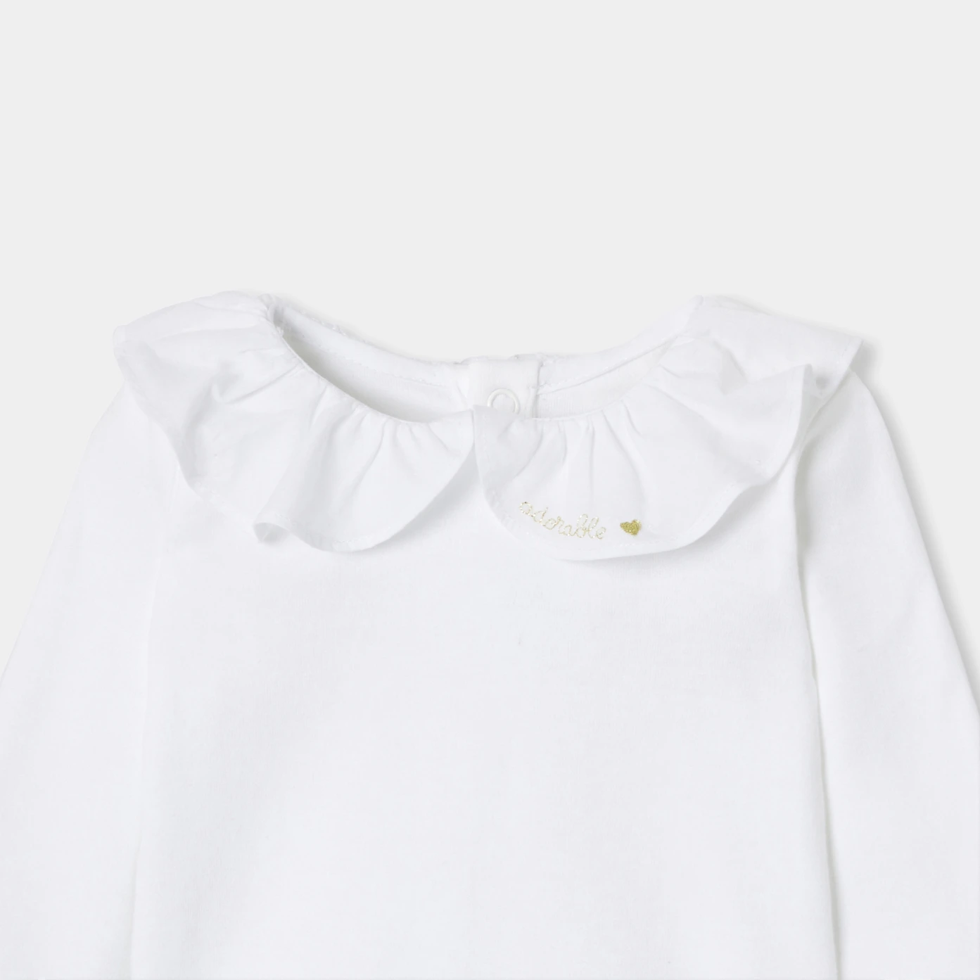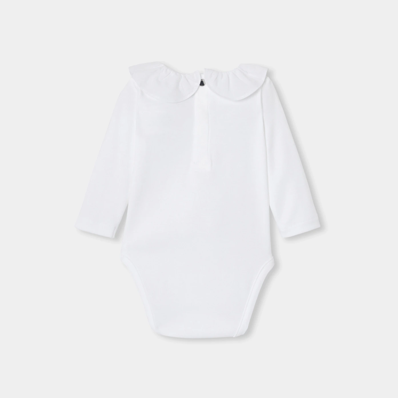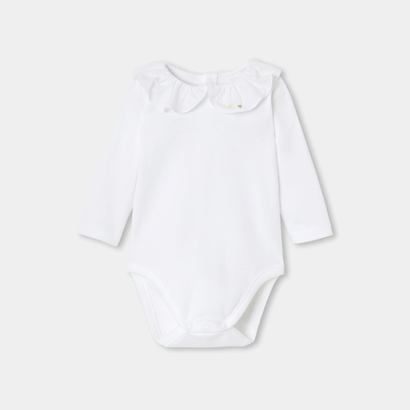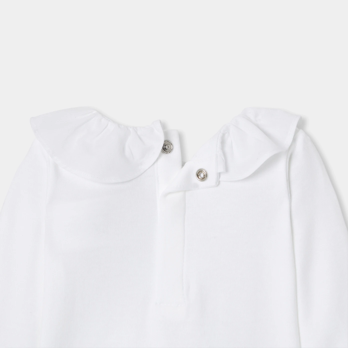 展現日常優雅氣息,這款新生女連身內衣以刺繡領飾點綴,寫上溫柔語句與小愛心圖案,充滿詩意與童趣。採用柔軟有彈性的有機棉製成,舒適好穿,可與 Liberty 花布燈籠褲或吊帶褲搭配,打造精緻的法式造型。