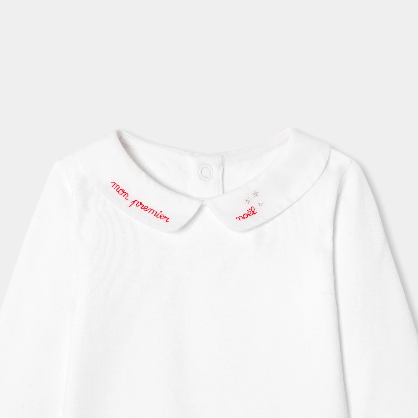 以柔軟彈性的棉質布料製成,這款寶寶長袖連身衣專為寶寶的第一個聖誕節而設計。襯衫式織布領口以手工刺繡點綴「My first Christmas」溫馨字樣,細膩展現節慶儀式感。聖誕夜可搭配吊帶褲穿著,展現與家中大人同樣優雅的造型風格。