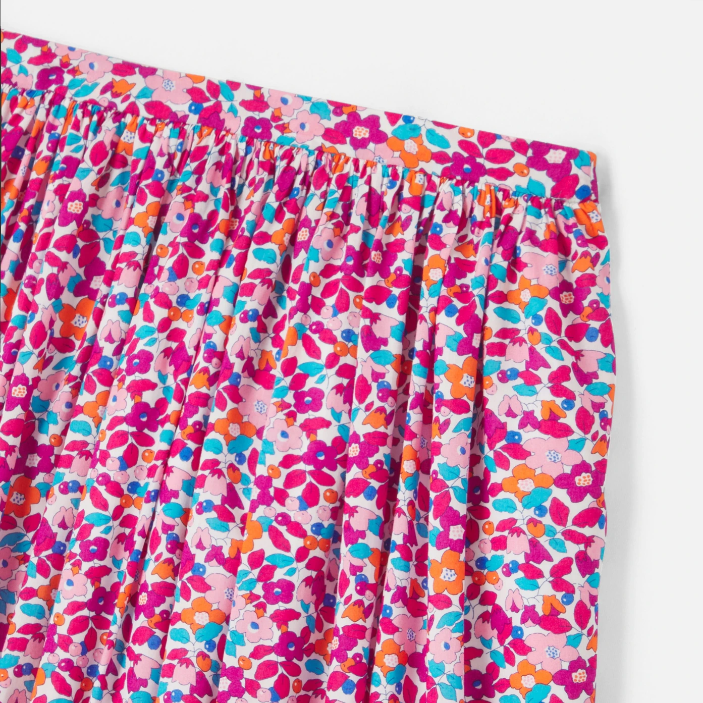 這款女孩半身裙採用 Liberty 面料製成,內襯棉質,預告著夏日多彩的季節即將來臨。腰部褶皺,可調節腰頭設計,可搭配平織上衣和涼鞋。