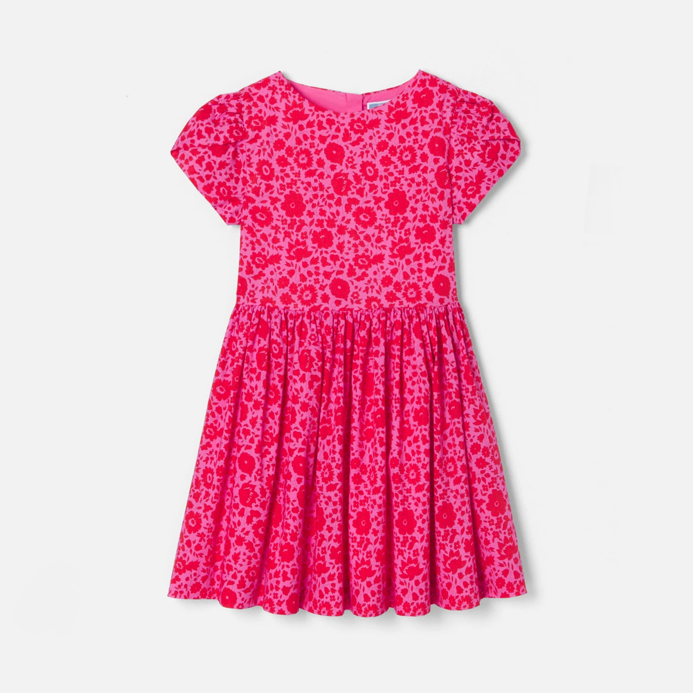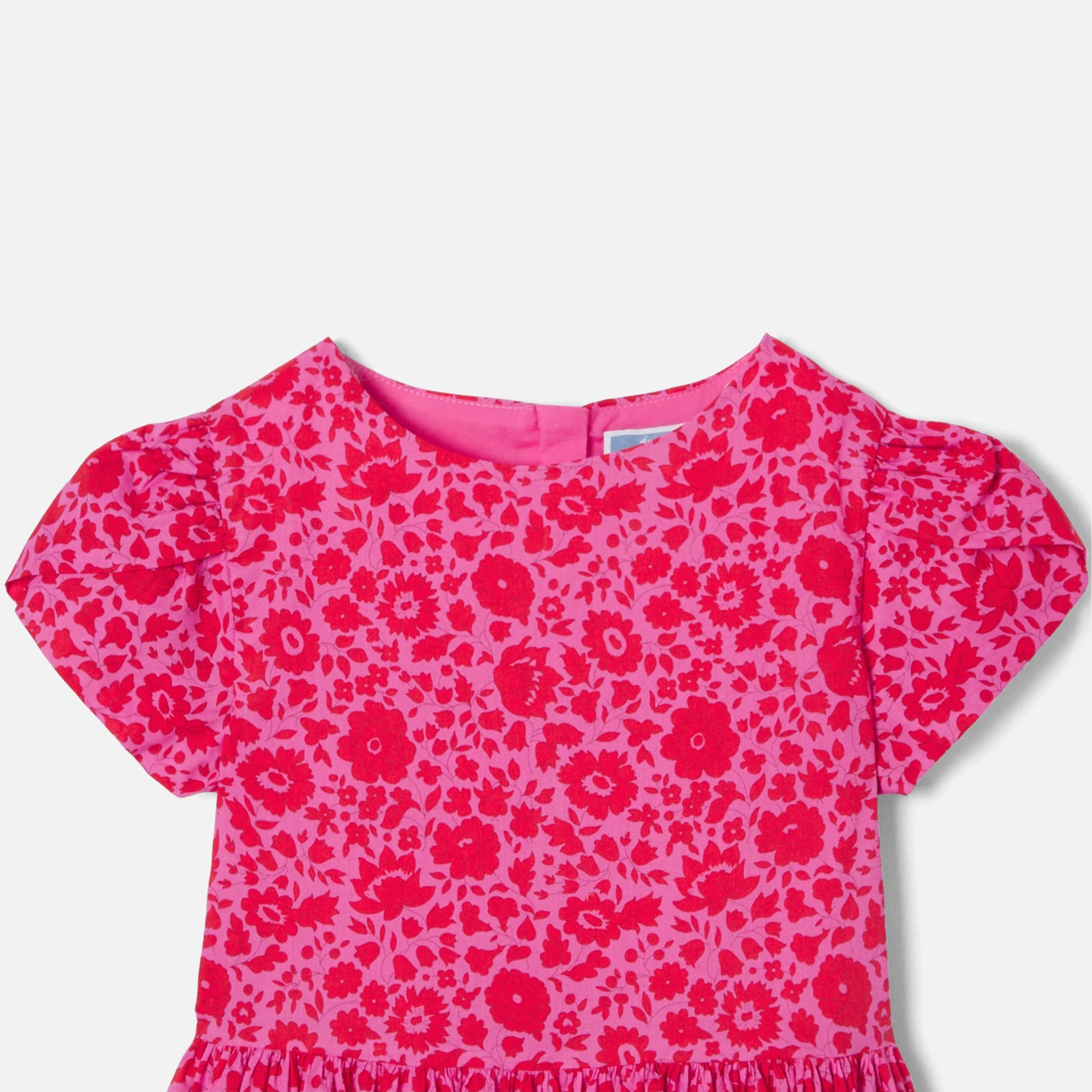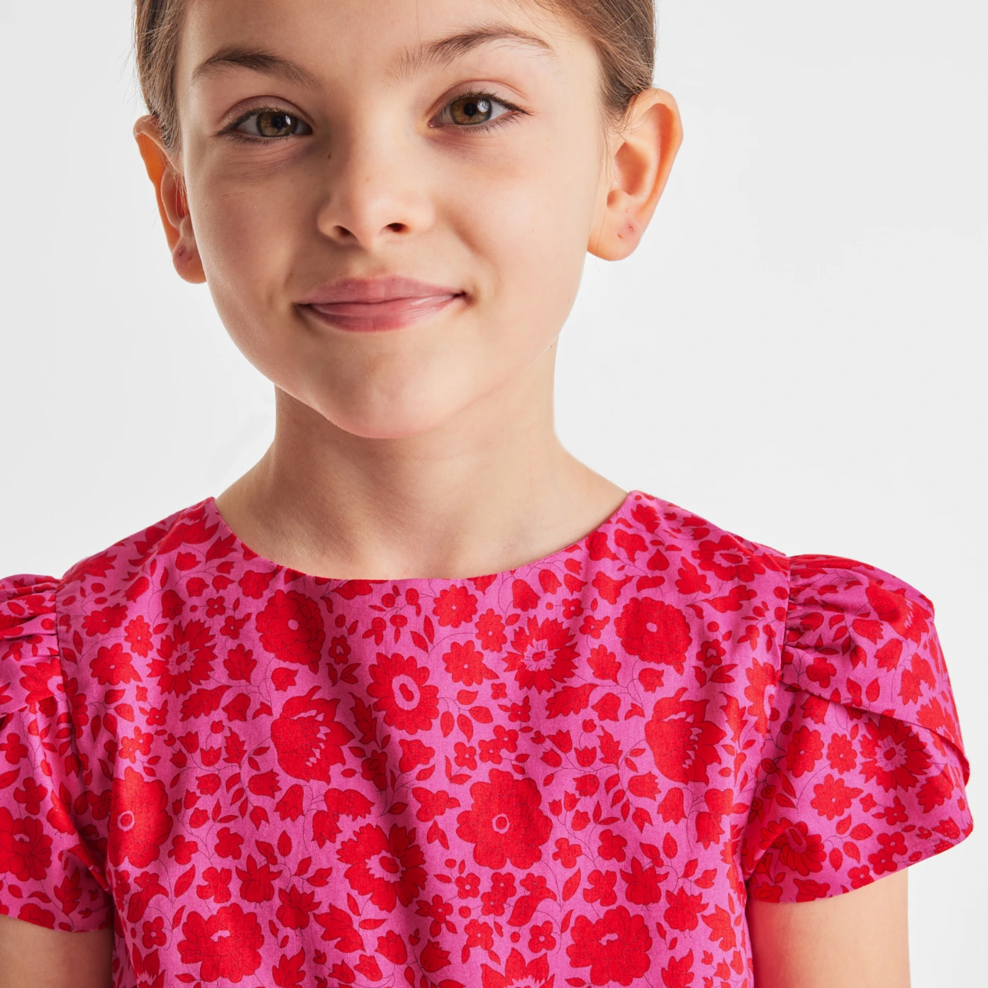 這款女孩洋裝採用雙色 Liberty 面料,透過精緻剪裁展現法式風情。短袖設計,腰部褶皺,棉質襯裡為這款別緻的單品畫上完美句號。