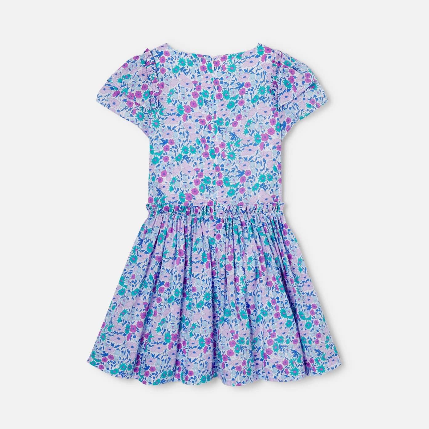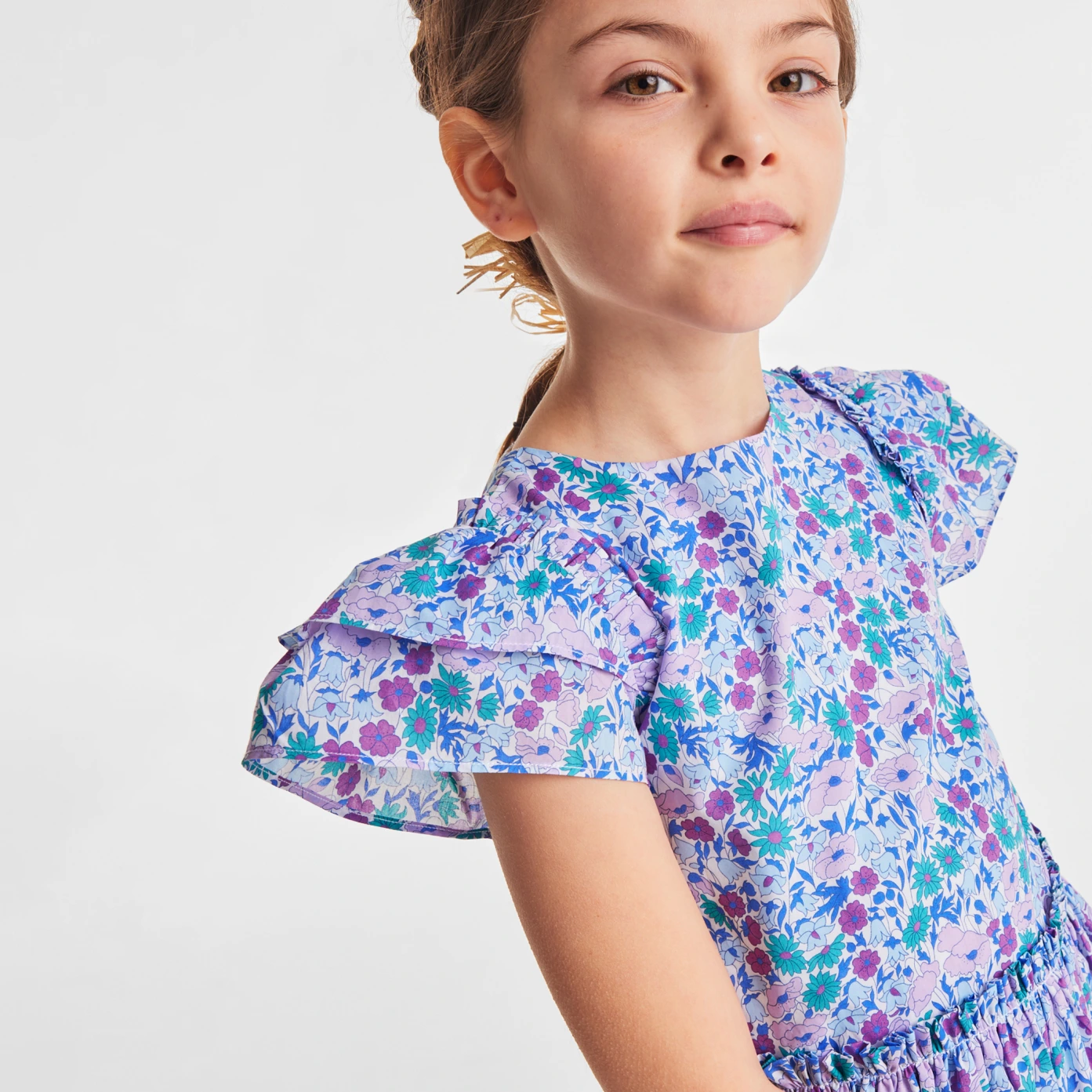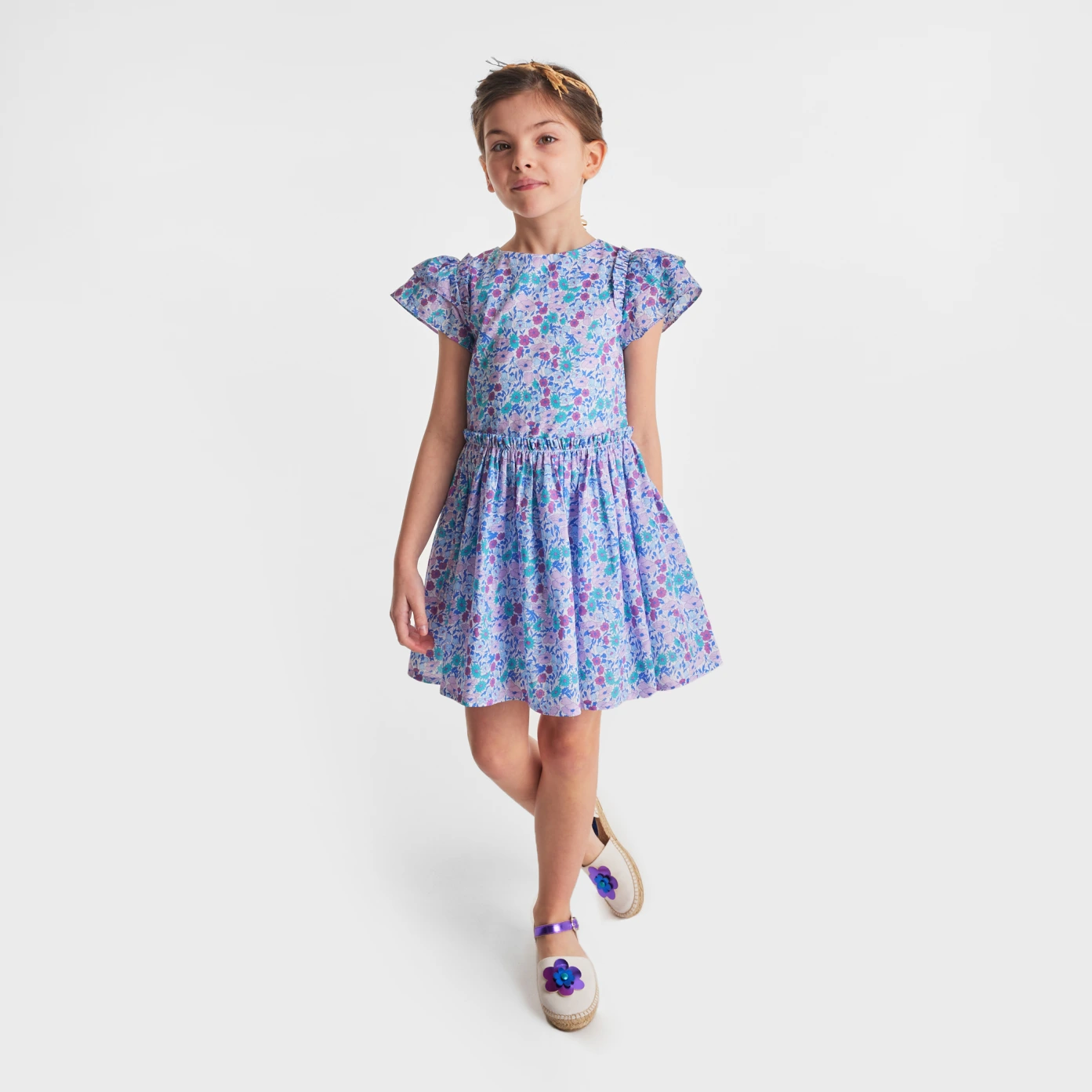 這件女孩洋裝充滿了別緻的細節。充滿南法薰衣草色系的Liberty 面料,飾有荷葉邊袖子,腰部褶皺,營造出漂亮的裙擺,棉質襯裡使這款Liberty洋裝更舒適,可以與配套髮夾搭配更顯法式時尚。