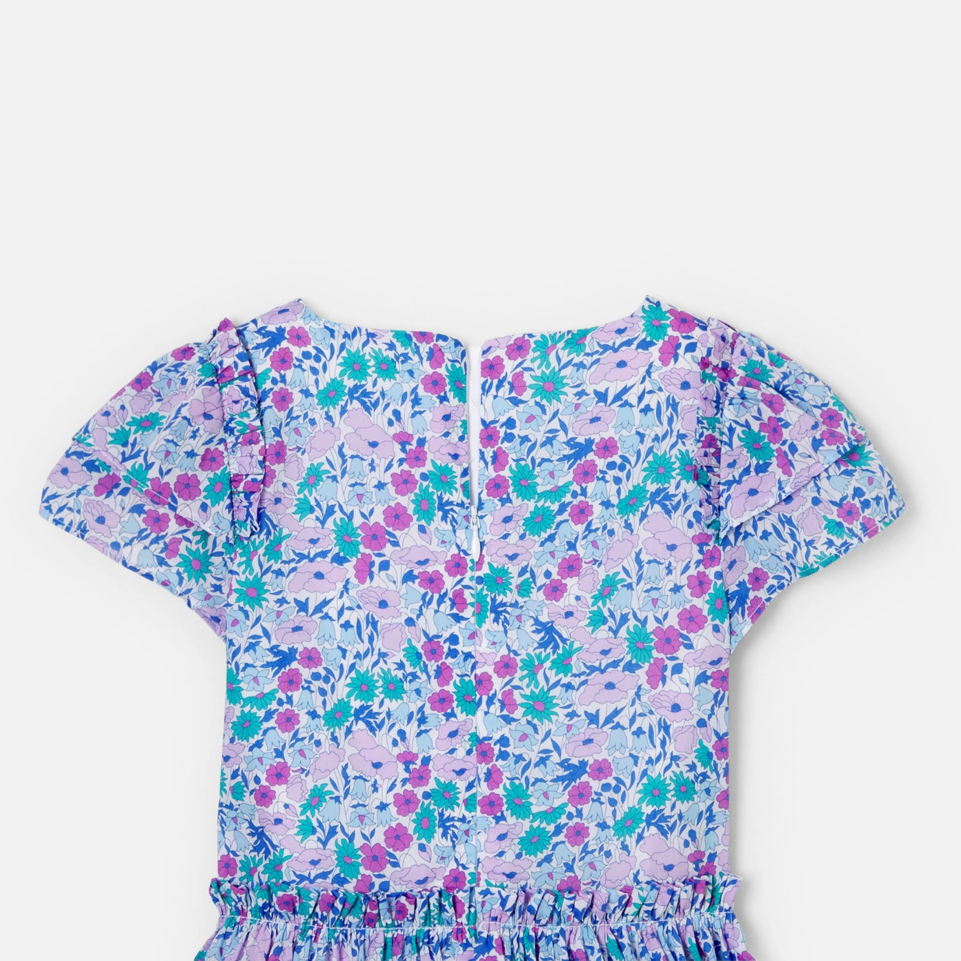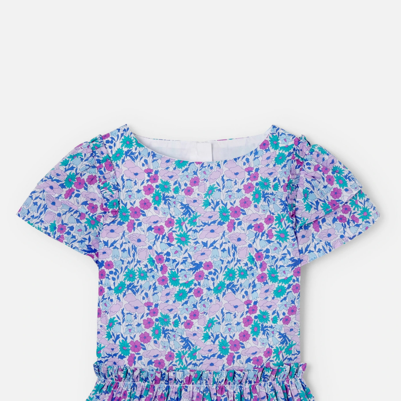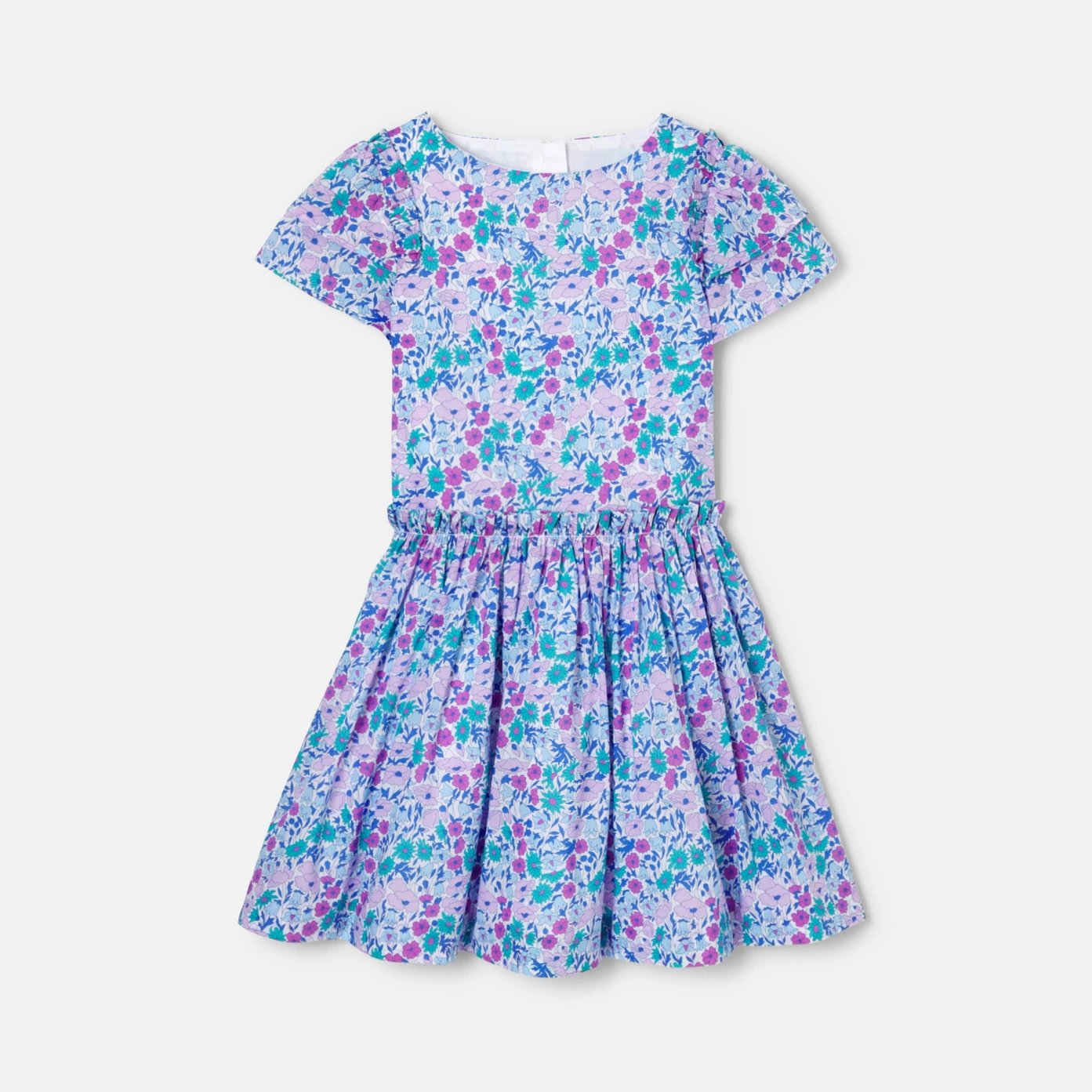 這件女孩洋裝充滿了別緻的細節。充滿南法薰衣草色系的Liberty 面料,飾有荷葉邊袖子,腰部褶皺,營造出漂亮的裙擺,棉質襯裡使這款Liberty洋裝更舒適,可以與配套髮夾搭配更顯法式時尚。