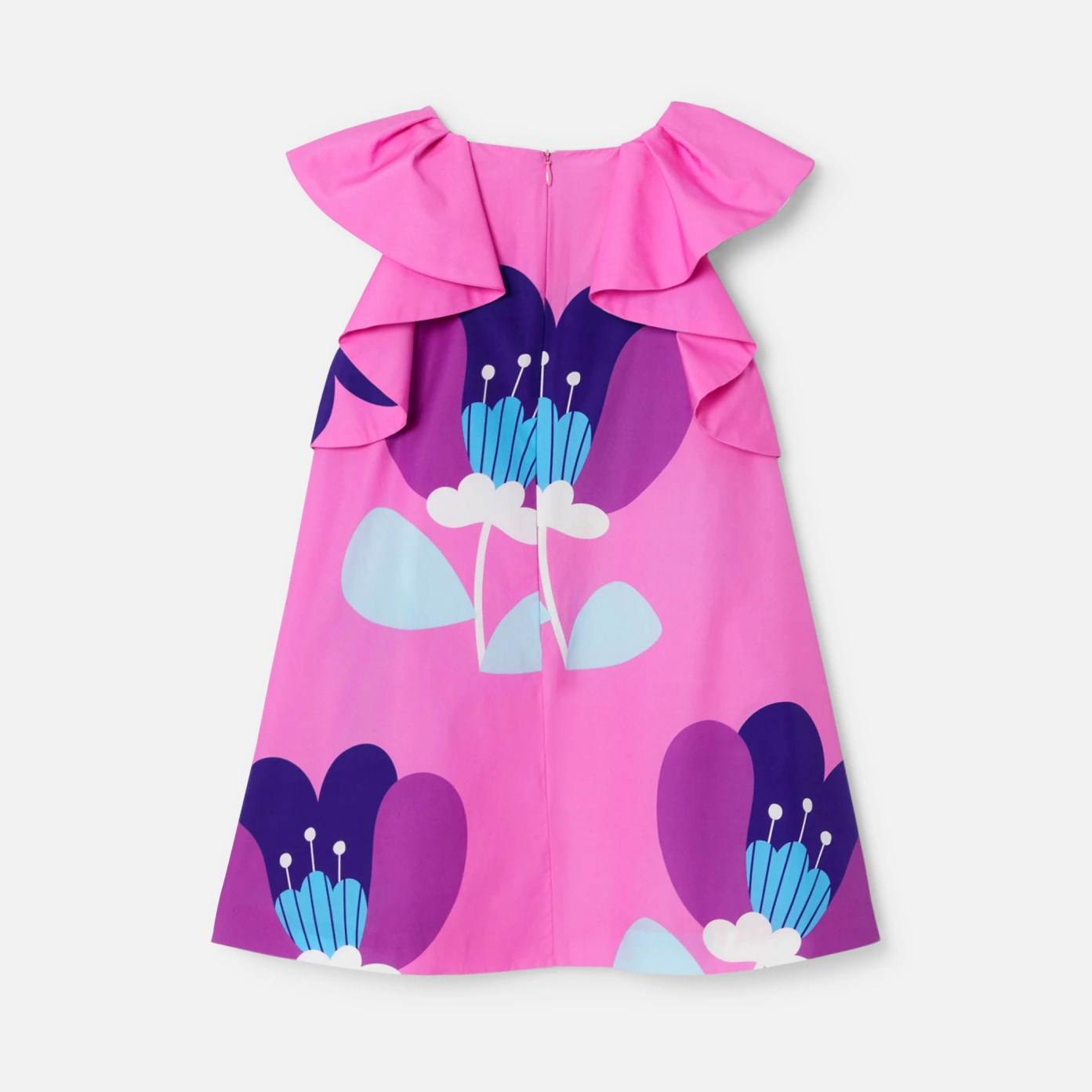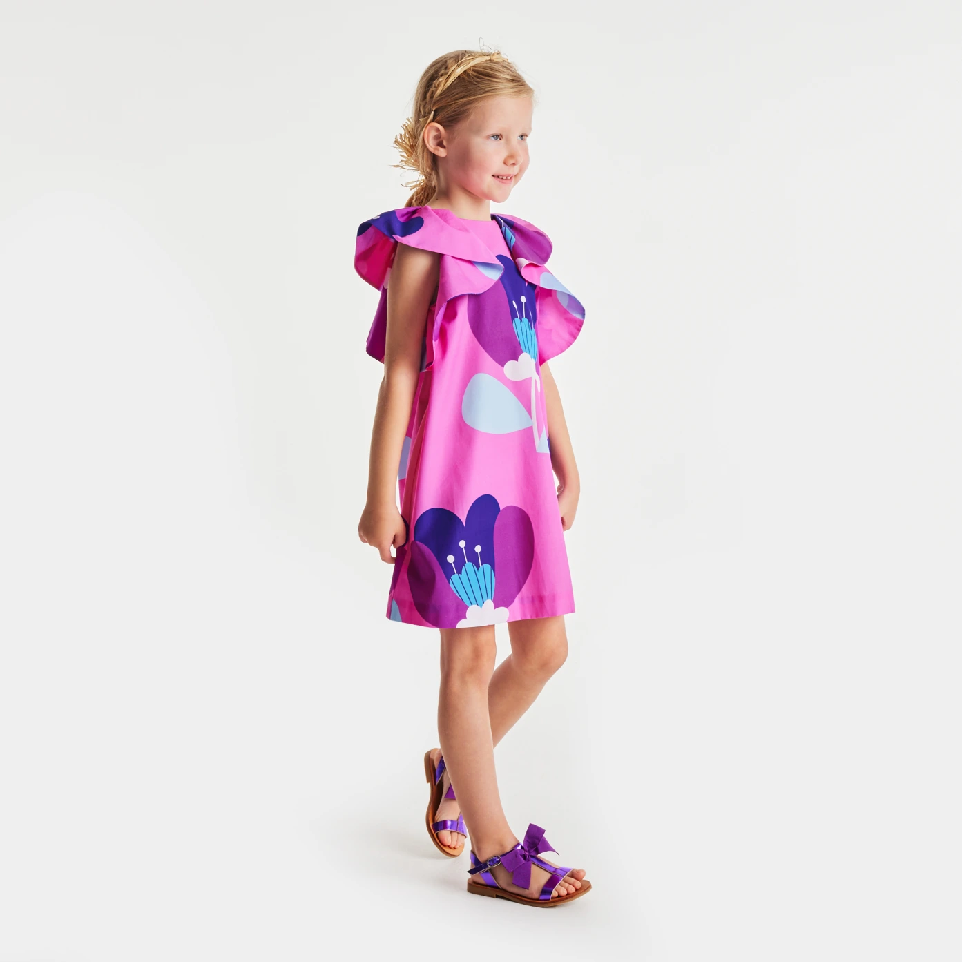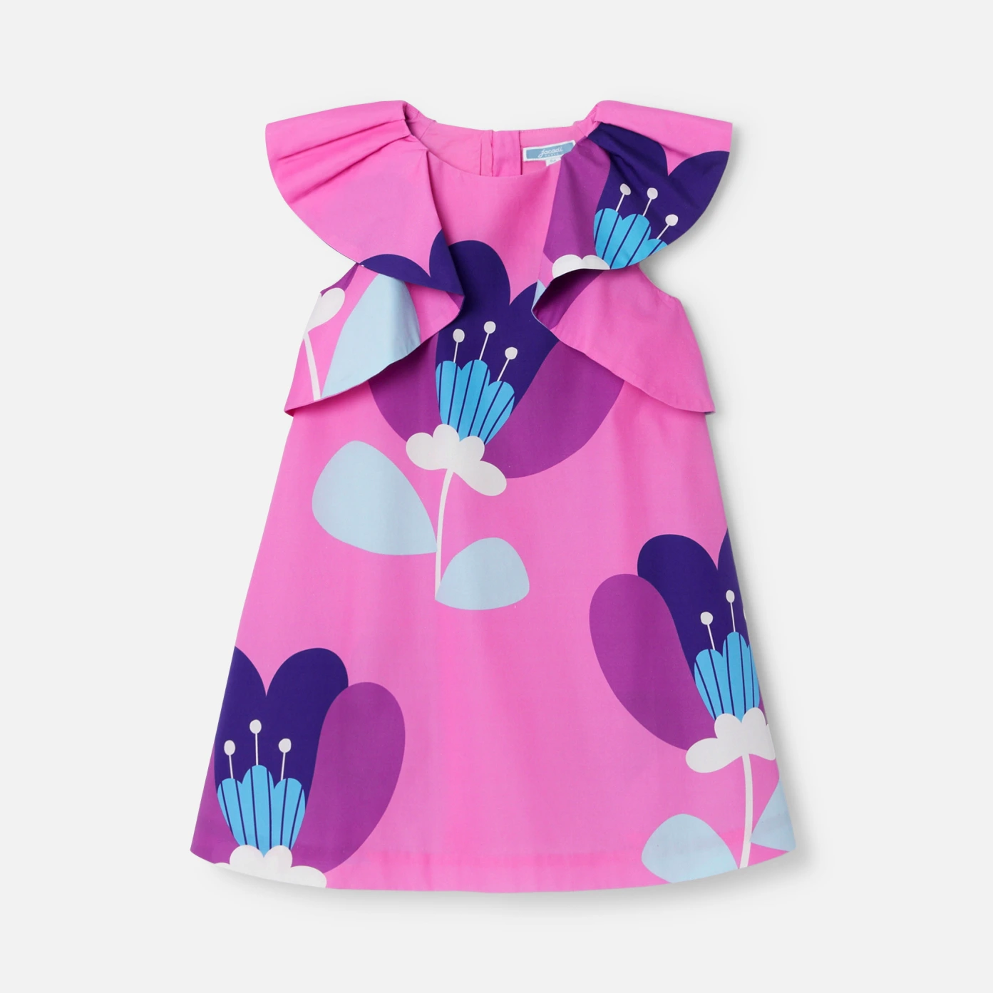 這款女童洋裝採用寬大的荷葉邊袖孔,具有現代美感,將您帶入一個現代、多彩的世界。採用柔軟纖細府綢製成,印有超大花朵圖案,搭配帽子和涼鞋,盡享夏季。