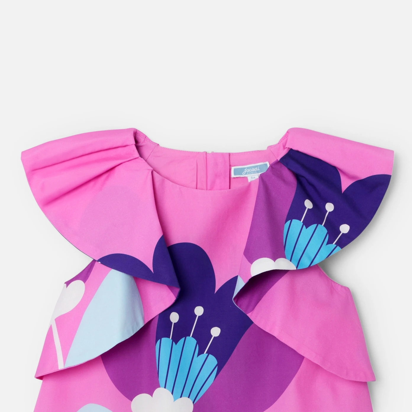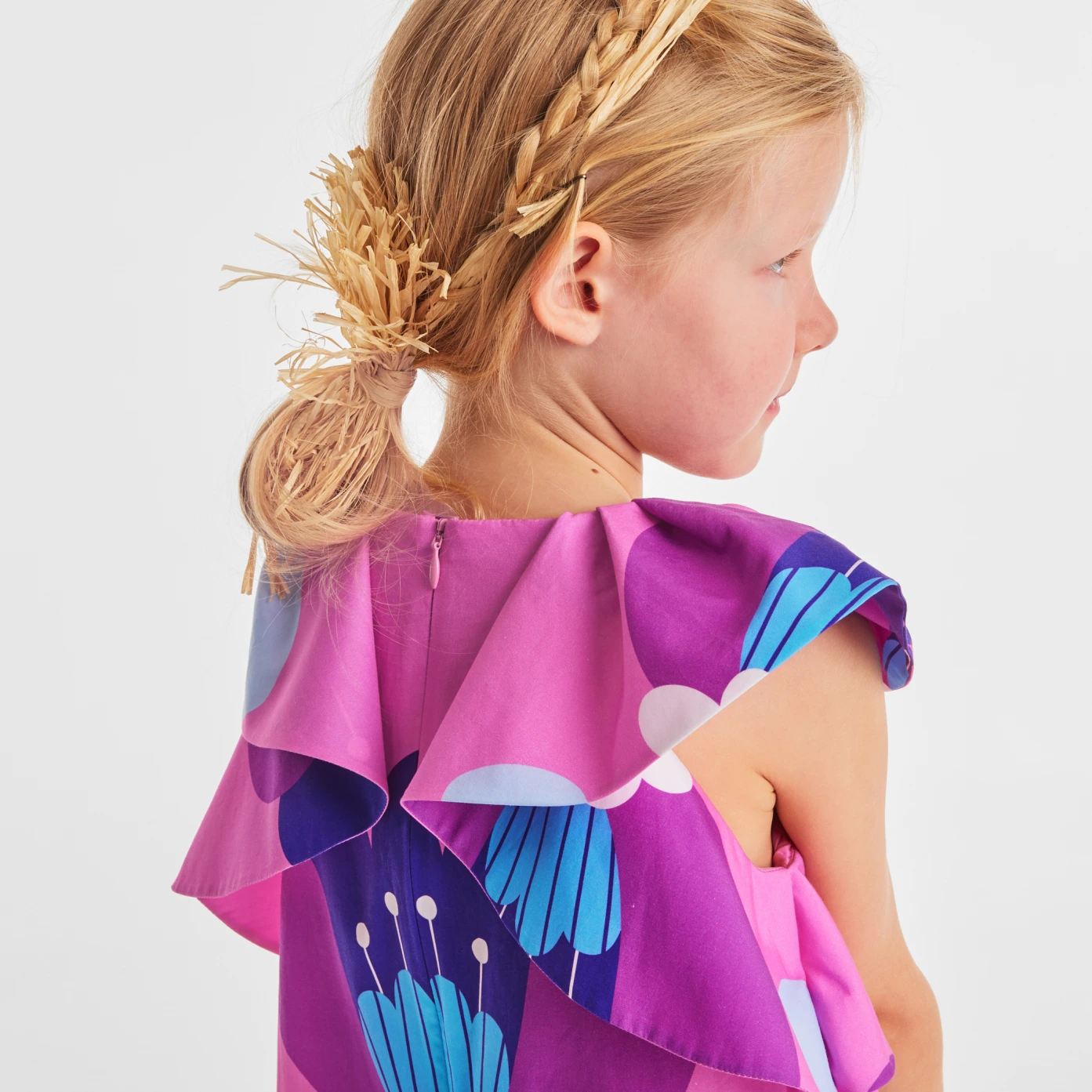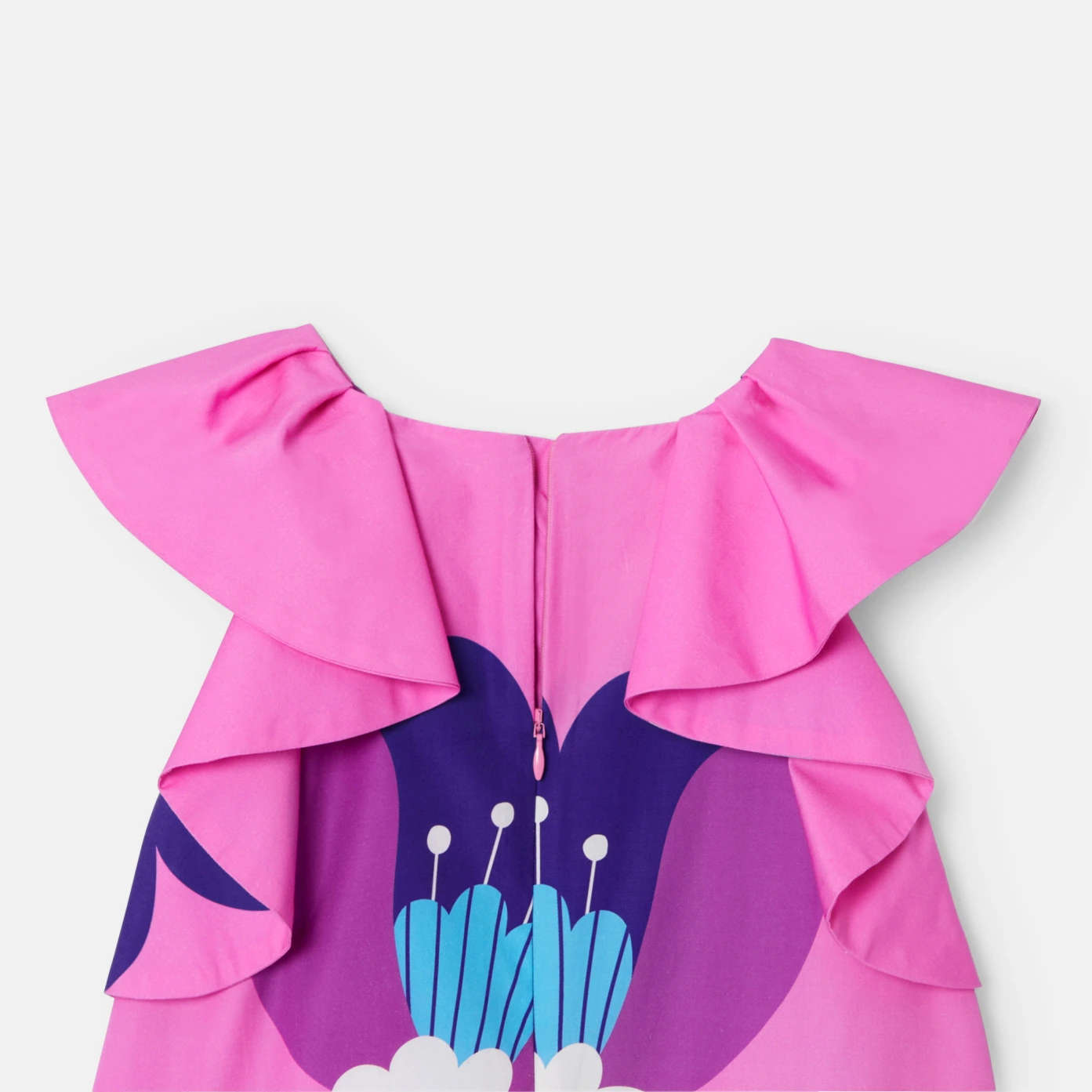 這款女童洋裝採用寬大的荷葉邊袖孔,具有現代美感,將您帶入一個現代、多彩的世界。採用柔軟纖細府綢製成,印有超大花朵圖案,搭配帽子和涼鞋,盡享夏季。