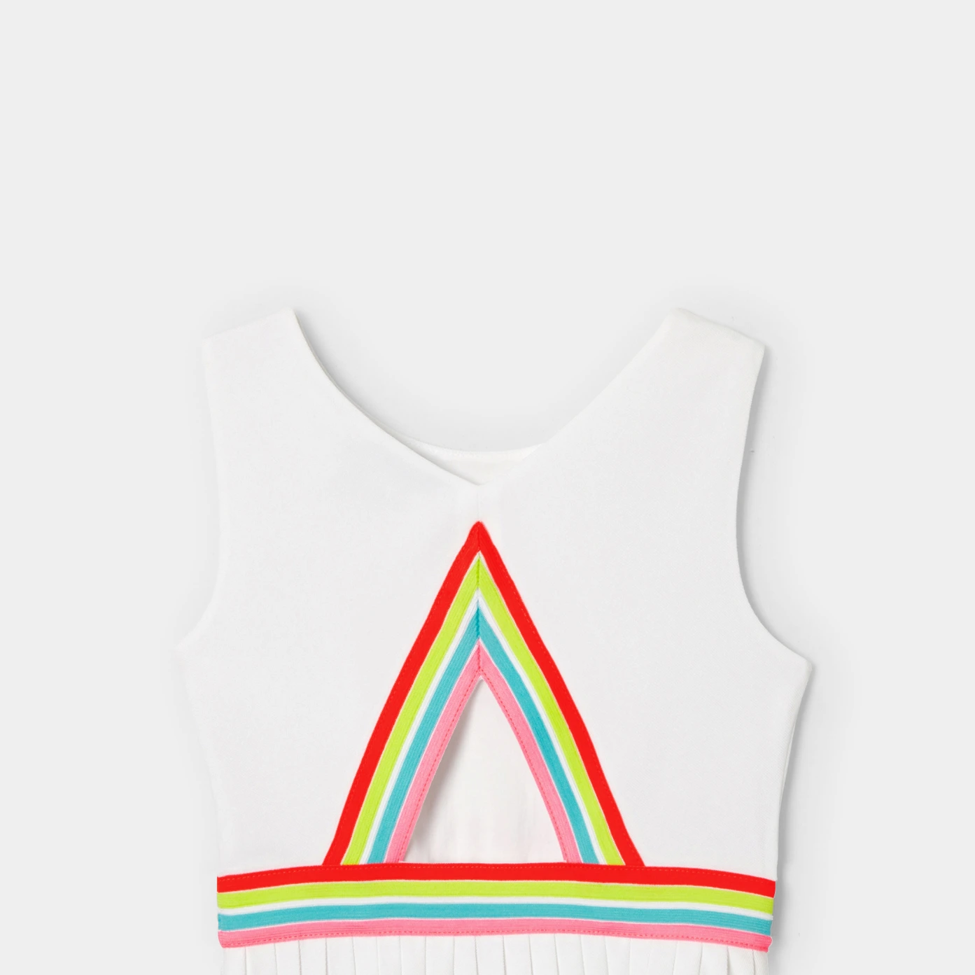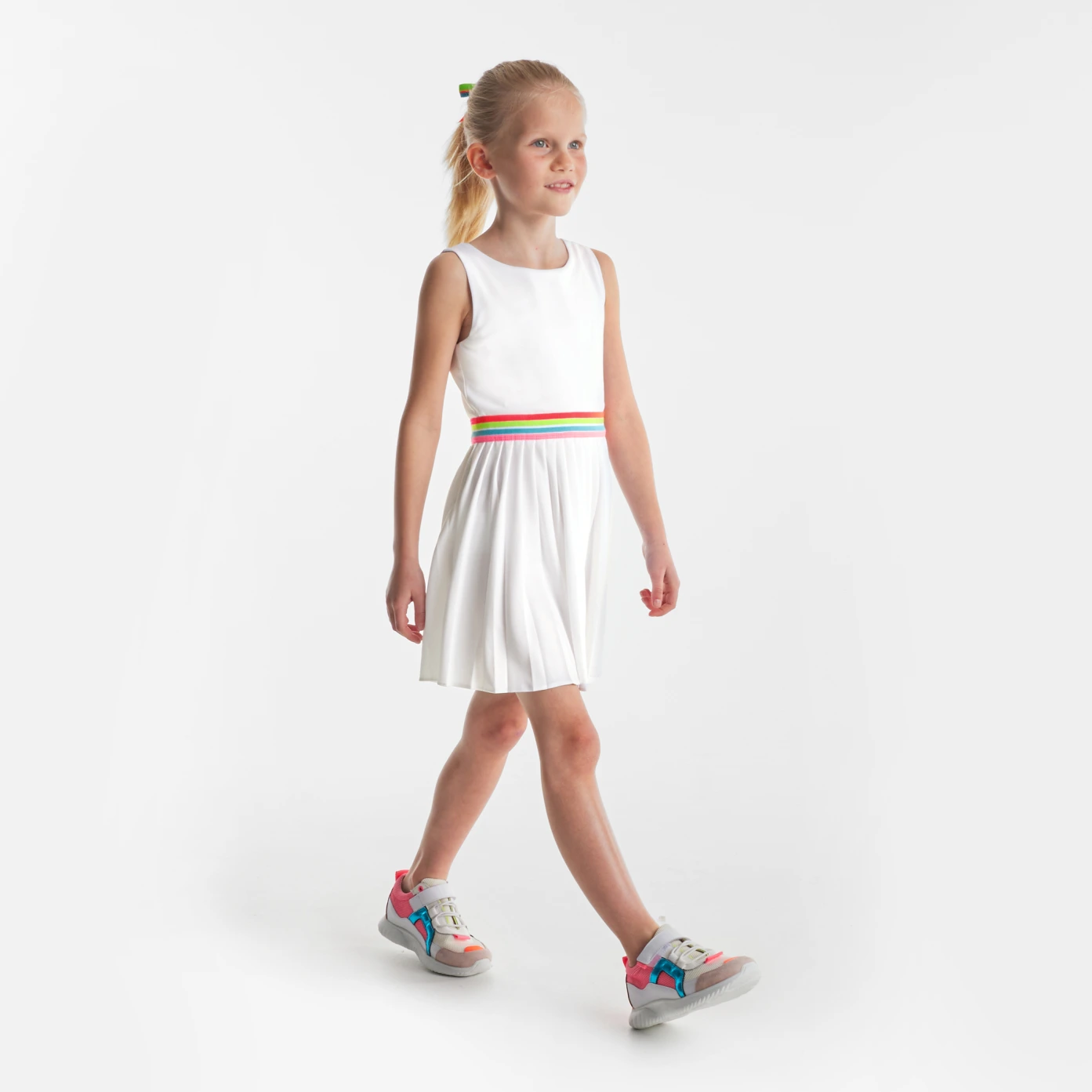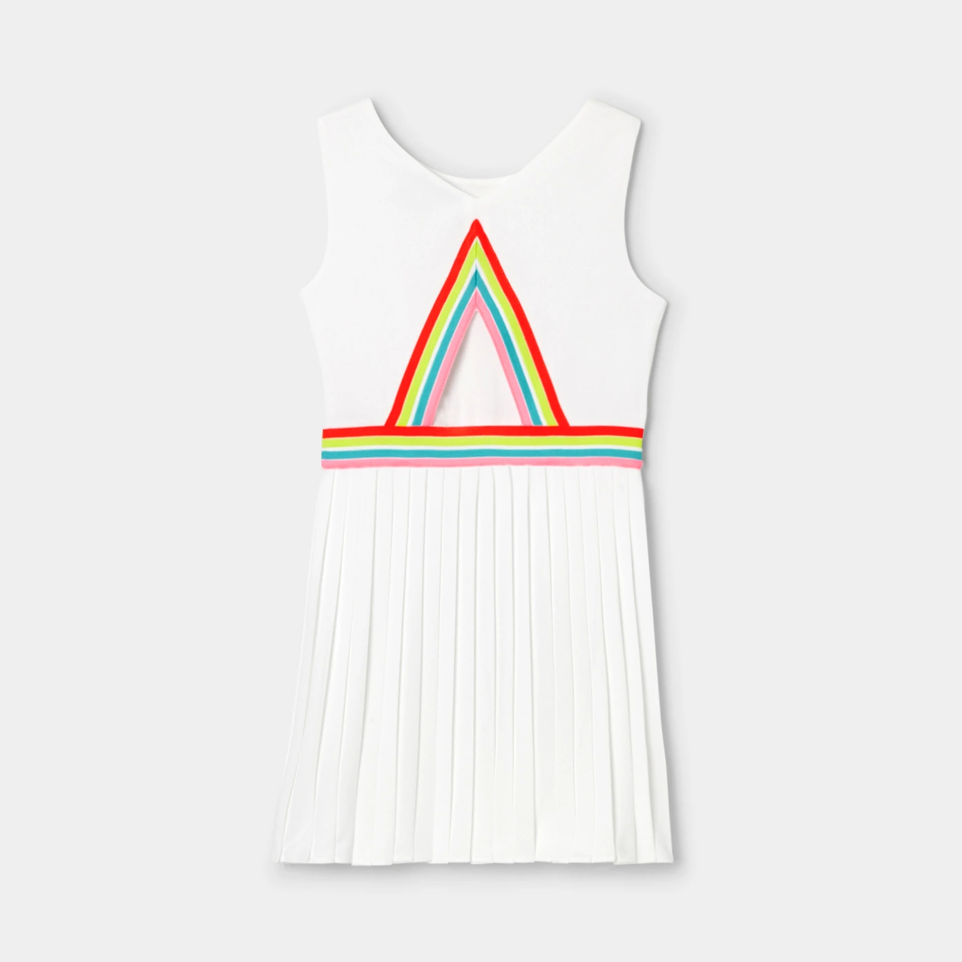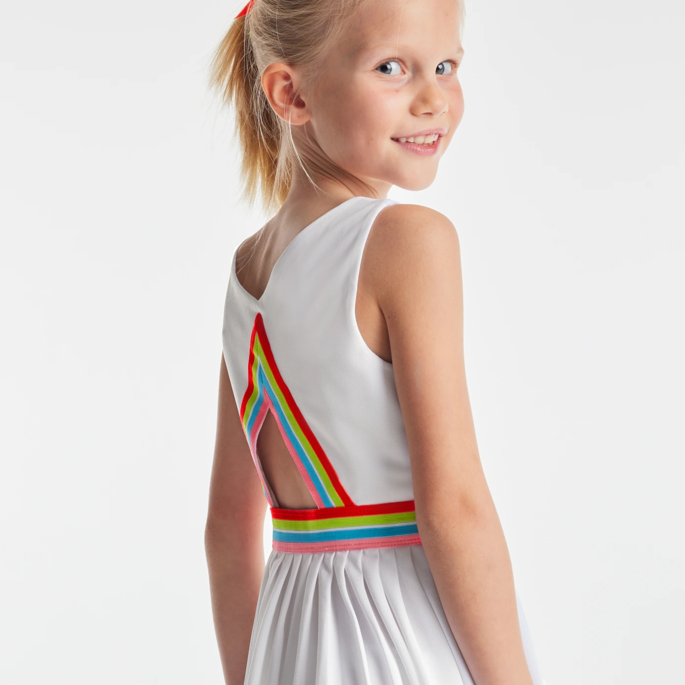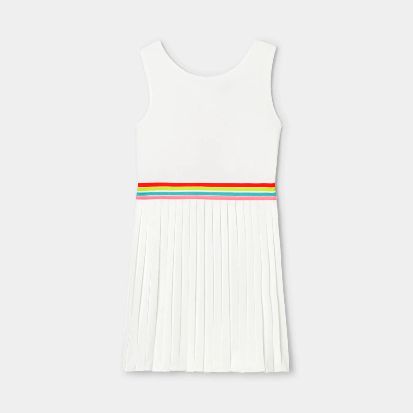 這款女孩洋裝融合了現代網球裙的元素,展現出濃濃的法式優雅。洋裝採用棉質小圓網眼布料製成,配有條紋彈性腰部、露背設計和百褶裙擺,將運動風與時尚感完美結合,適合在夏天穿著,讓女孩們在炎熱季節中依然能夠時尚又舒適