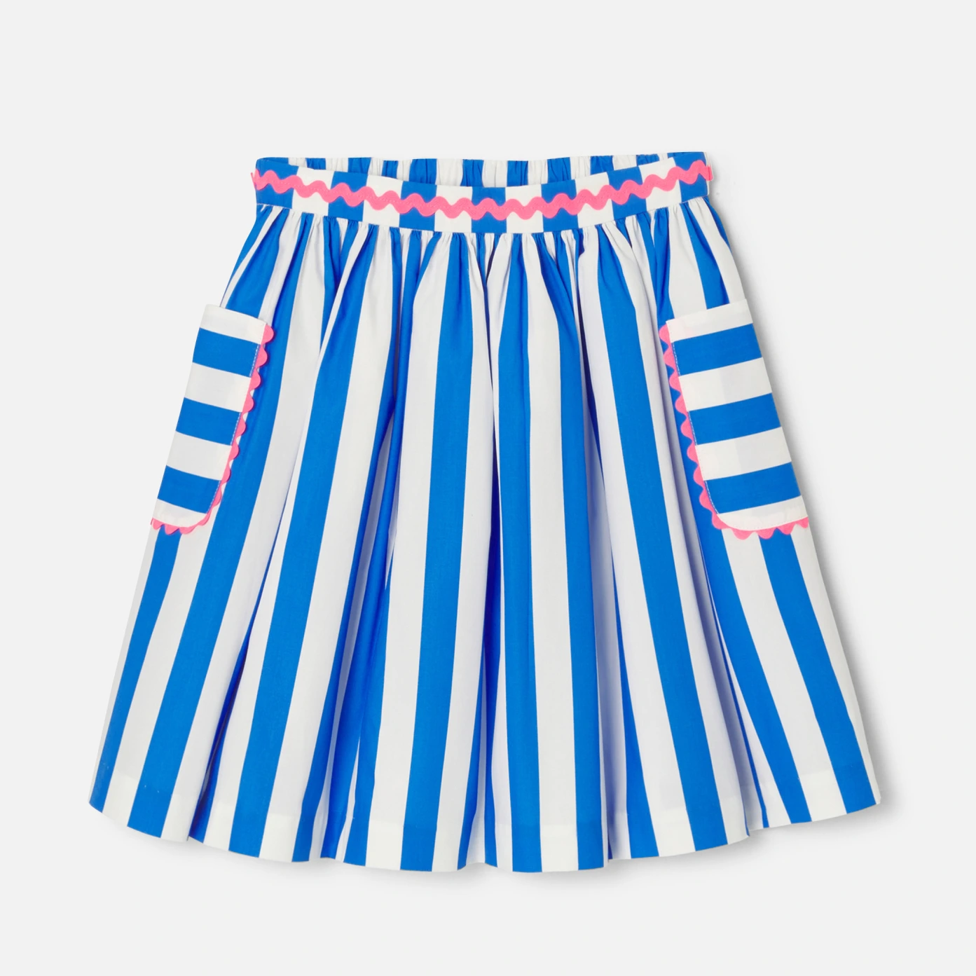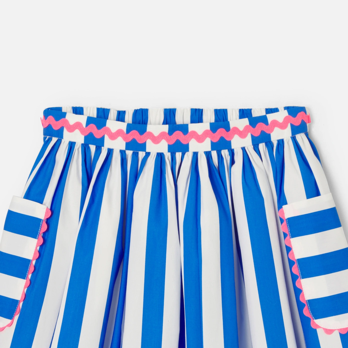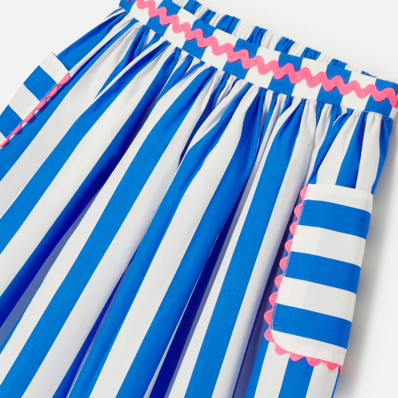 慵懶又優雅的「French Riviera Style」,這款女孩裙子有著細緻的觸感和精心的裝飾。採用棉質斜紋布,超大條紋、貼袋口袋和亮色織帶,適合重要場合穿著。
