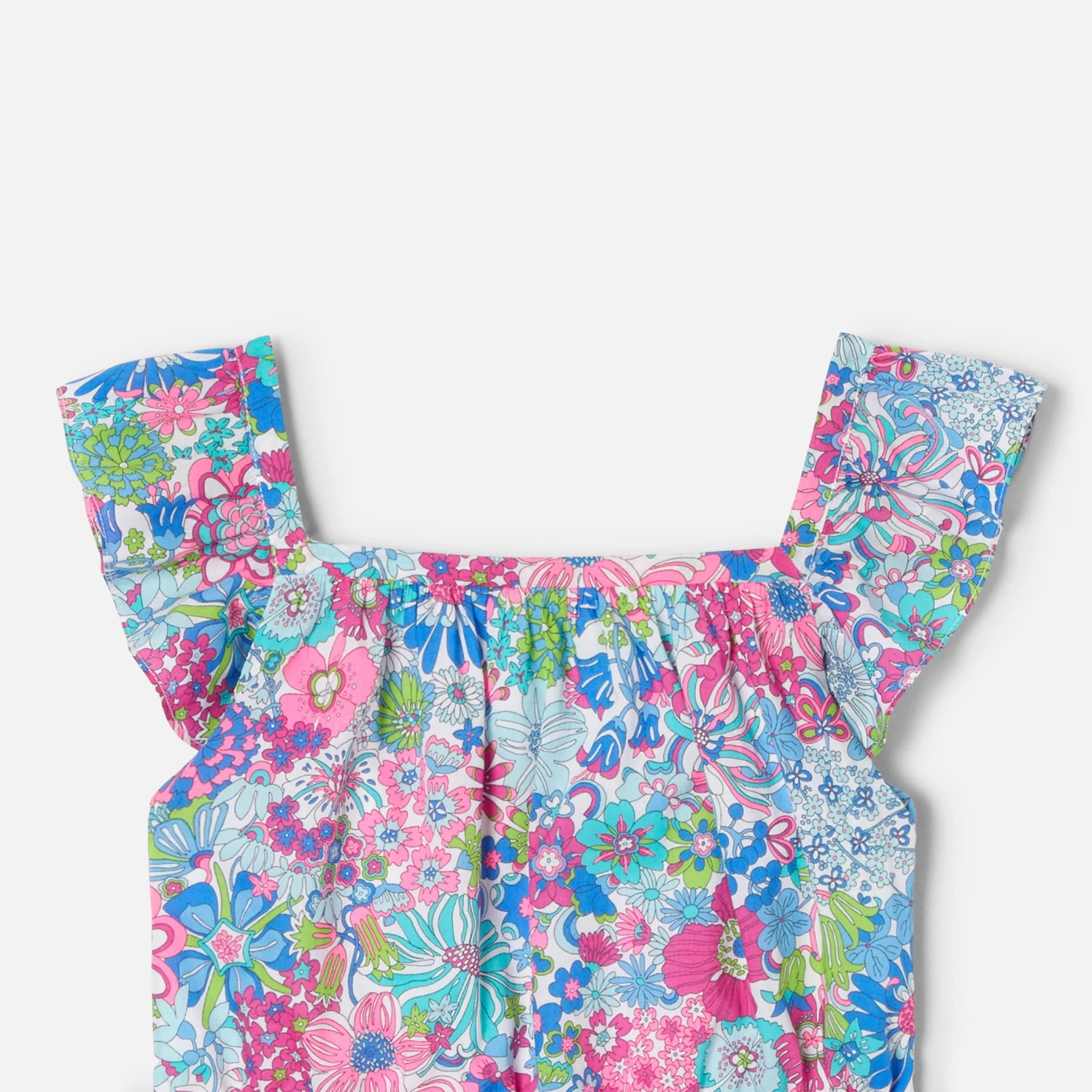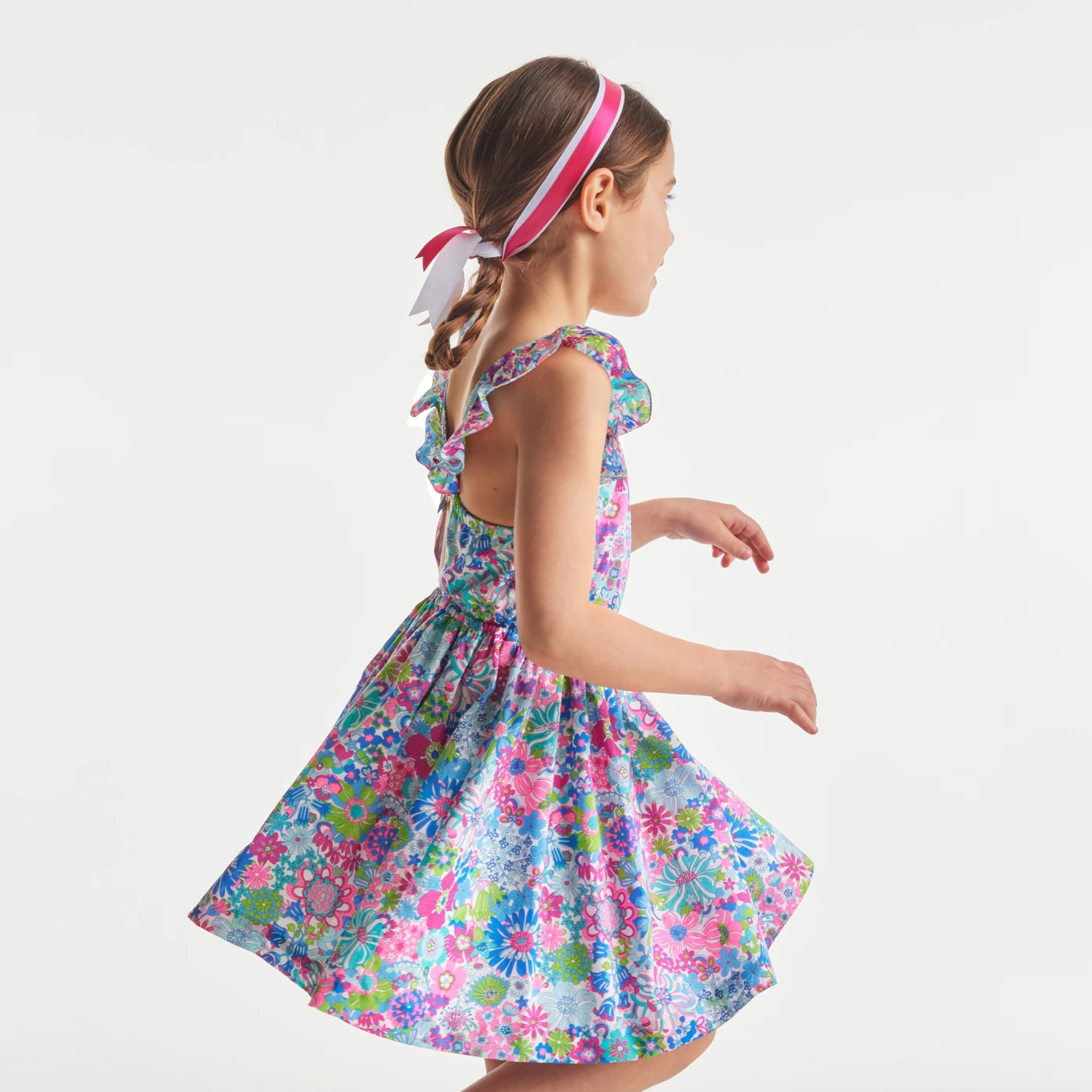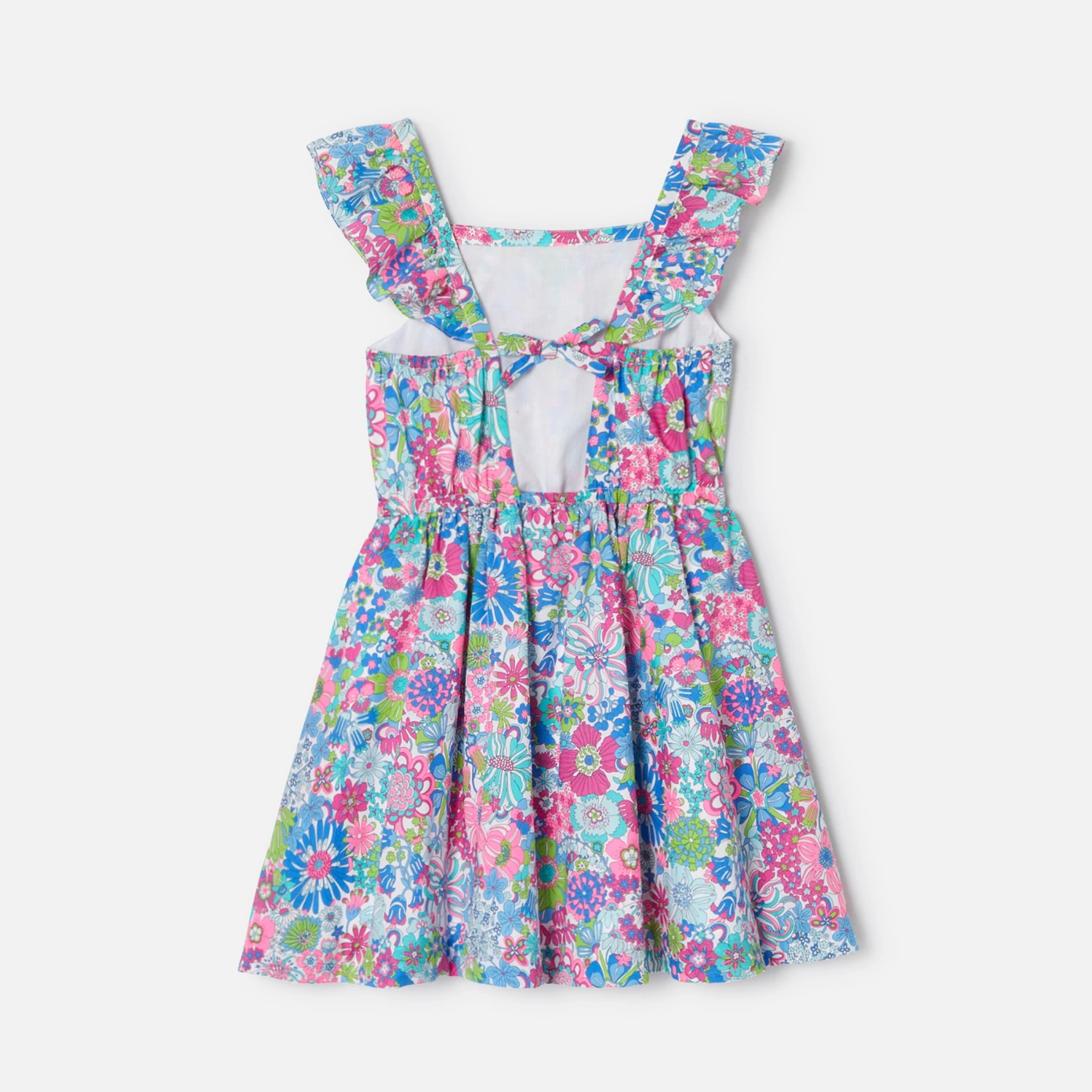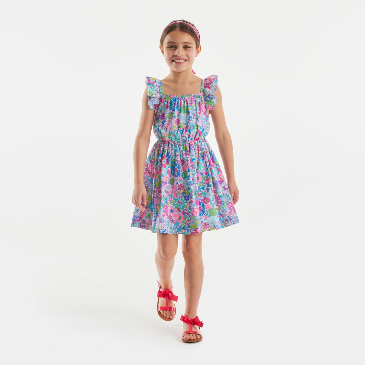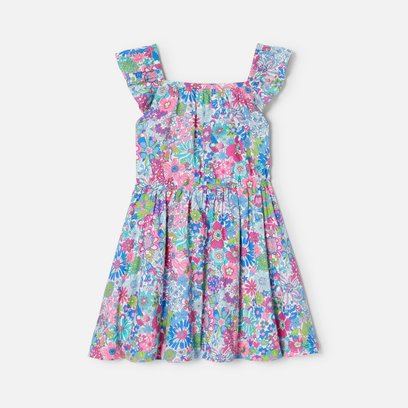 這款女孩洋裝採用Liberty花布製成,讓您沉浸在充滿喜悅和色彩的世界中。帶有荷葉邊肩帶、露背和抽皺細褶腰部,搭配帽子和涼鞋,非常適合度假穿搭。