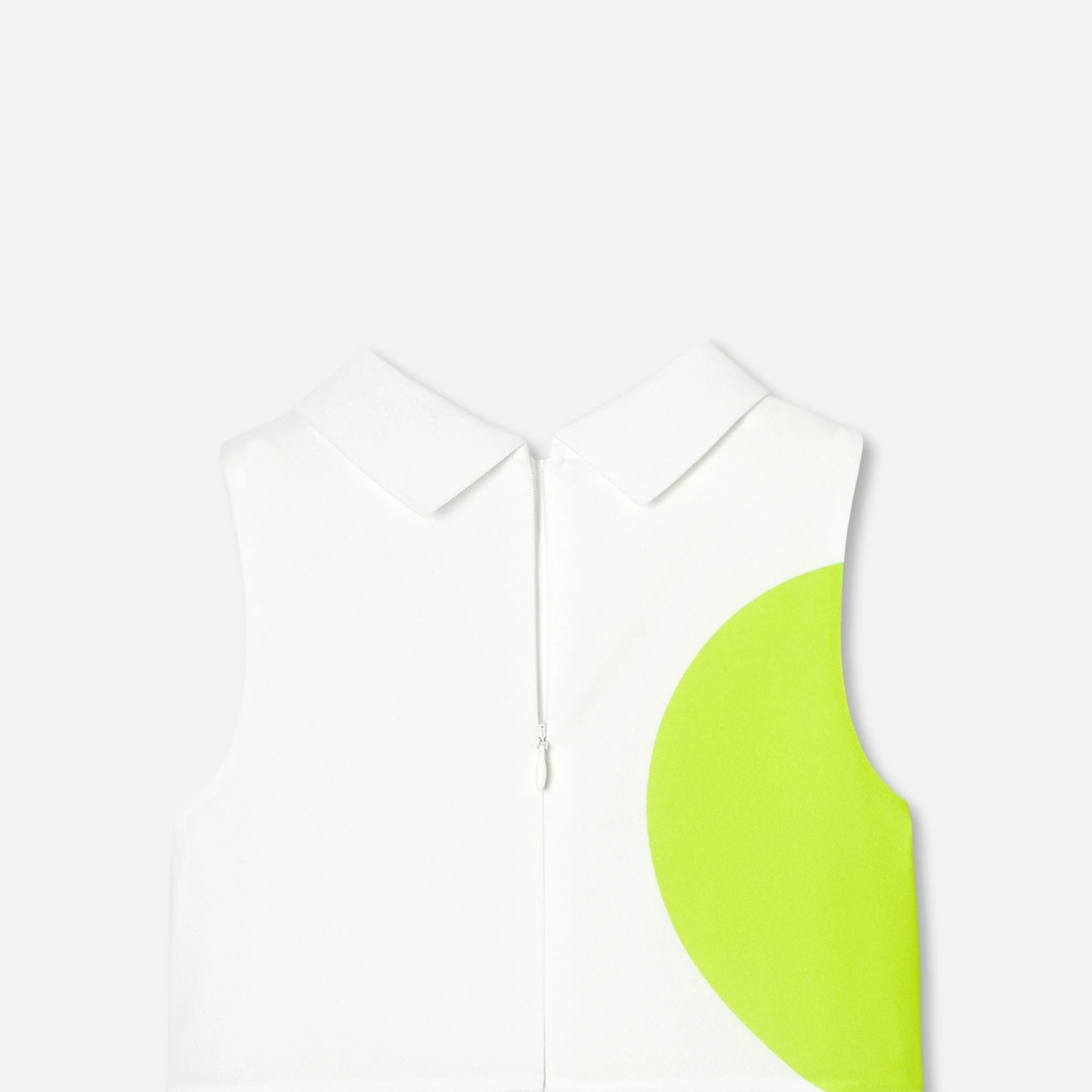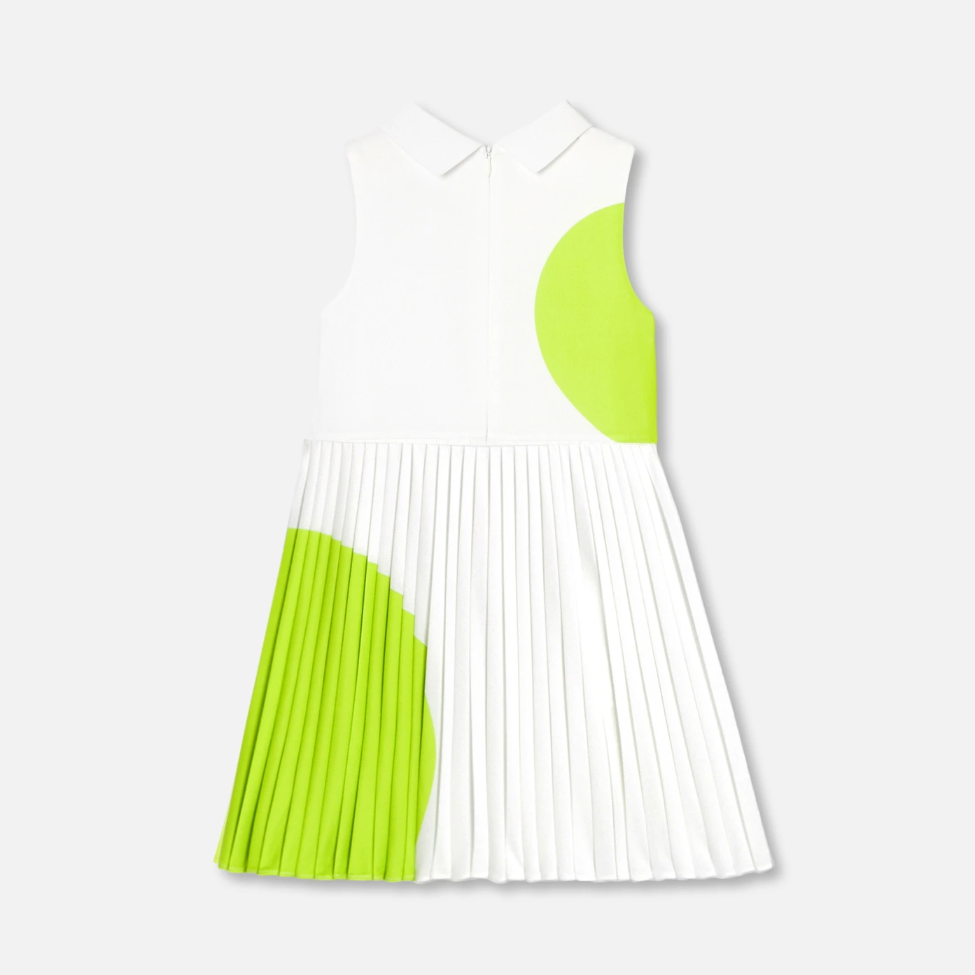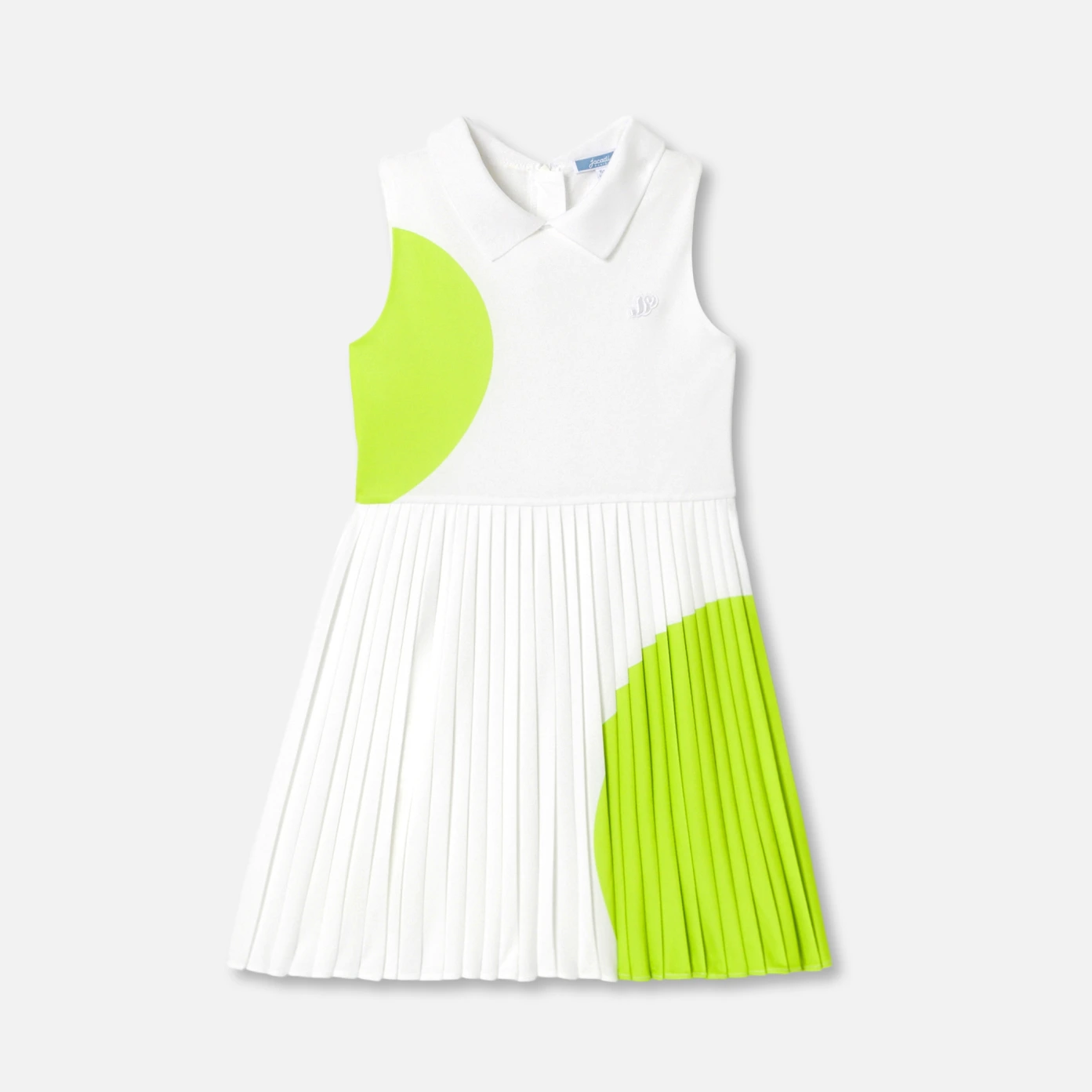 這款運動時尚的連身裙,採用科技珠地網眼針織布,印有大圓點色塊圖案、馬球領和褶襉裙襬更增添亮點,適合在季節開始時搭配運動鞋和開衫穿著。