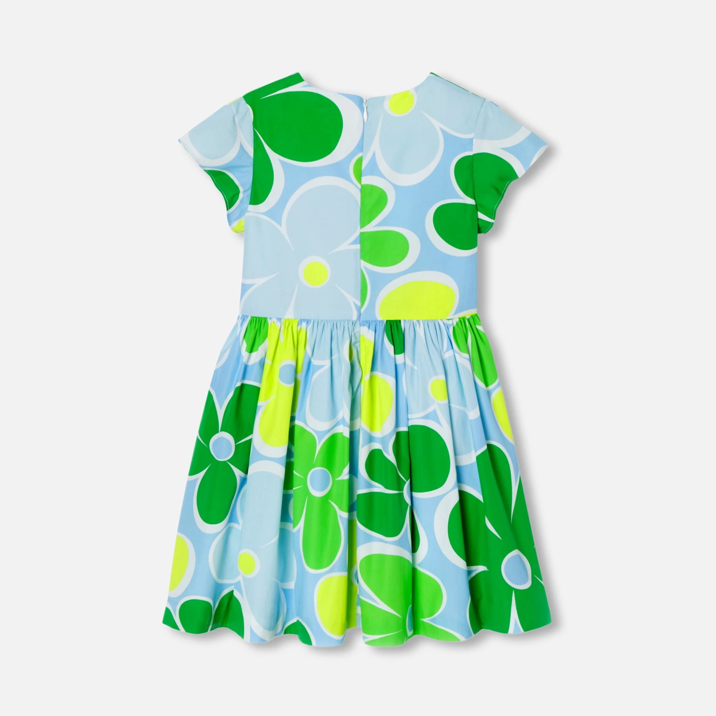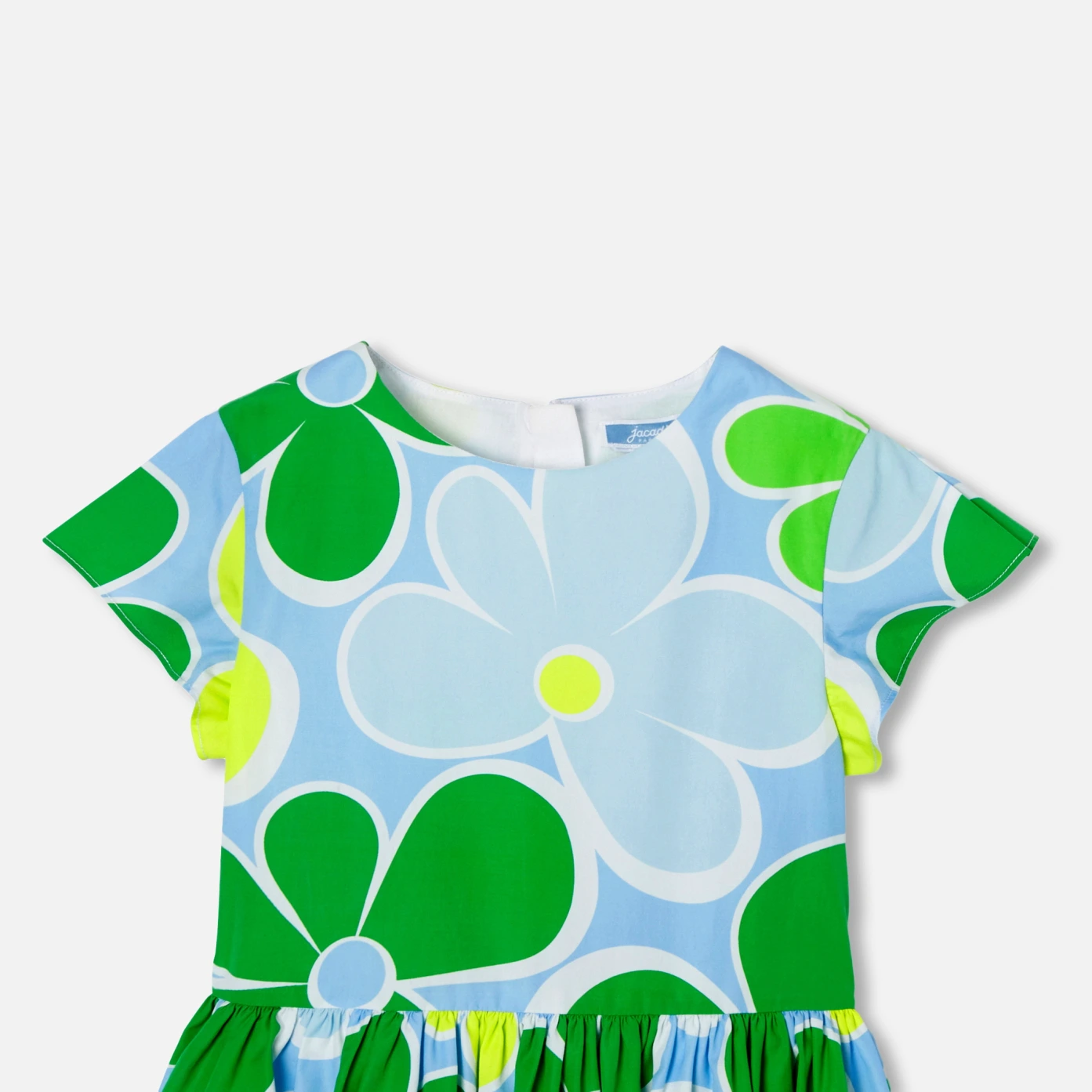 這款女孩洋裝將您帶入一個現代而多彩的世界,非常適合的夏季穿著,採用棉府綢製成,飾有Jacadi 獨有的超大花卉印花,搭配螢光黃開衫和平底芭蕾舞鞋,打造別緻的都會造型。