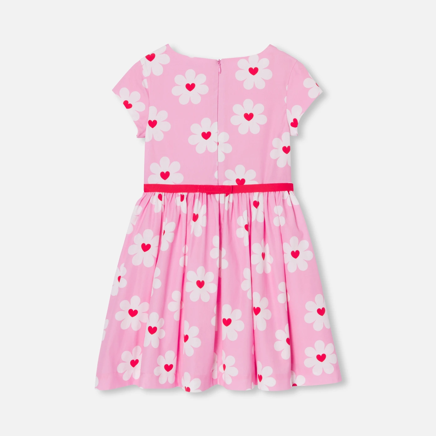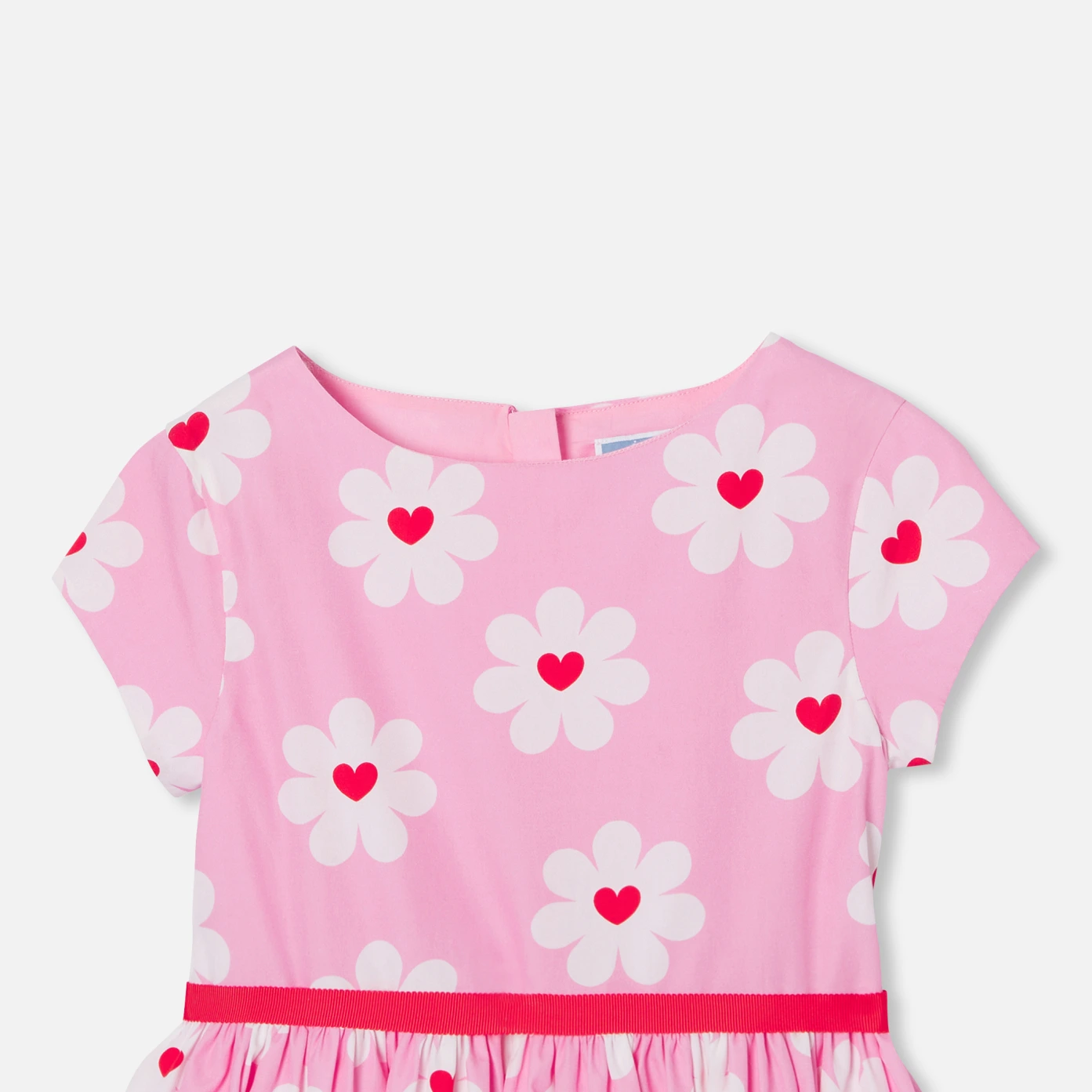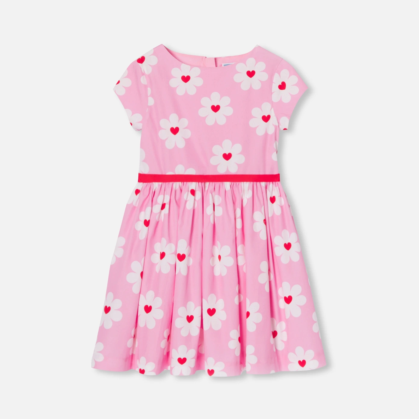 這款女孩洋裝以可愛的心形花卉圖案、柔軟輕盈的府綢和復古別緻的剪裁,無論是慶祝的場合還是日常穿搭都能展現出完美魅力。