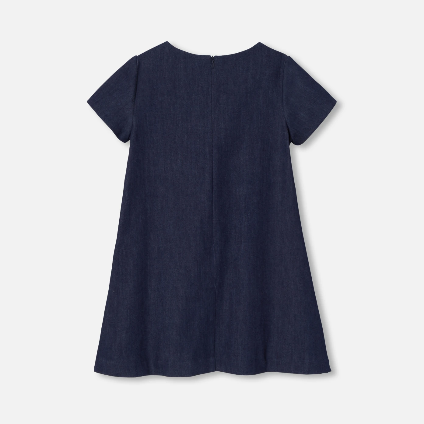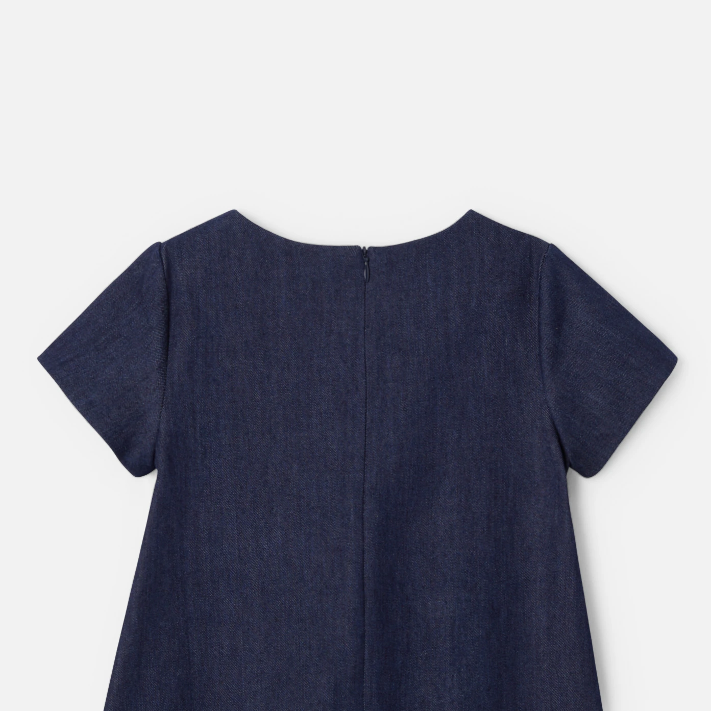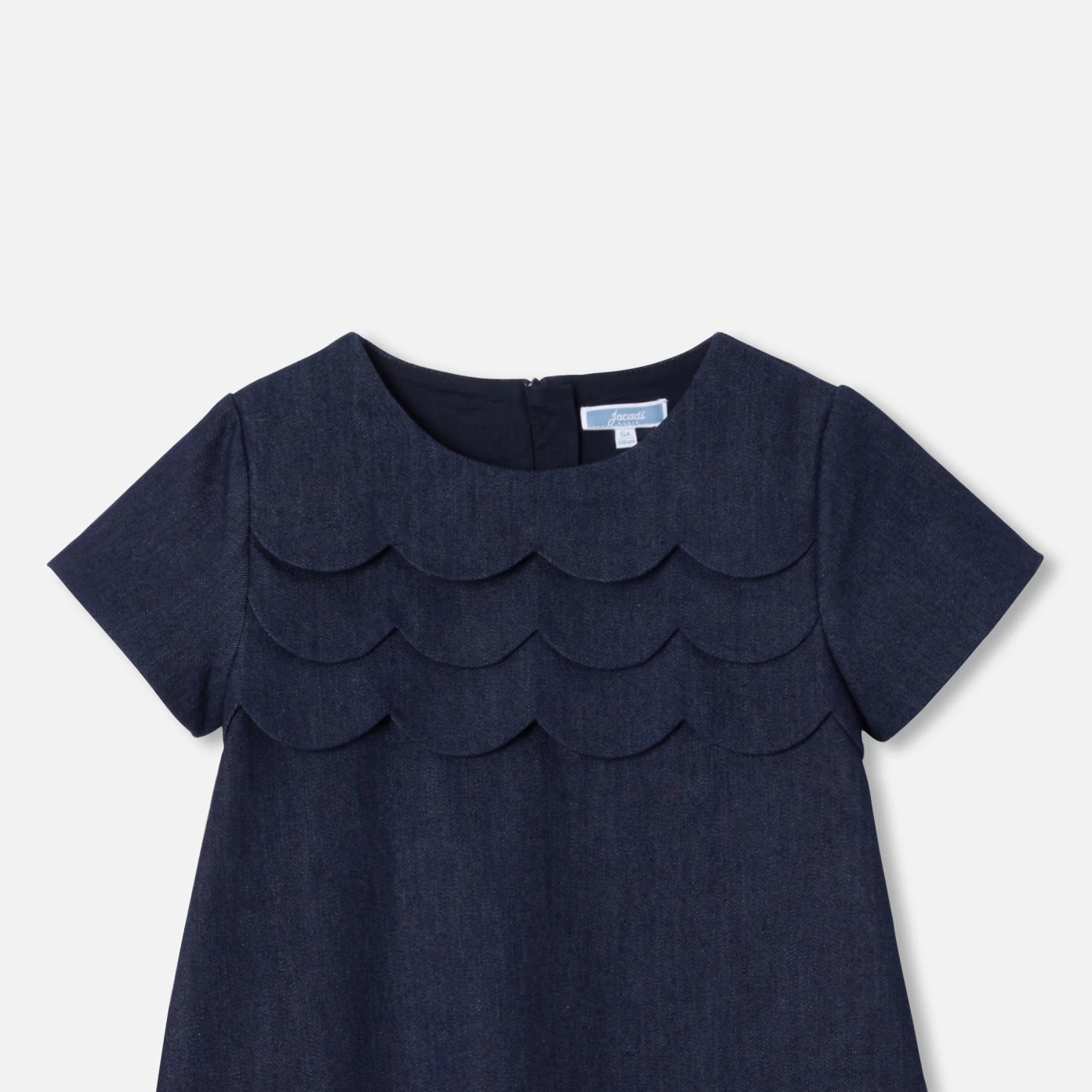 這款女童牛仔洋裝充滿了60年代的復古風格。以原色牛仔布製成,短袖與層疊的波浪形設計為這件洋裝增添高級訂製感。搭配彩色褲襪、英倫風外套與平底鞋,可以完美展現出復古雅緻的風格。